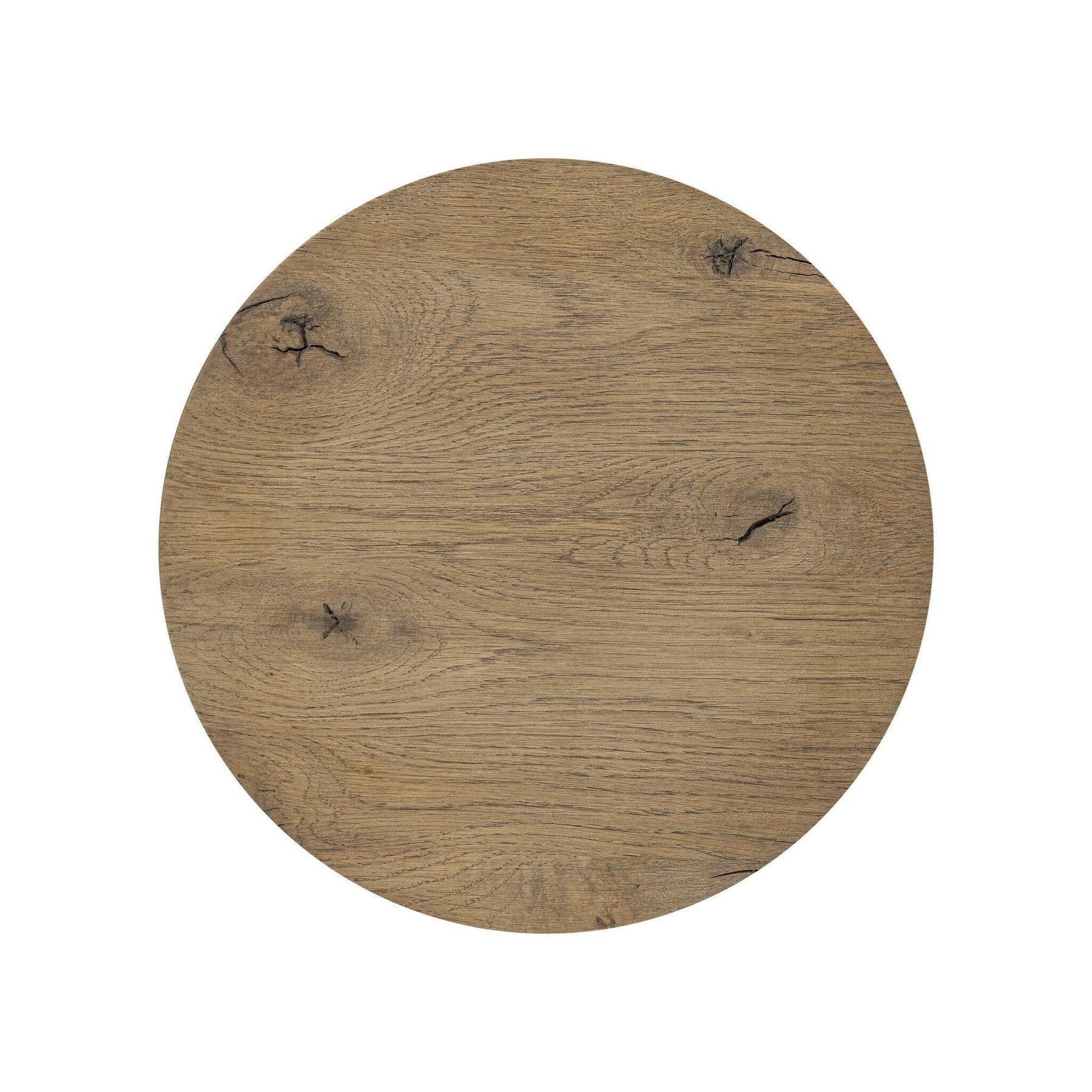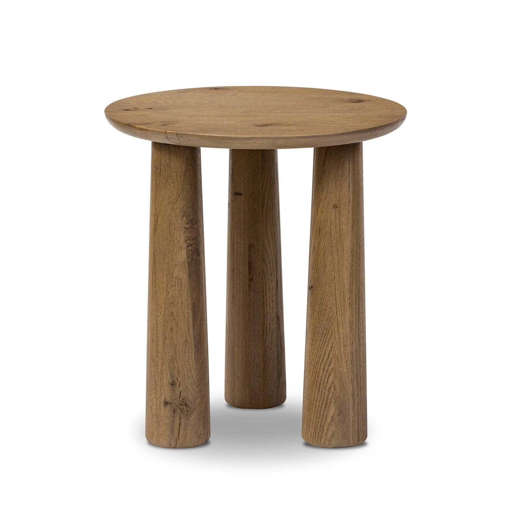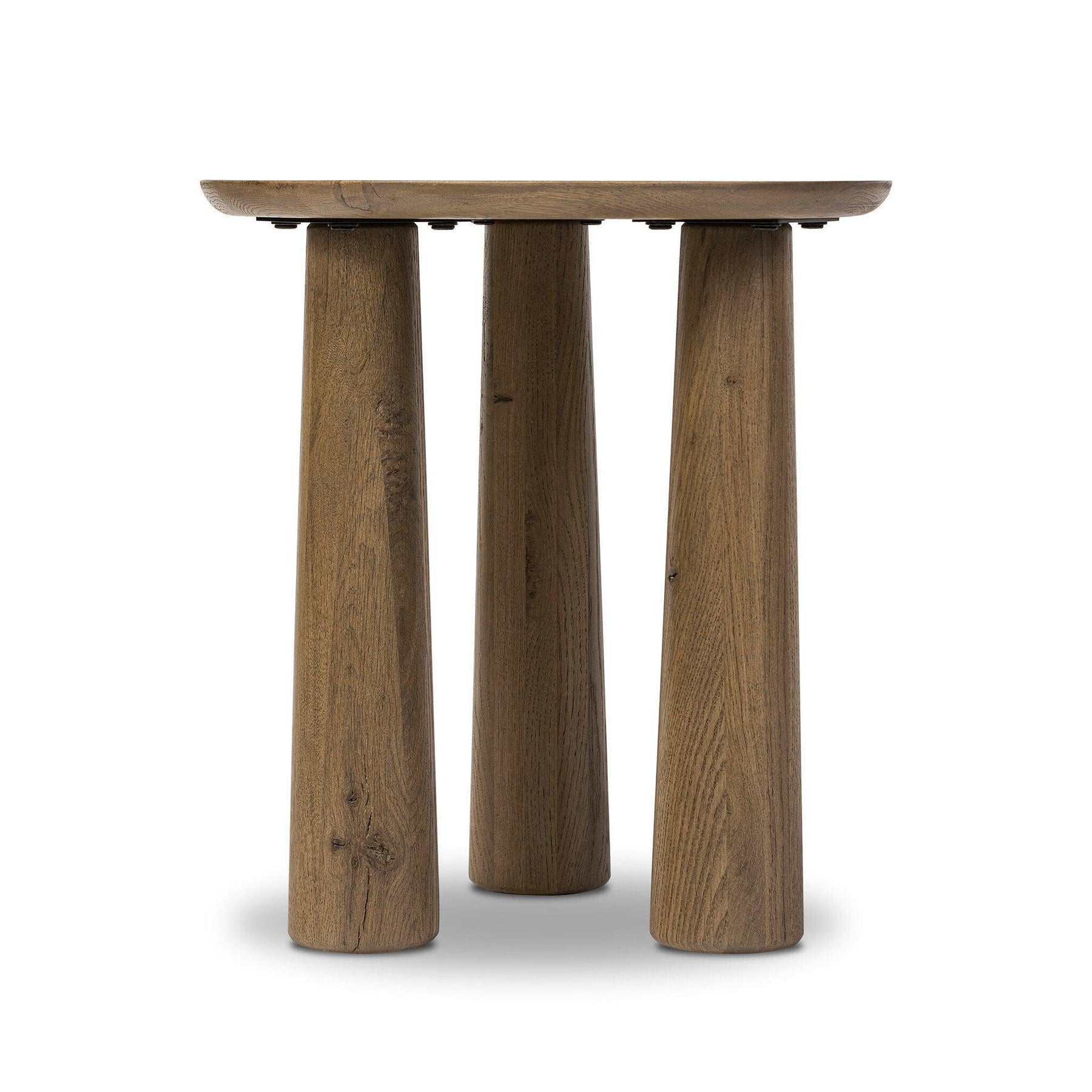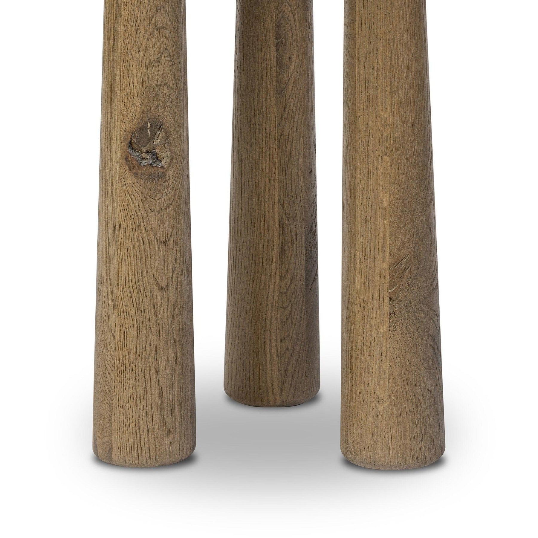 A chamfered top and tapered legs define the artisanship of this tall three-leg end table. Crafted from drifted oak veneer its natural texture and clean design make a clever addition to any room.