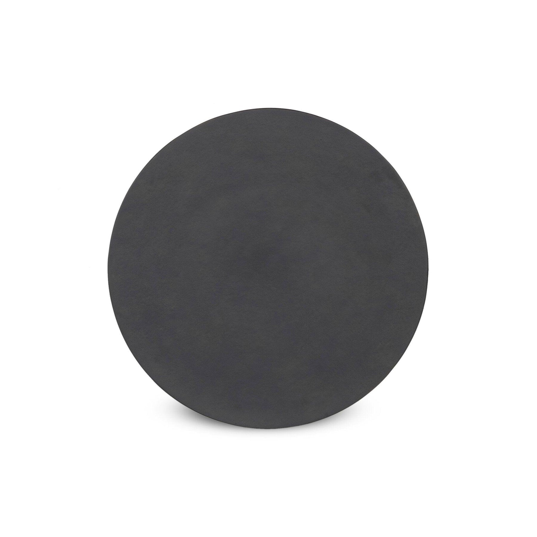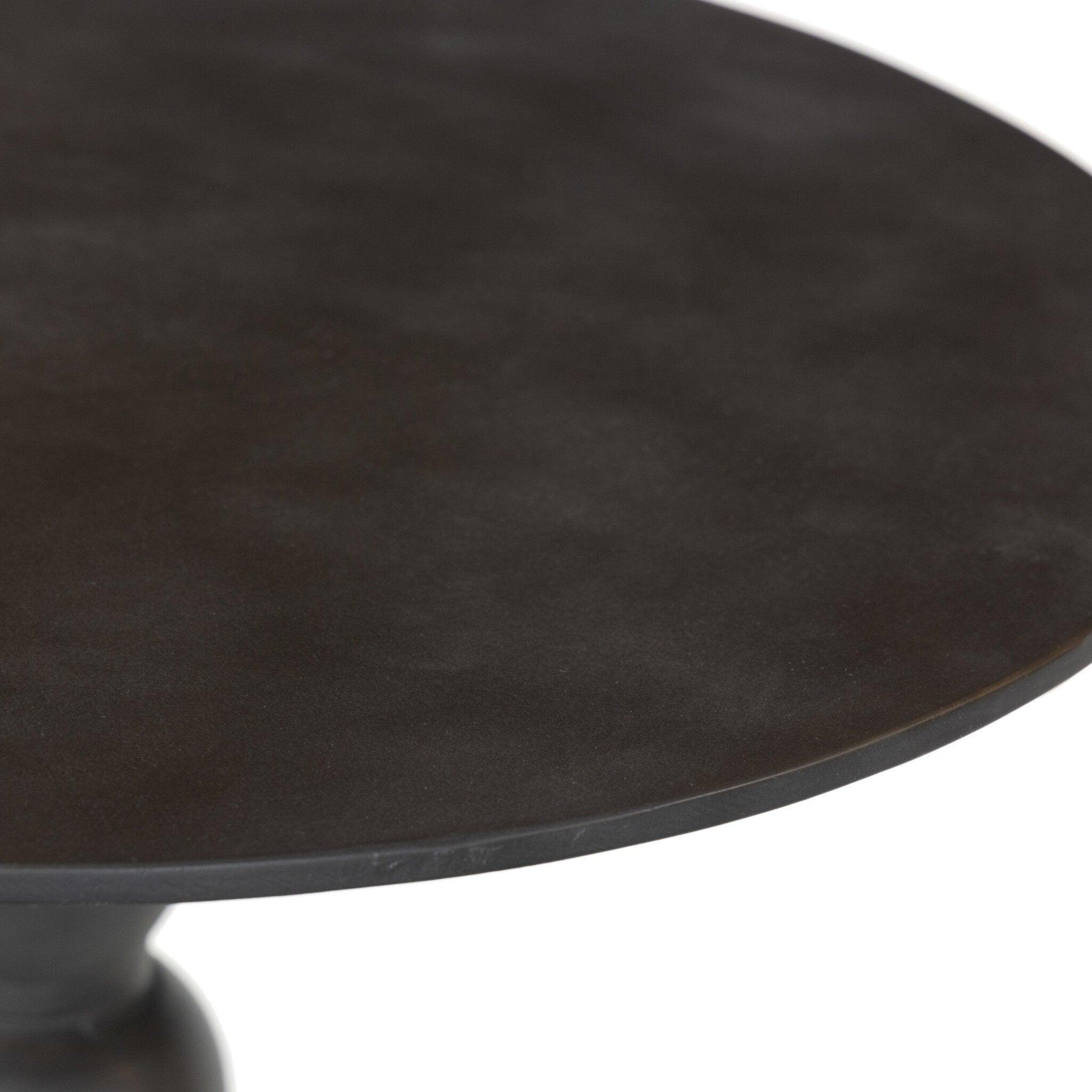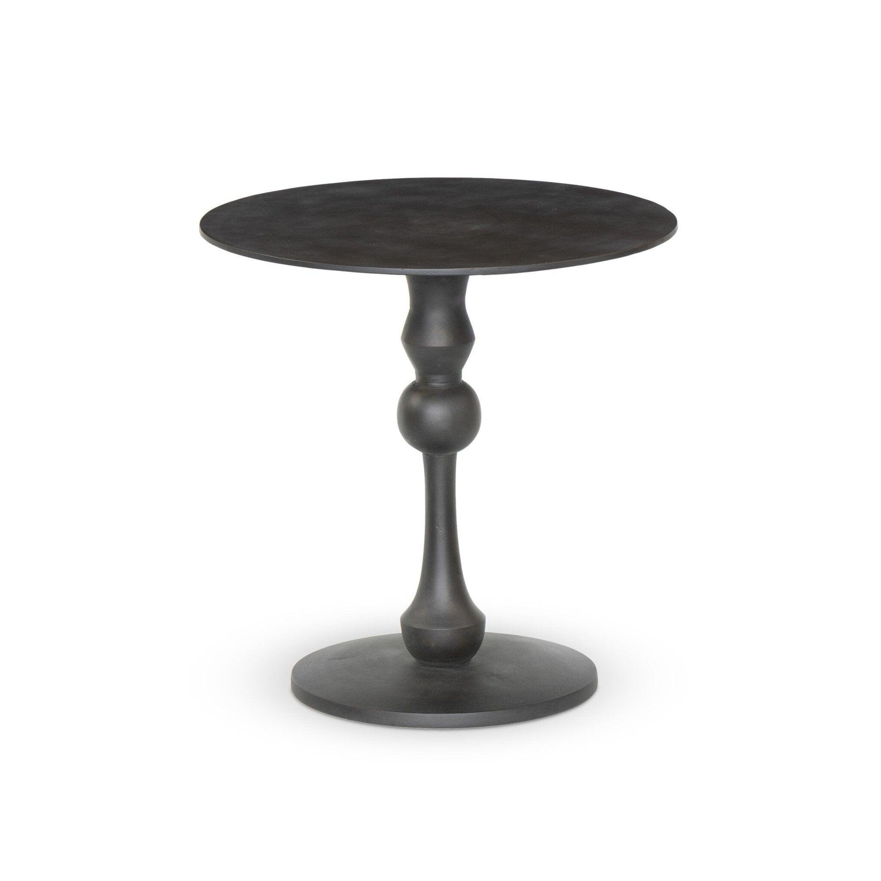 Finished in an antique black raw aluminum forms an end table with a turned geometric design. A sculptural design that adds depth and personality to your space making even the smallest corners feel intentional. A beautiful extra surface indoors and out; if styled outside cover or bring inside during inclement weather and when not in use.