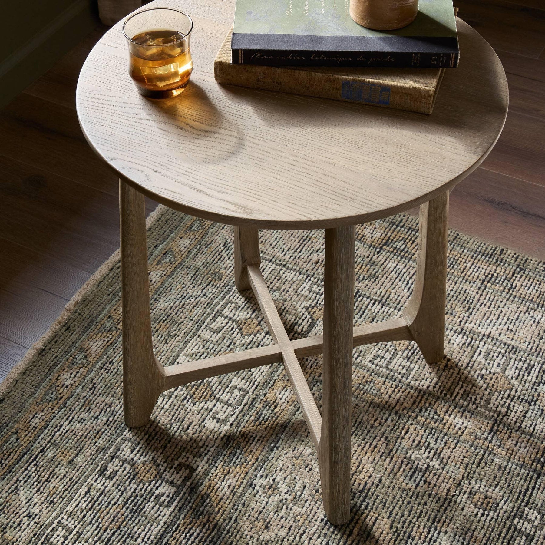 A simple oak table with a warm light finish features subtle leg details for an artisan touch. Perfectly sized to keep your favorite book or drink within reach in any space or style.