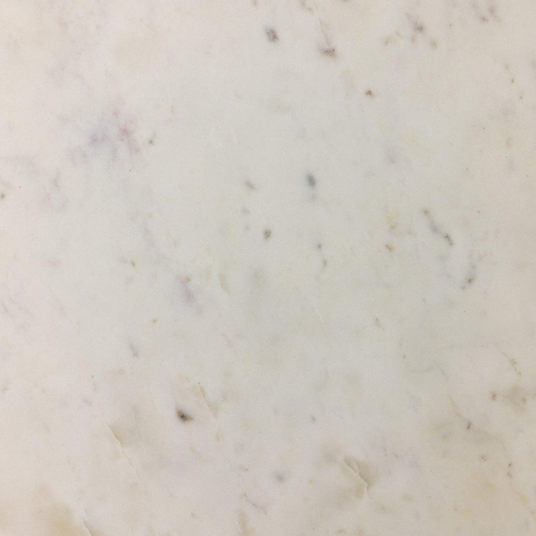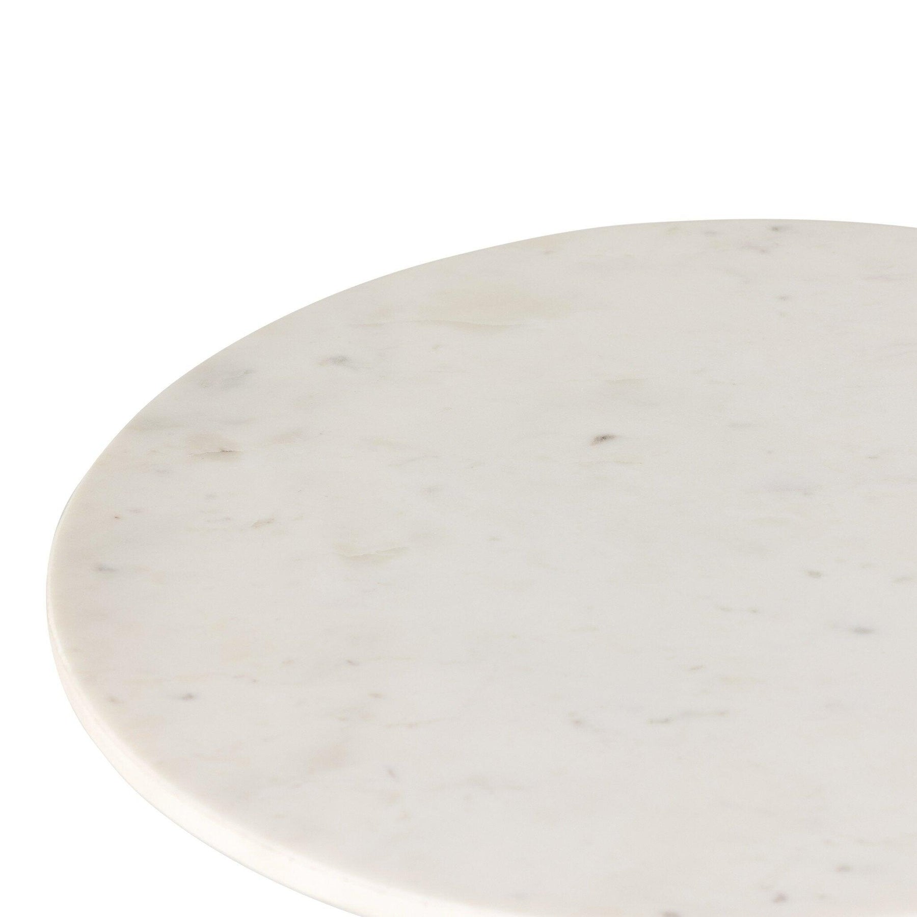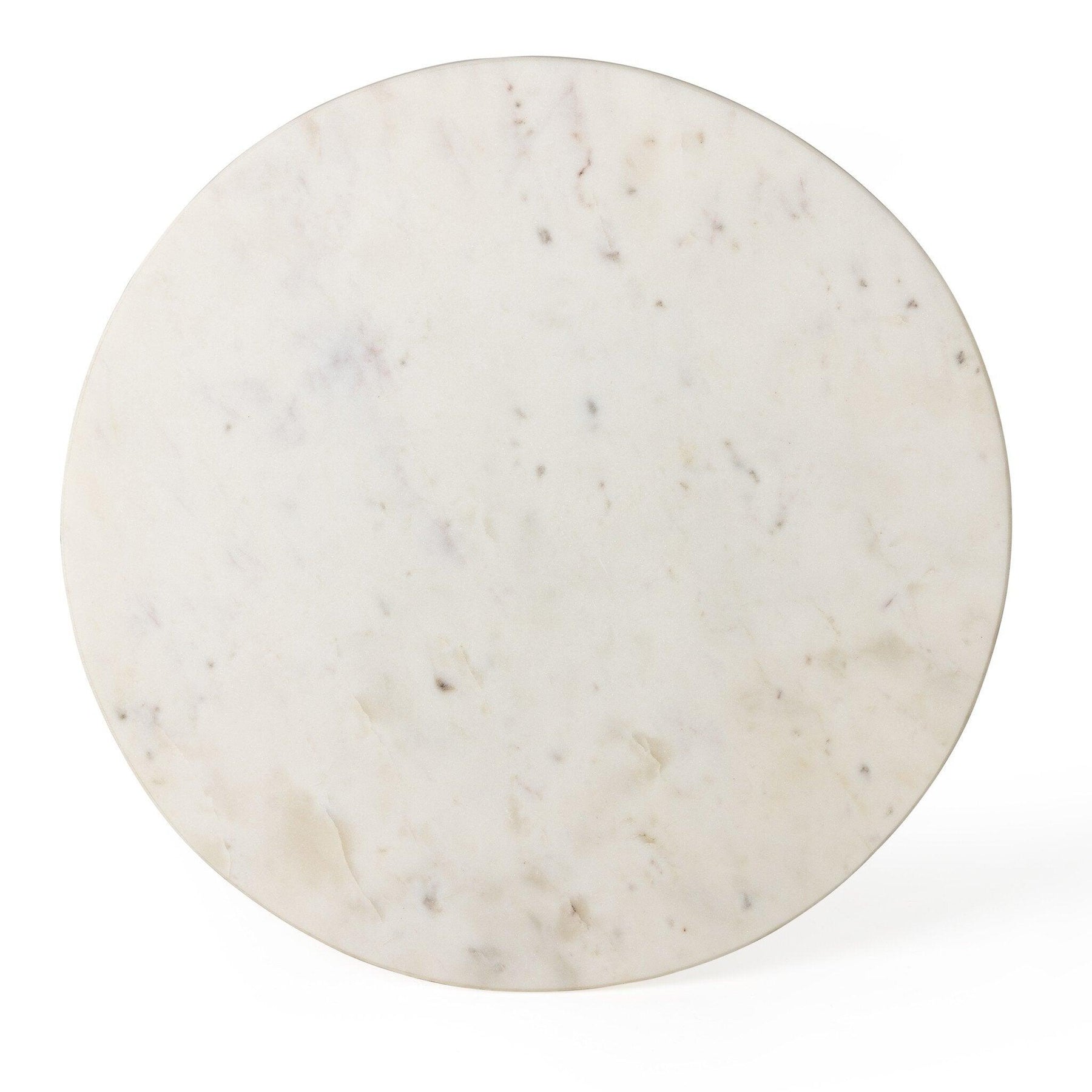 Shape up. Polished white marble forms a stack-style end table of semicircles and squares for a Deco-inspired look with subtle Eighties vibes.