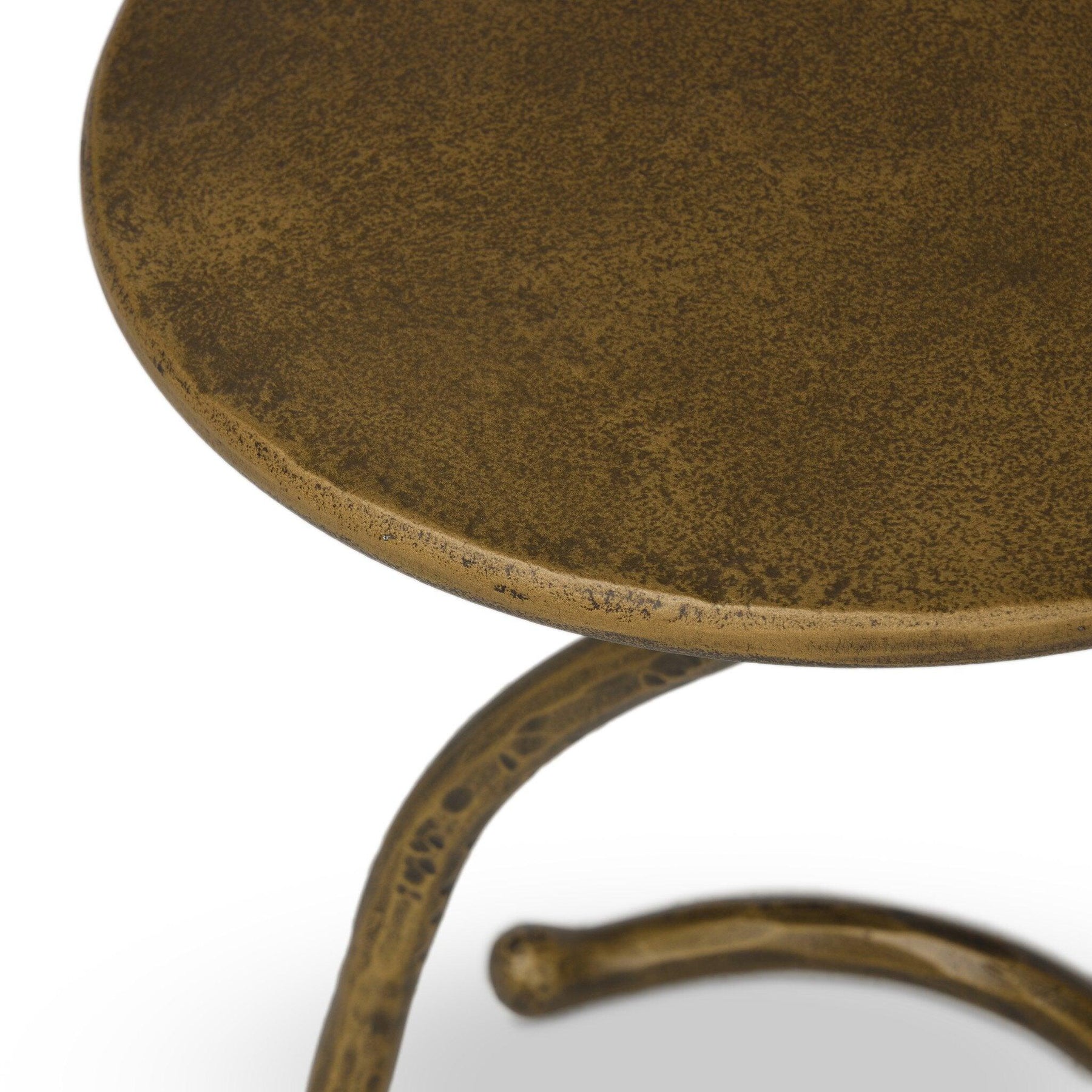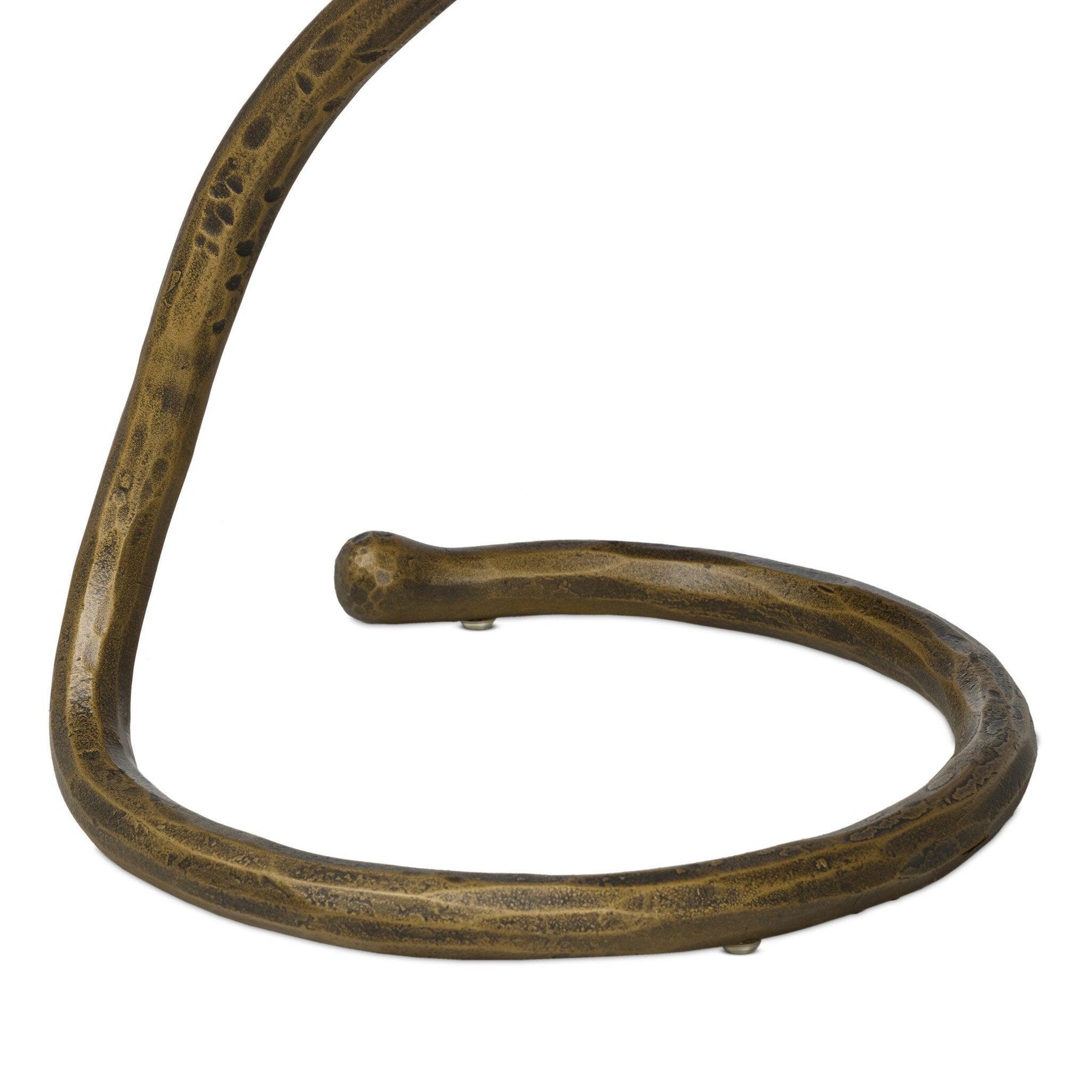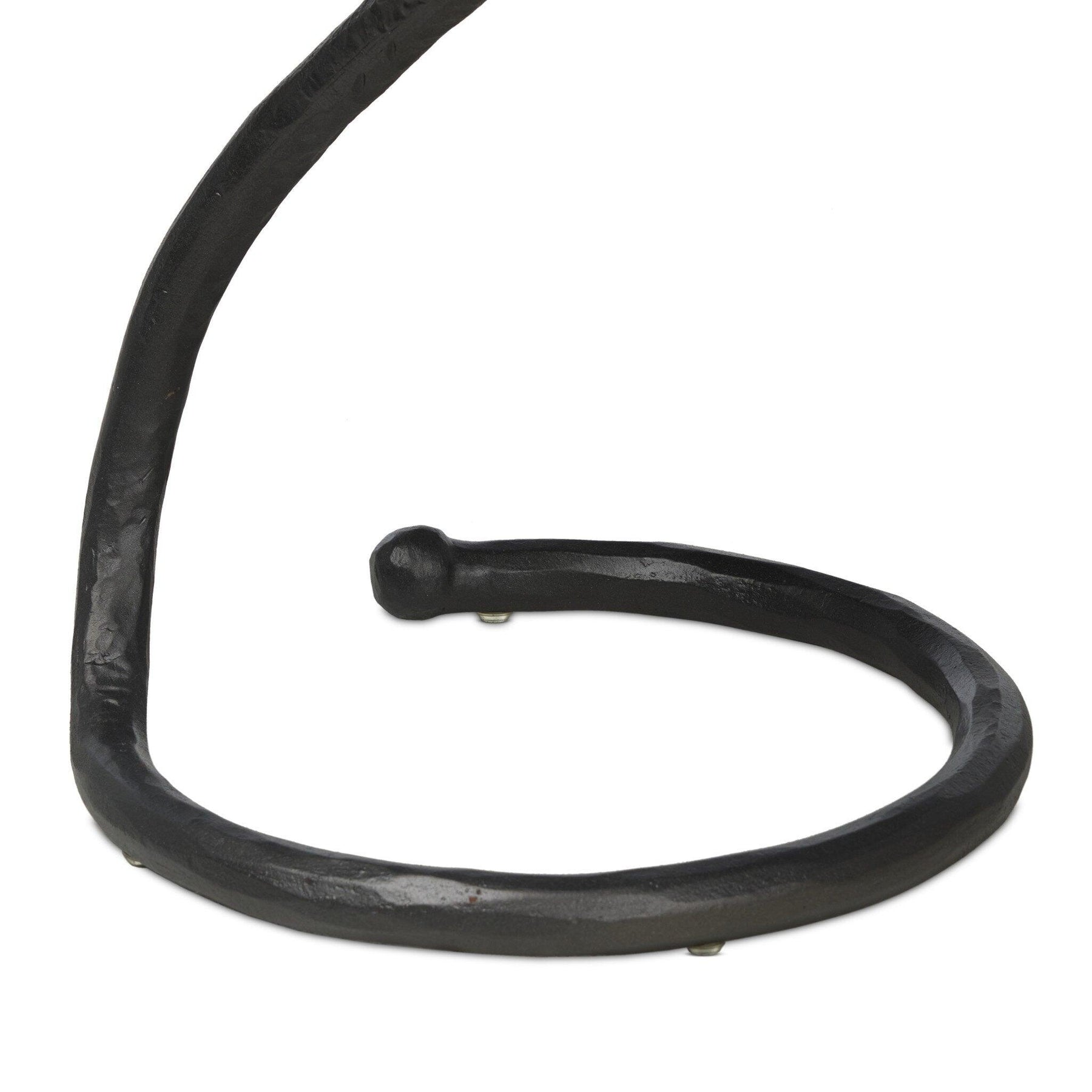 A low-profile end table features a snake-like base finished in a hammered gunmetal. Perfectly sized to keep your favorite drink or book within reach to make your evening ritual a little smoother.