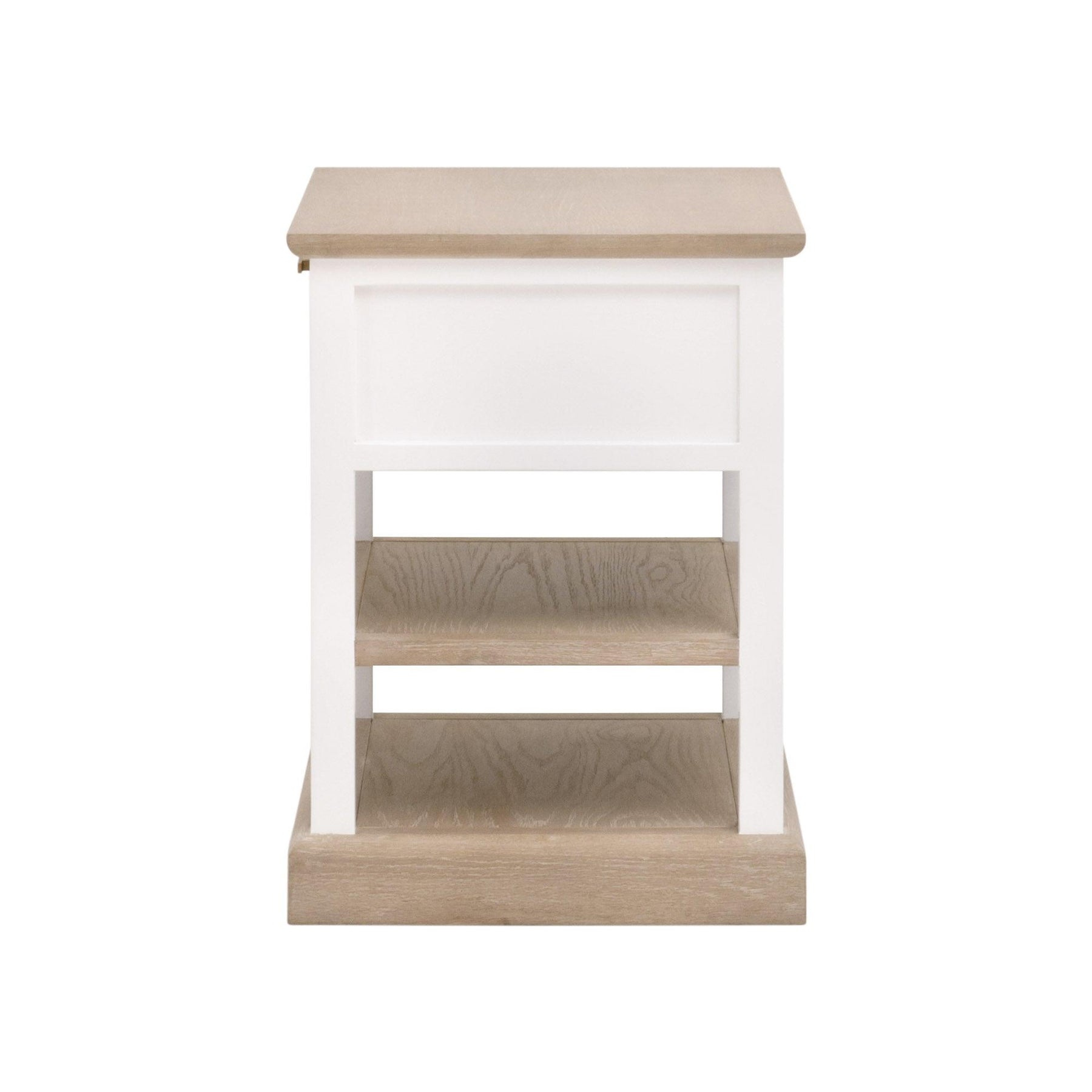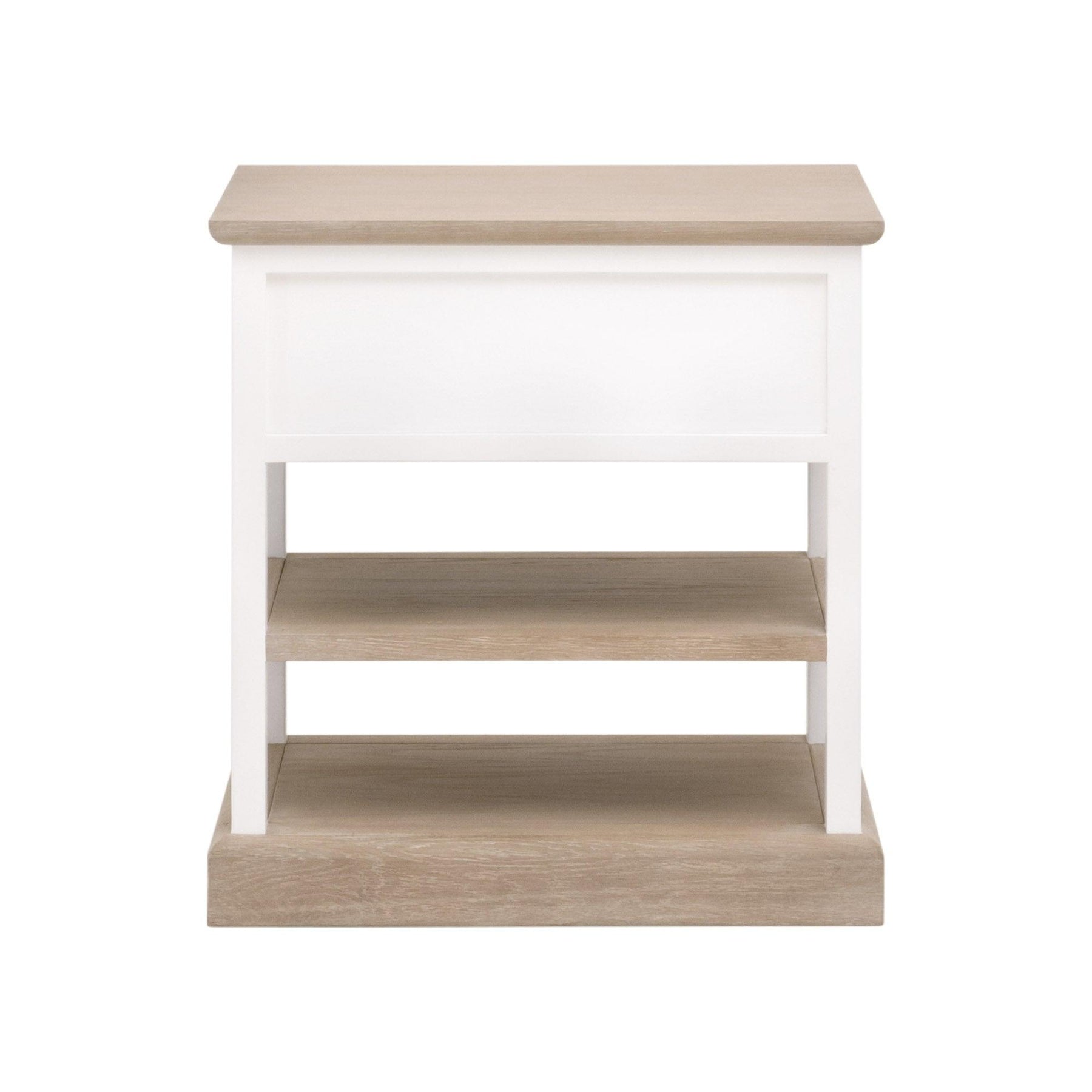 Elevate your living space with the Weave 1-Drawer Side Table by SwayLiving. This unique bedside table seamlessly blends one-of-a-kind style and functionality. Crafted from solid oak wood and other hardy wood materials, this side table is finished in white and smoke gray wood. It measures a convenient 23.5" wide, 18.5" deep, and 25.25" high. The painted two-tone surround and distinctive wood basket weave drawer design add a touch of artistic flair. The brushed gold drawer handle is simple in design and the dual metal undermount soft-close drawer glides ensure smooth and easy operation. The one drawer and storage shelf are accompanied by a doorless design, making this side table is a practical and stylish addition to any space.