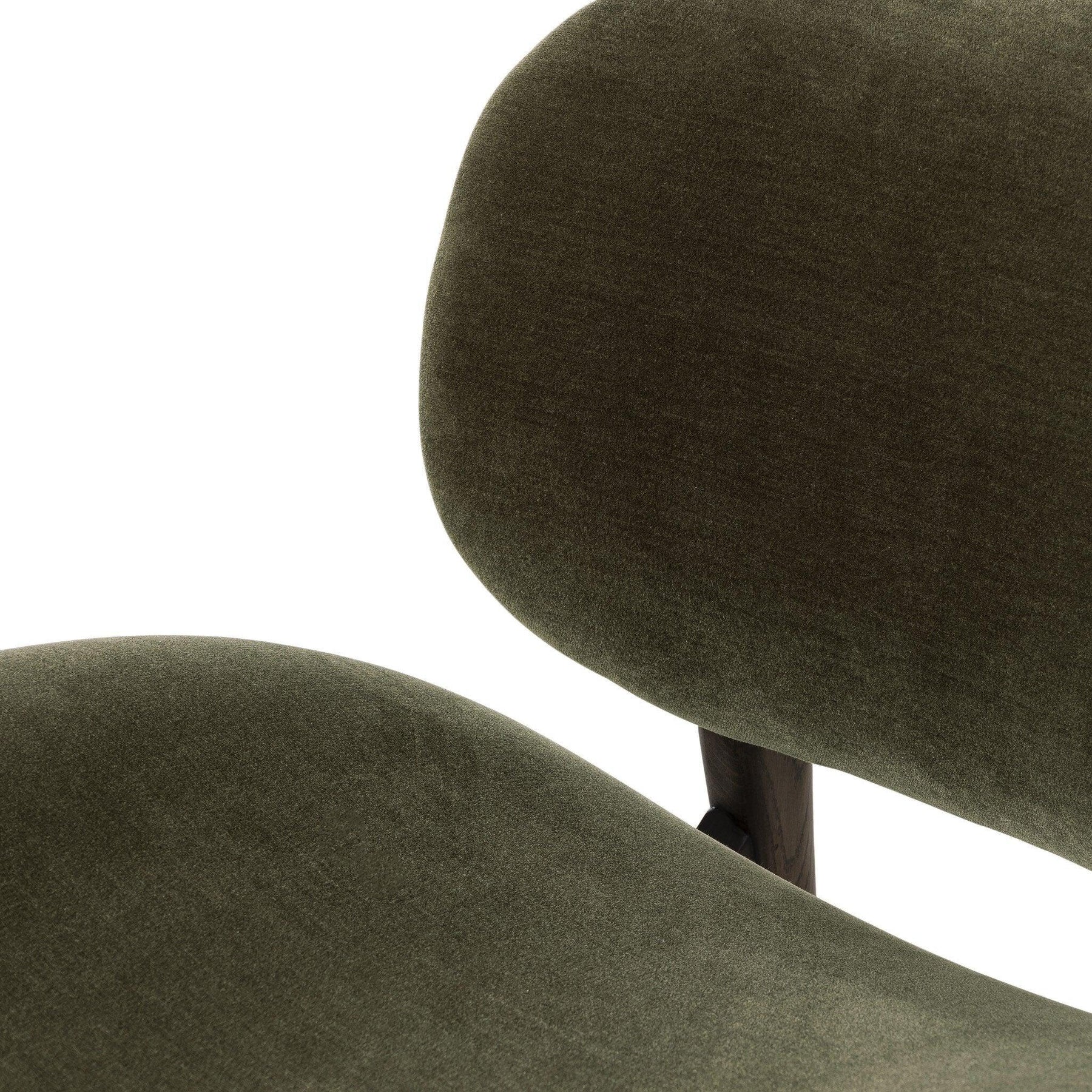 This perfect accent chair designed for unwinding. Upholstered in a velvety olive chenille made from recycled materials with wide proportions and cozy curves and cushioning. Slim tapered wooden legs balance the look.