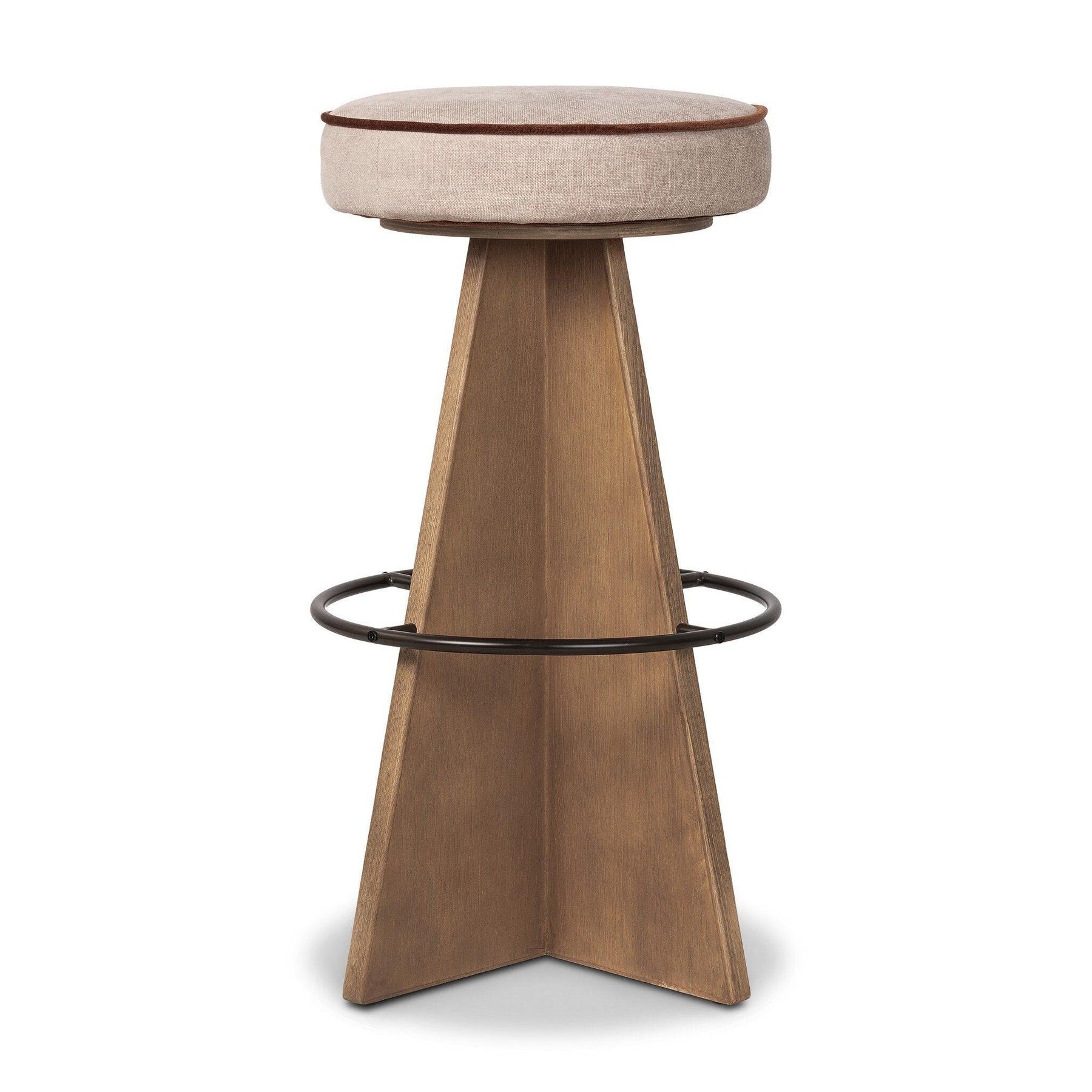 Large angular panels merge to form a geometrically inspired base in this modern counter stool. The circle metal ring around the base serves as a footrest while the round upholstered cushion provides comfortable seating. The 360-degree swivel function adds versatility and the combination of wood metal and fabric evoke a mixed material moment.