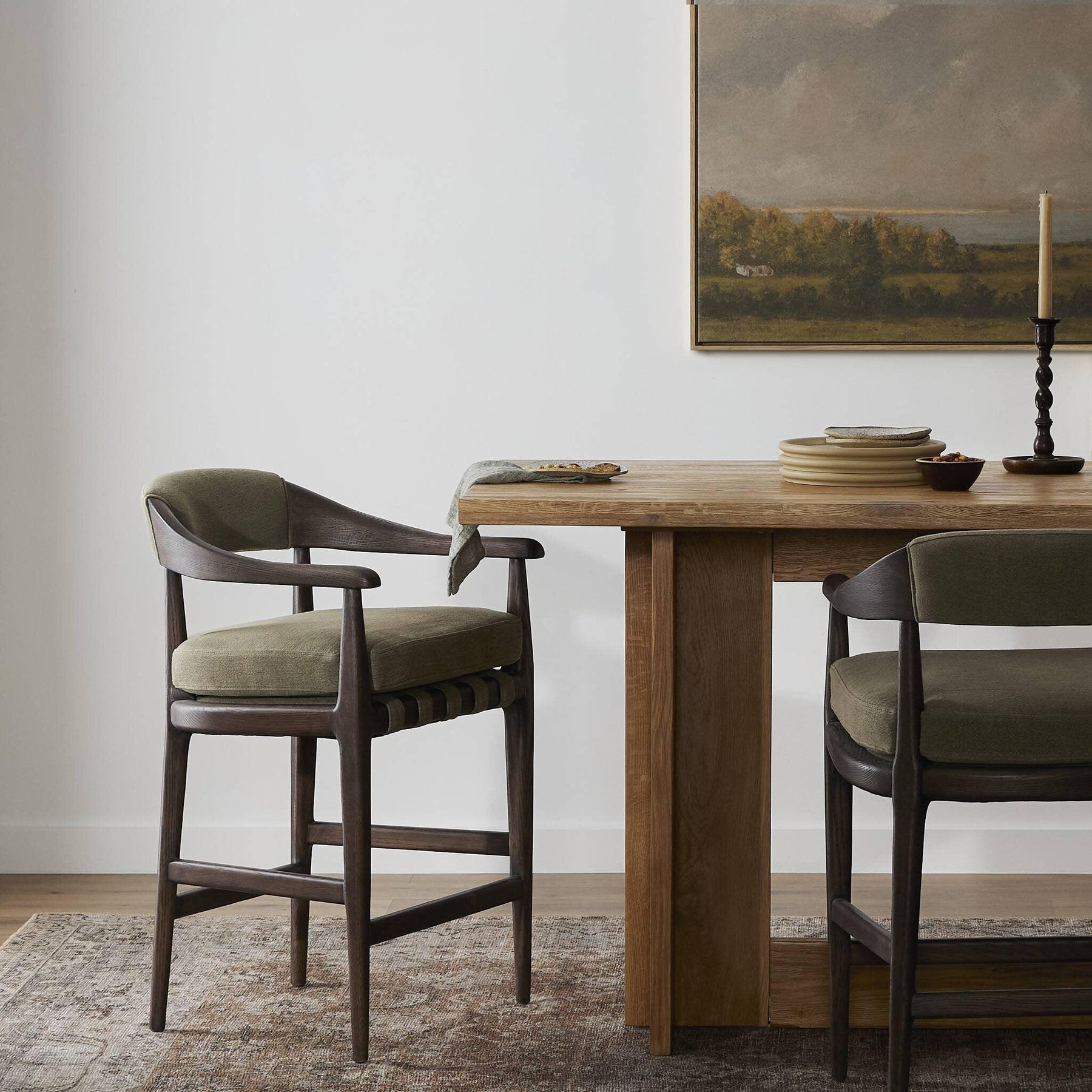 Traditional safari styling is brought to modern speed. A solid wood frame features a webbed seating structure that brings a supported sink-in feel to the entire piece. The upholstered back strap details and loose cushion are finished in an olive flax/linen-blend fabric. Perfectly sized for the counter.