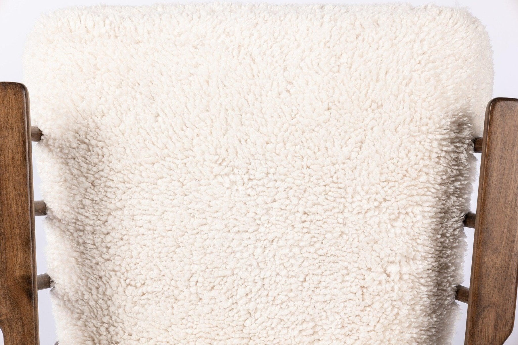The classic high-back spindle chair gets a dramatic and comfy update with thick loose cushions covered in a plush high-pile faux Mongolian shearling.