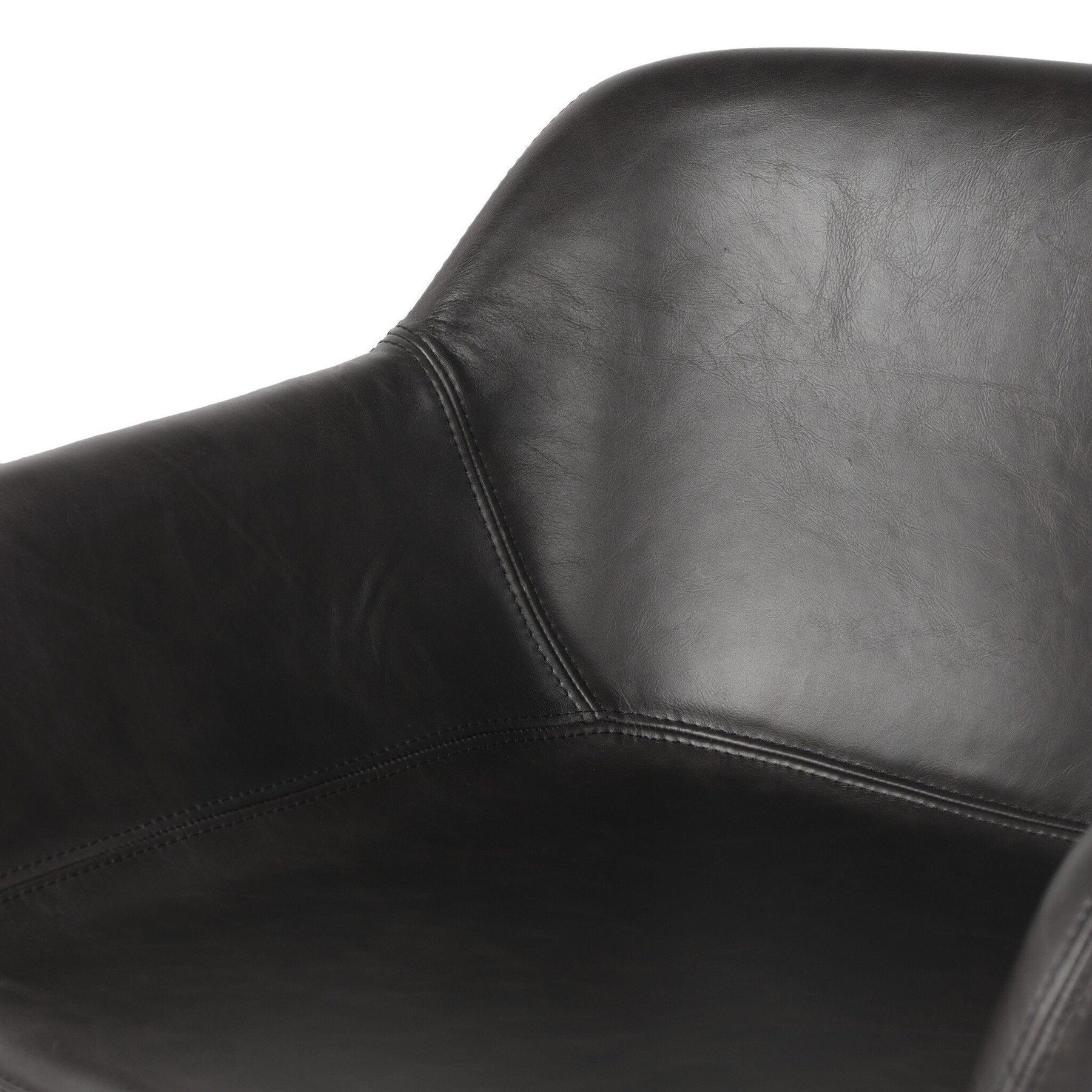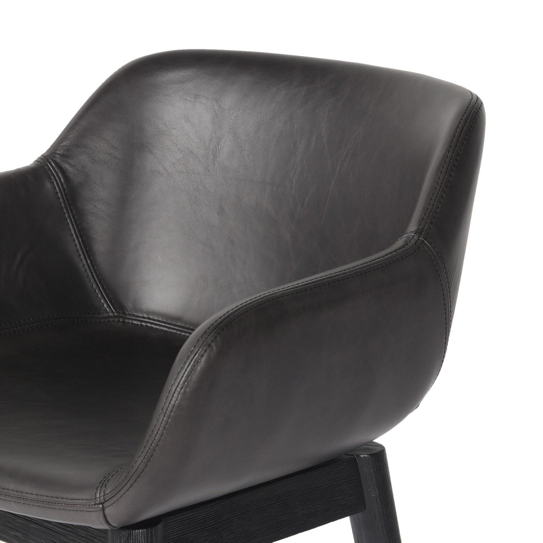 A midcentury-inspired counter stool gets refreshed with a modern memory swivel and black top-grain leather. Slim tapered legs balance a curved seat.