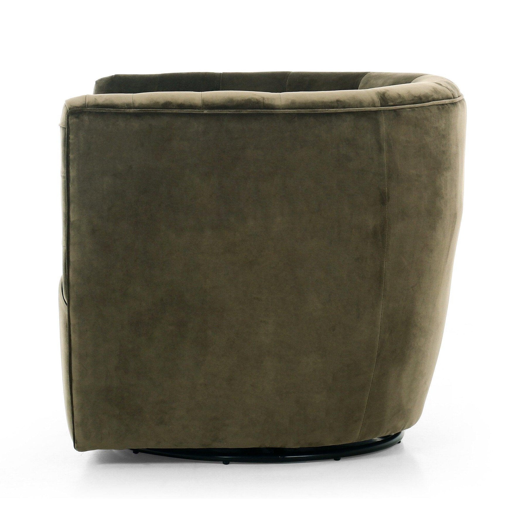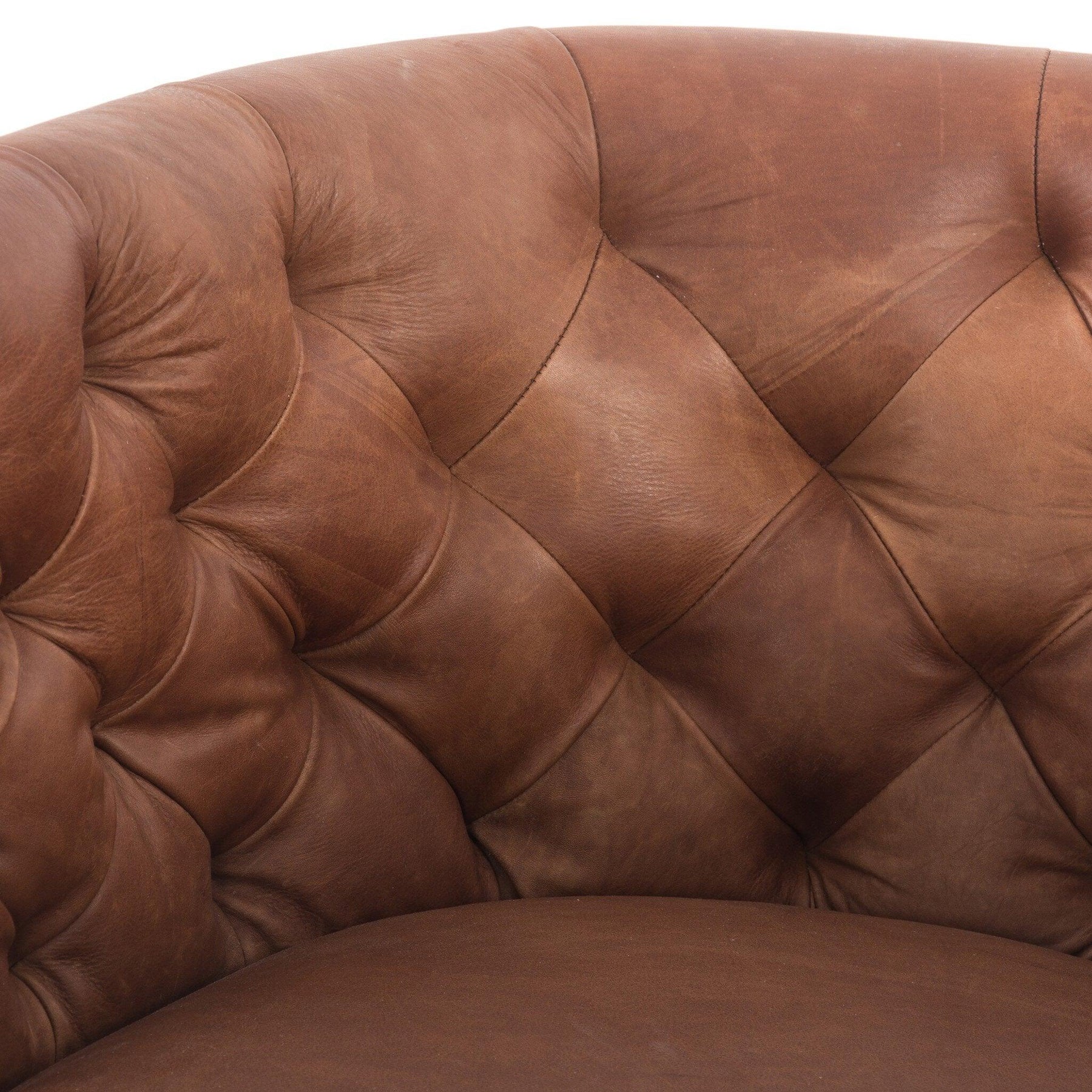 A perfectly curved statement on a 360 swivel. Soft heirloom top-grain leather is pristinely tailored with dramatic blind tufting and high shapely arms. Sourced from one of the oldest family-owned tanneries in Italy’s Bassano del Grappa our heirloom leather covering is salvaged and processed from upcycled hides featuring an abundance of natural markings scars and color variations. The result? Beautifully supple buttery soft hides with an unmatched depth of color and richness and an authentic lived-in look.