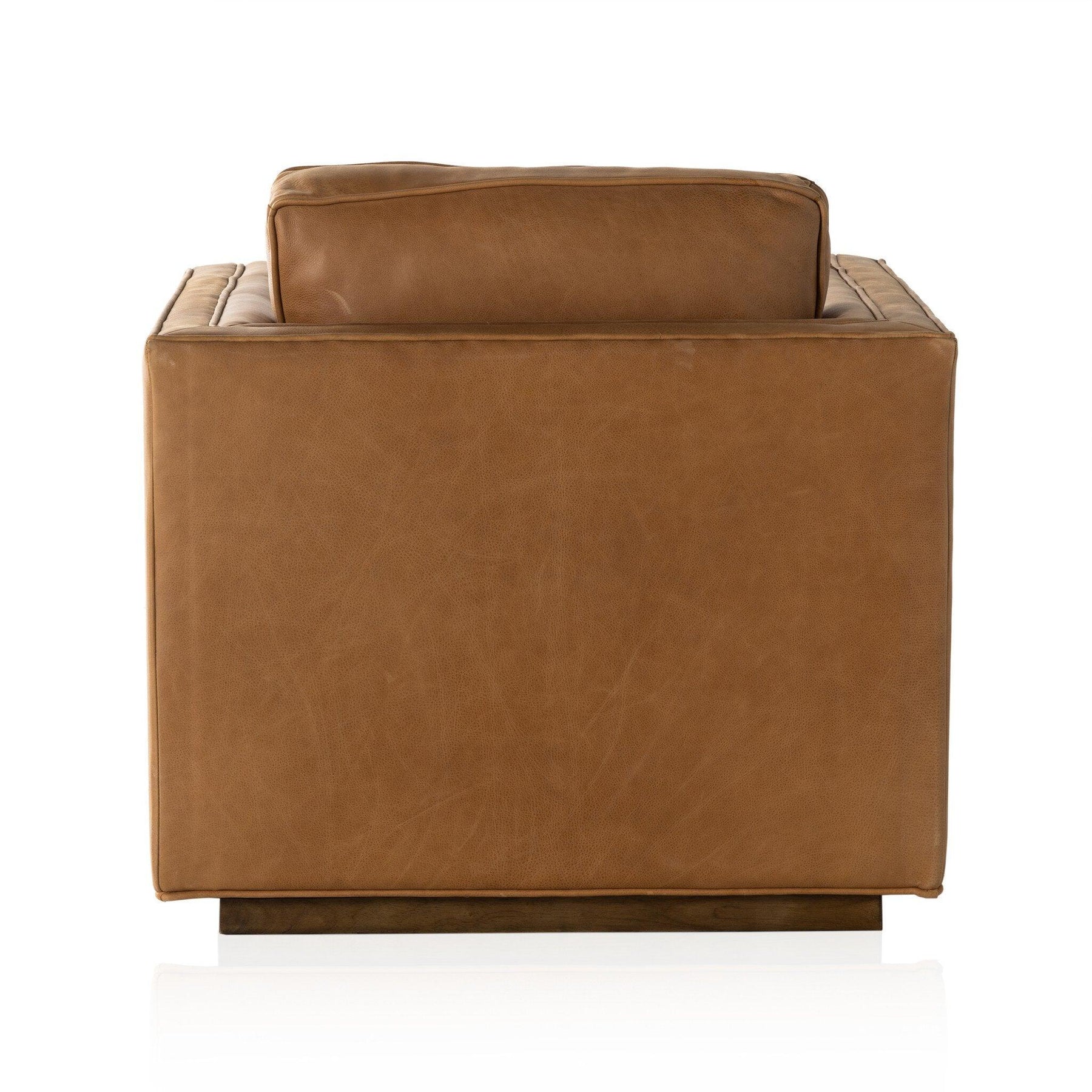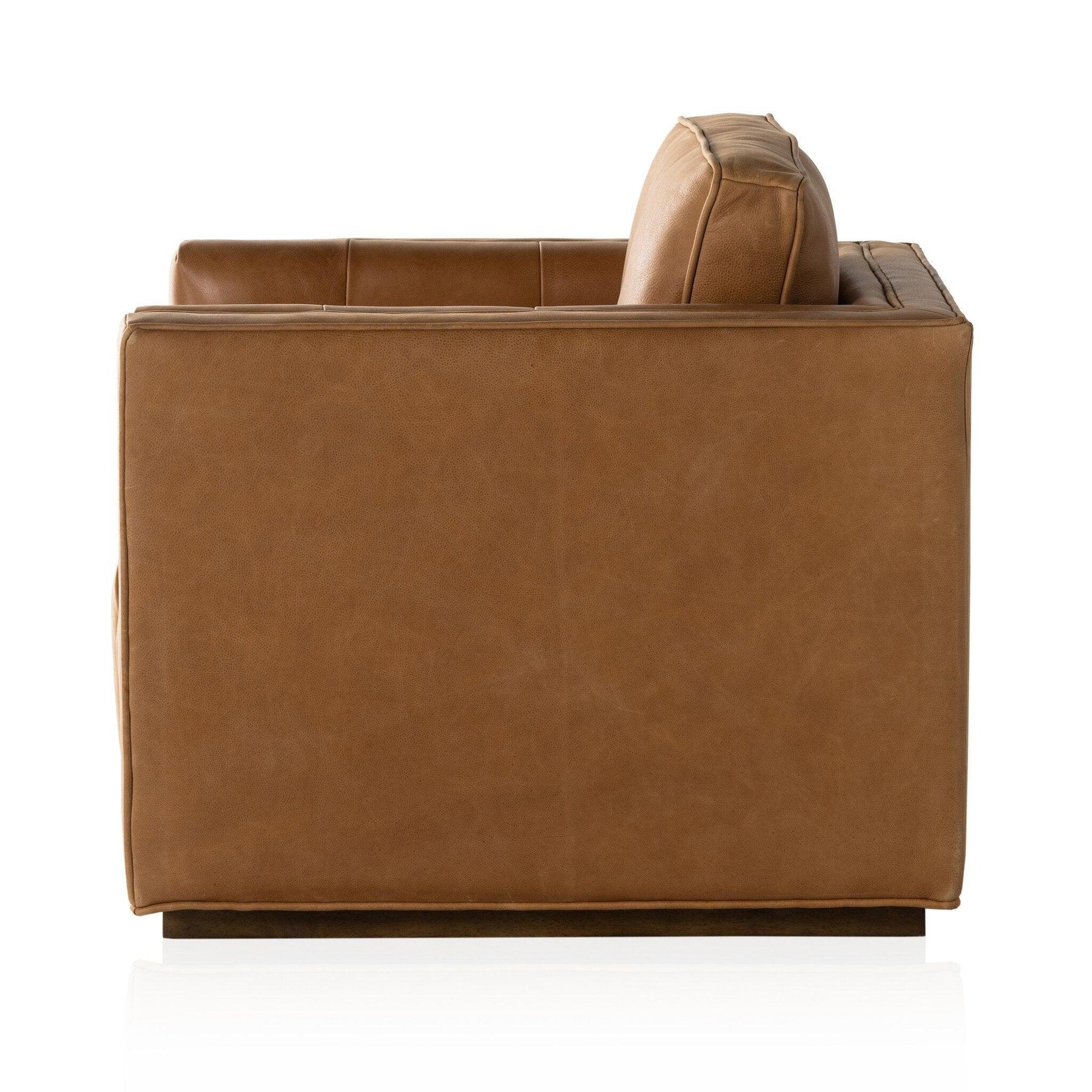 Top-grain leather covers clean-angled arms for a tailored look with blind tufting for texture. A 360-degree swivel base modernizes the whole look.