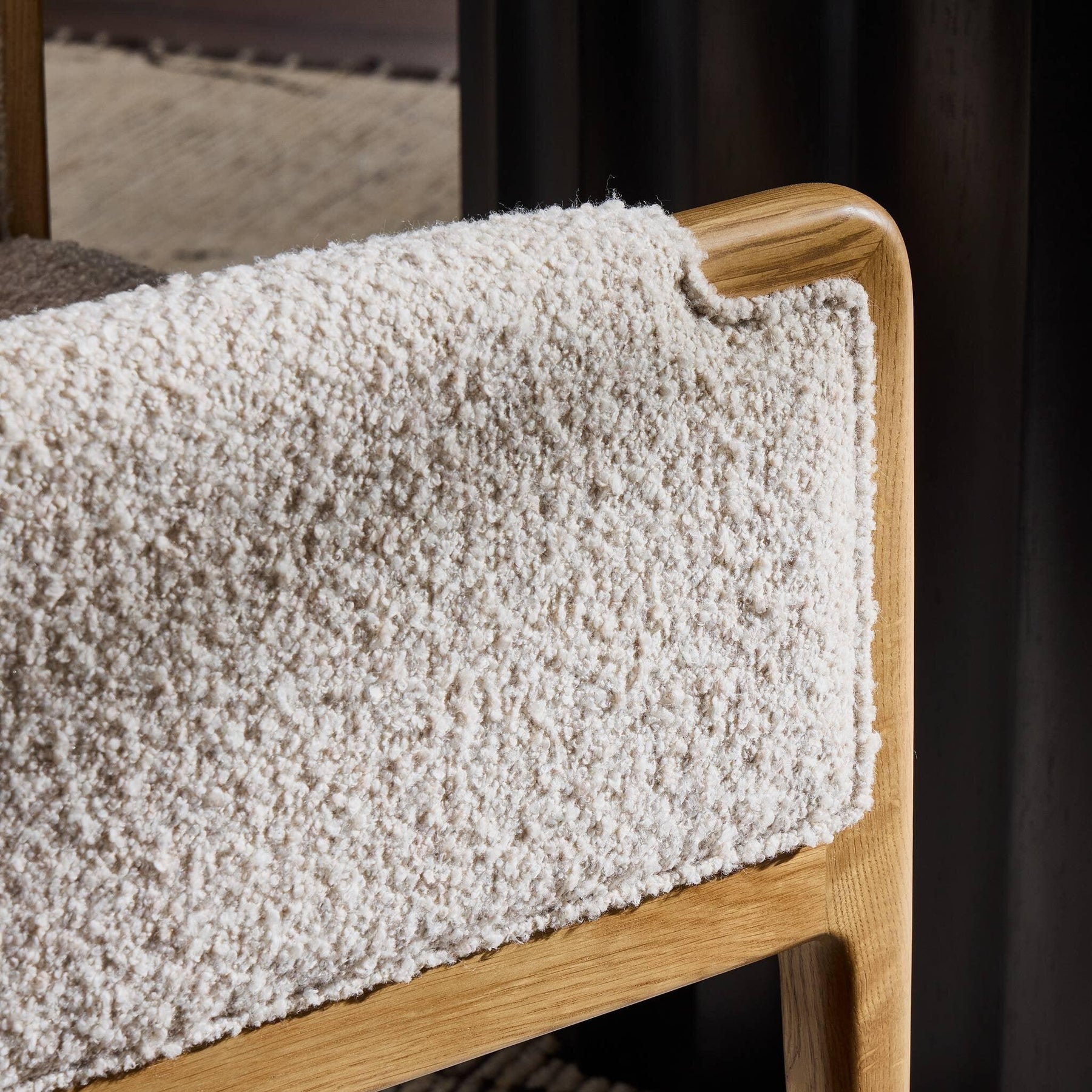 A patterned dining chair that’s all about comfort. Checkered-print upholstery is framed by light warm oak while a boxy profile and higher arms feel prime for the head of the table.