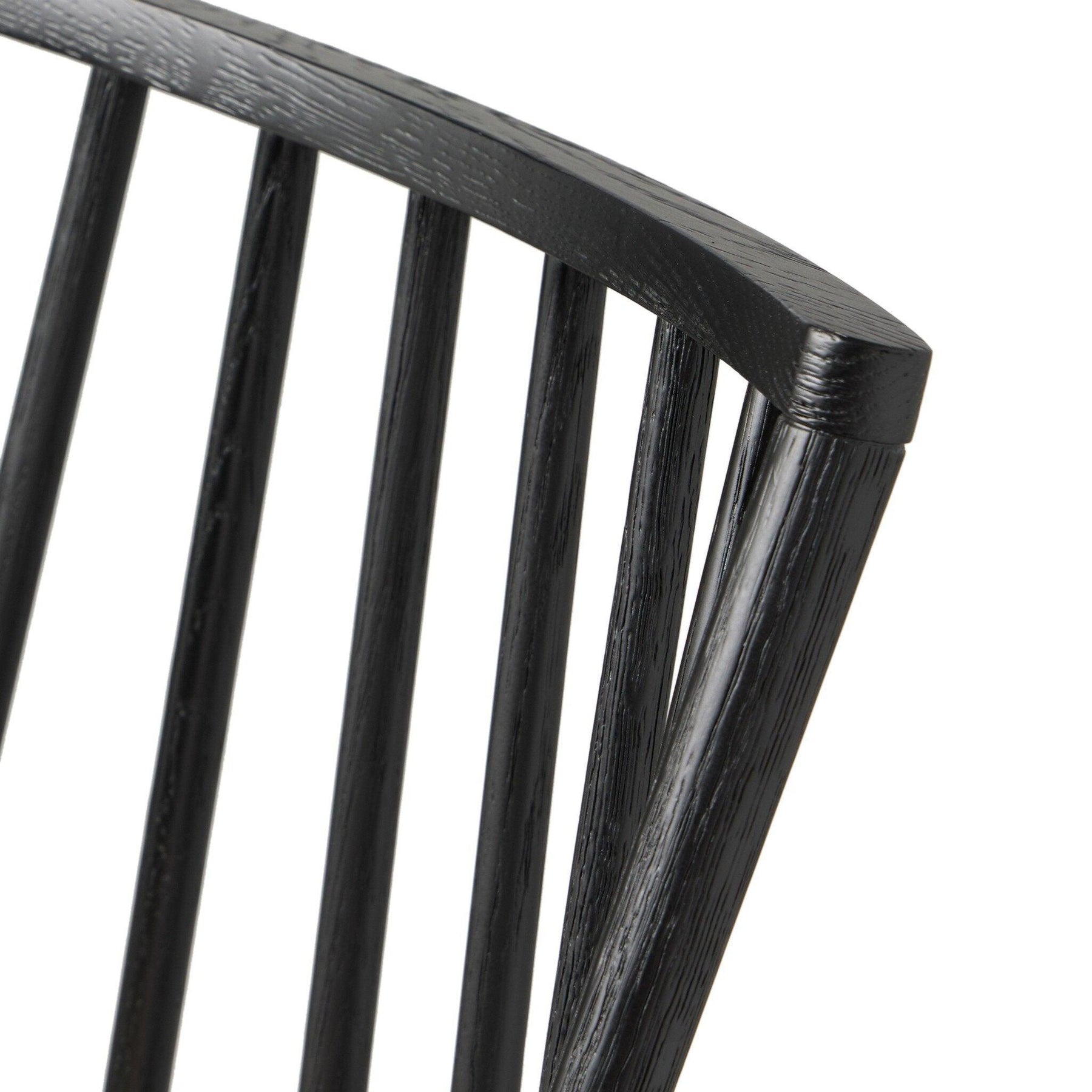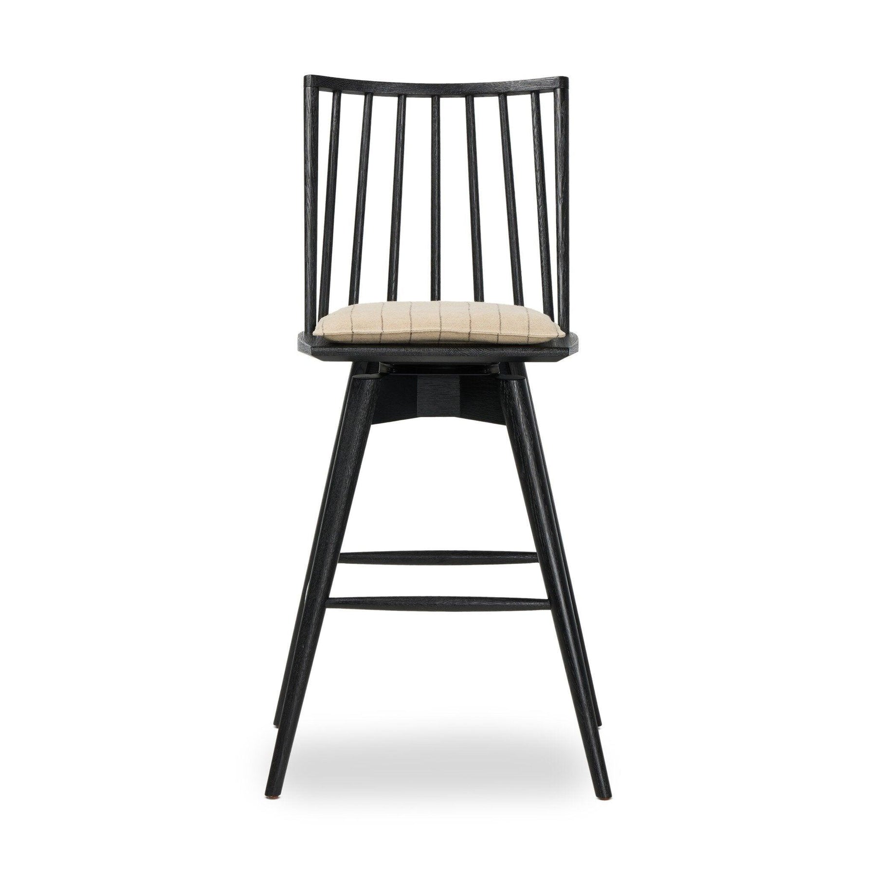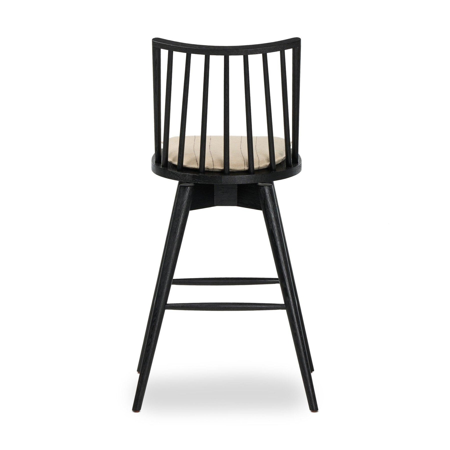 A new take on the traditional Windsor. This tall beauty is wire-brushed to highlight the cathedral grain of black oak. Perfectly sized for the bar with a 360-degree swivel for ease and a top-grain leather cushion for comfort.
