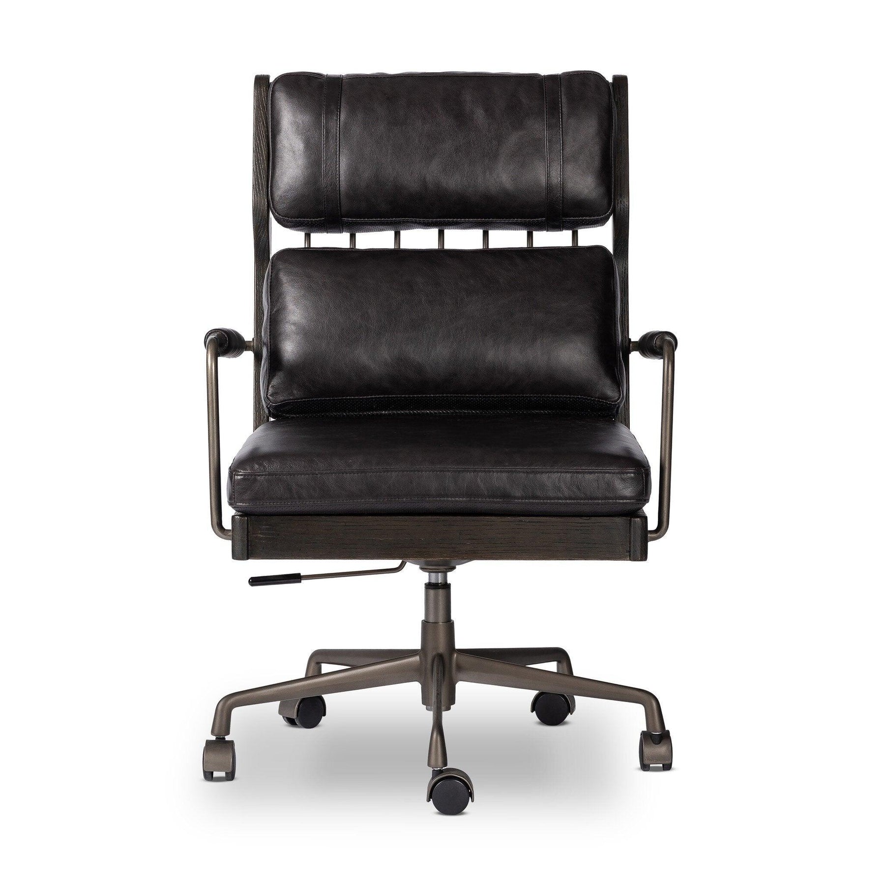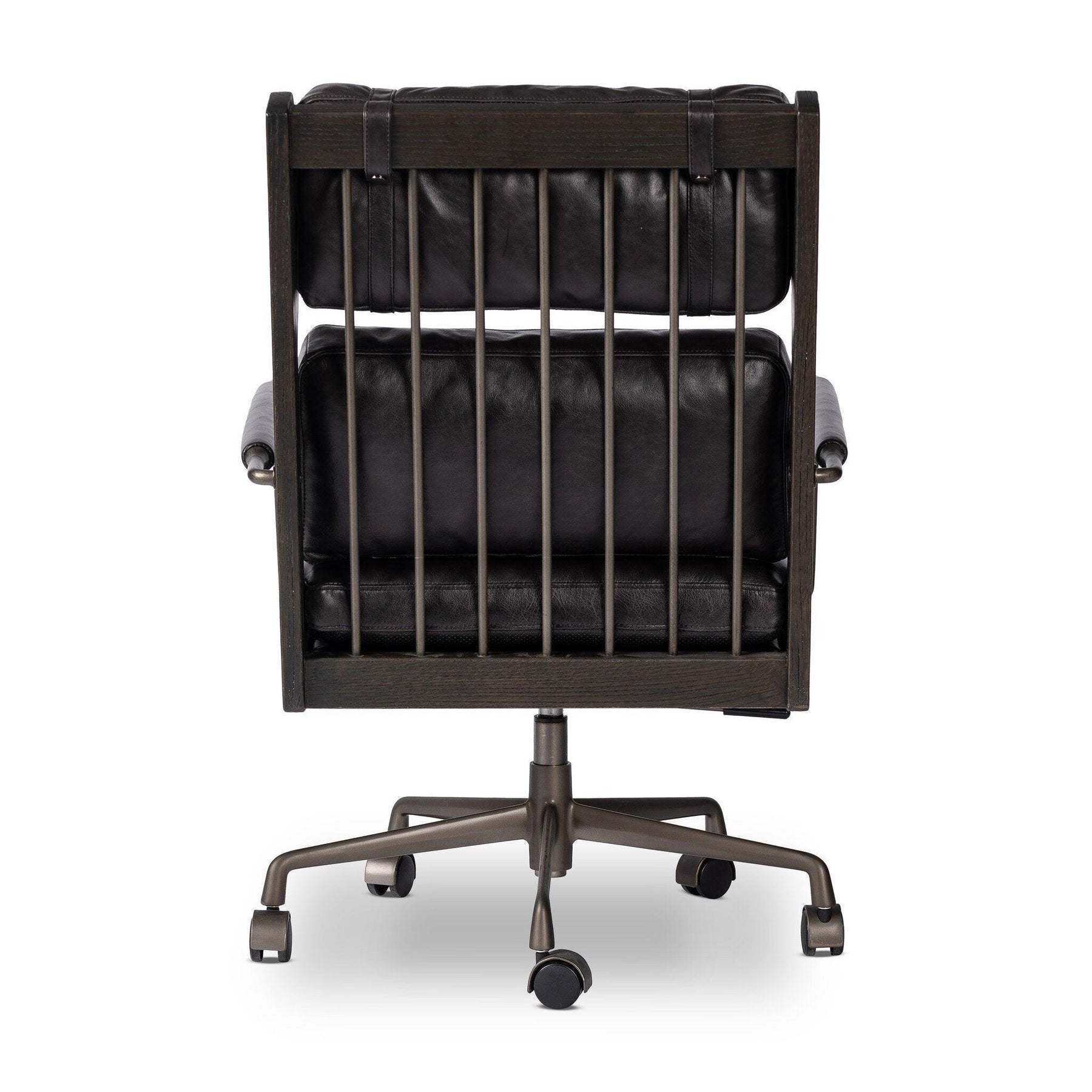 A detail-driven desk chair blends form and function in your workspace. An aged oak frame pairs with striking accents including metal back spindles and fabric-wrapped arms. An upper cushion with strap and snap detailing adds both comfort and a touch of modern character. Styled in a linen-cotton-poly performance blend. Steaming required. Performance fabrics are specially created to withstand spills stains high traffic and wear ensuring long-term comfort and unmatched durability.