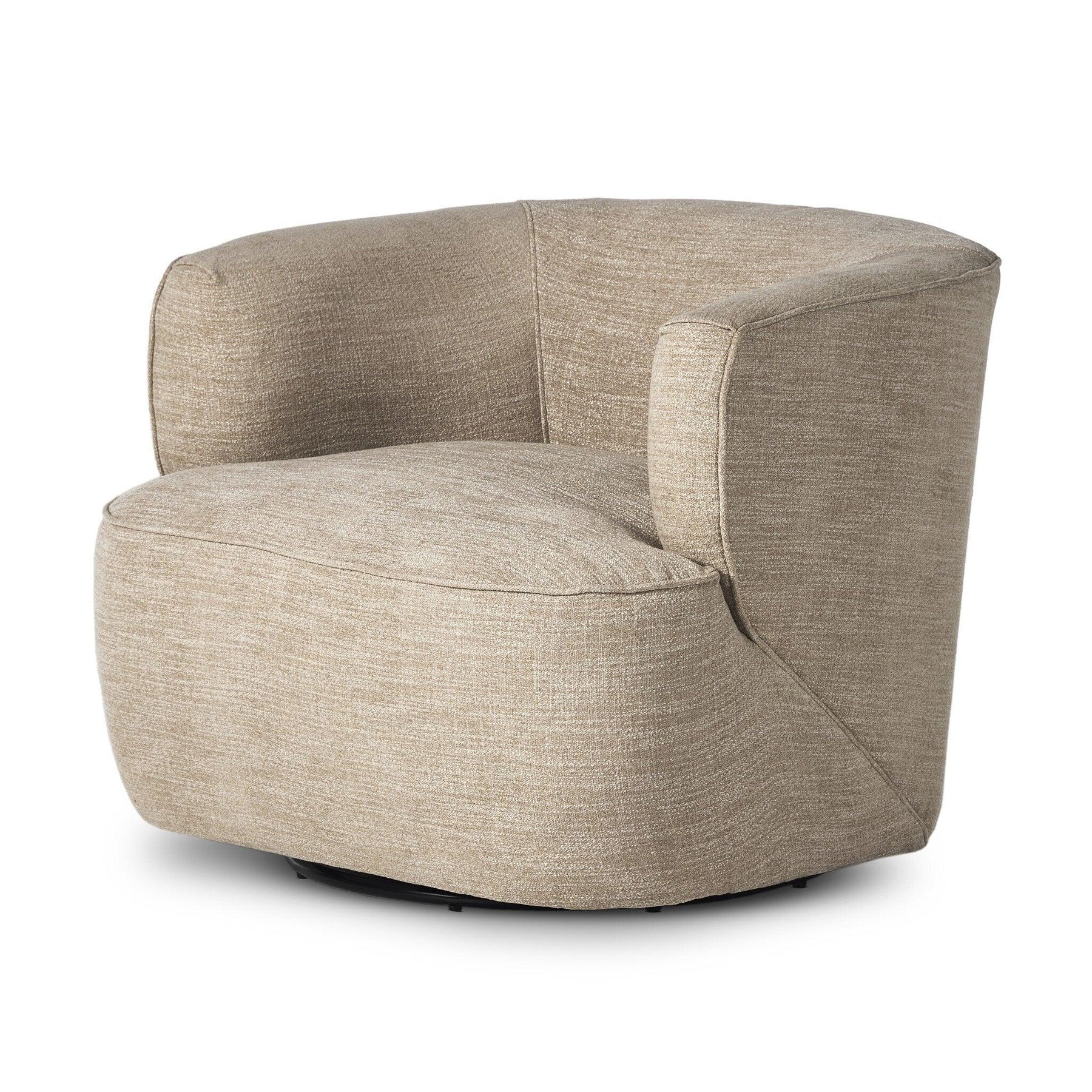 Soft and textural camel-colored upholstery hugs the welcoming curves of this supportive accent chair while a concealed 360-degree swivel keeps things easy and modern.