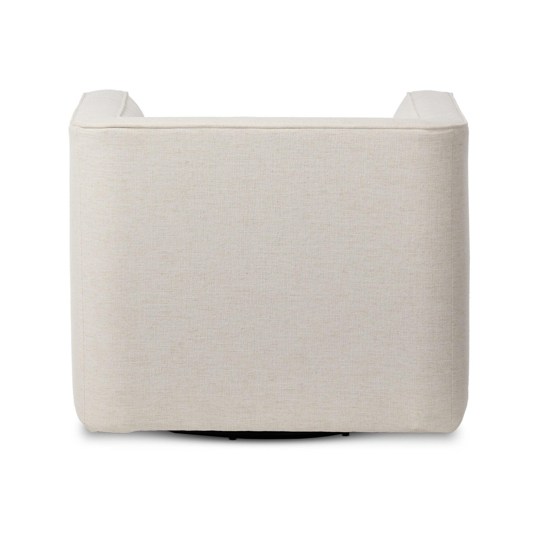 Style meets substance in this olive cotton-blend swivel chair. Blind stitching along the seat and back cushions create a polished complement to the heritage frame. The slight pronounced seat cushion creates an illusion of being loose but is actually a fixed cushion with expert tailoring. A piping channel detail gives the arm a finished look.