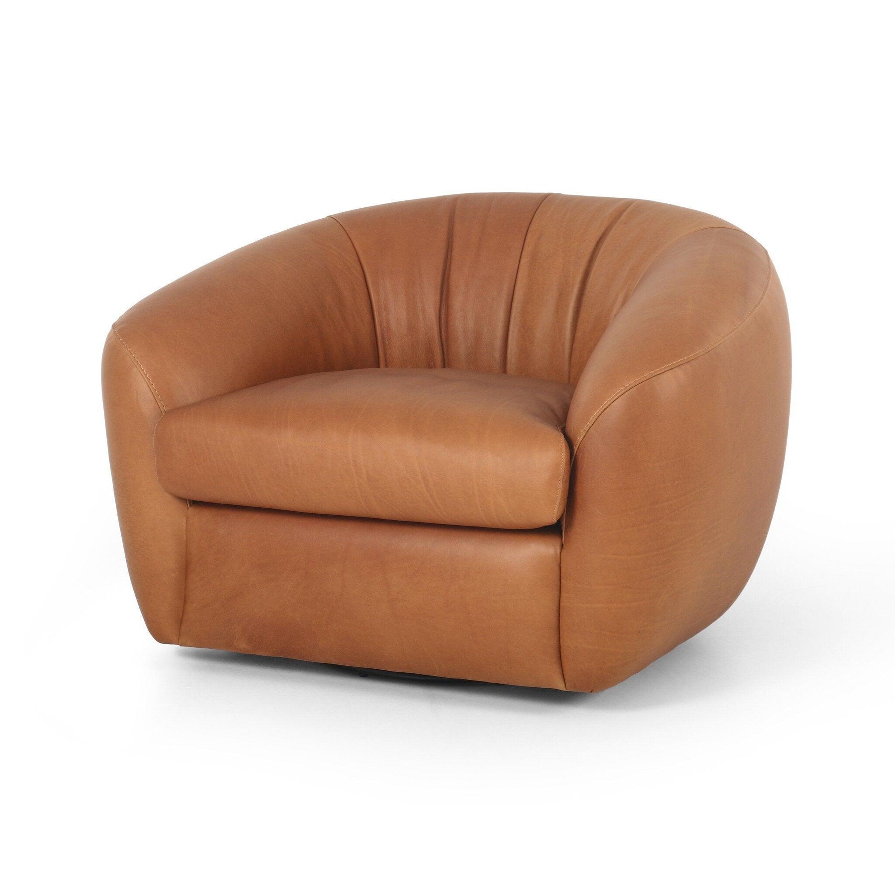 Vintage charm meets modern comfort in this elevated 360-degree swivel chair. Wrapped in soft supple top-grain leather with a warm cognac finish. Exaggerated folds and expertly rouched details bring a tailored handcrafted look unique to each piece. Spring suspension and a feather-wrapped cushion invite you to sit and stay a while.