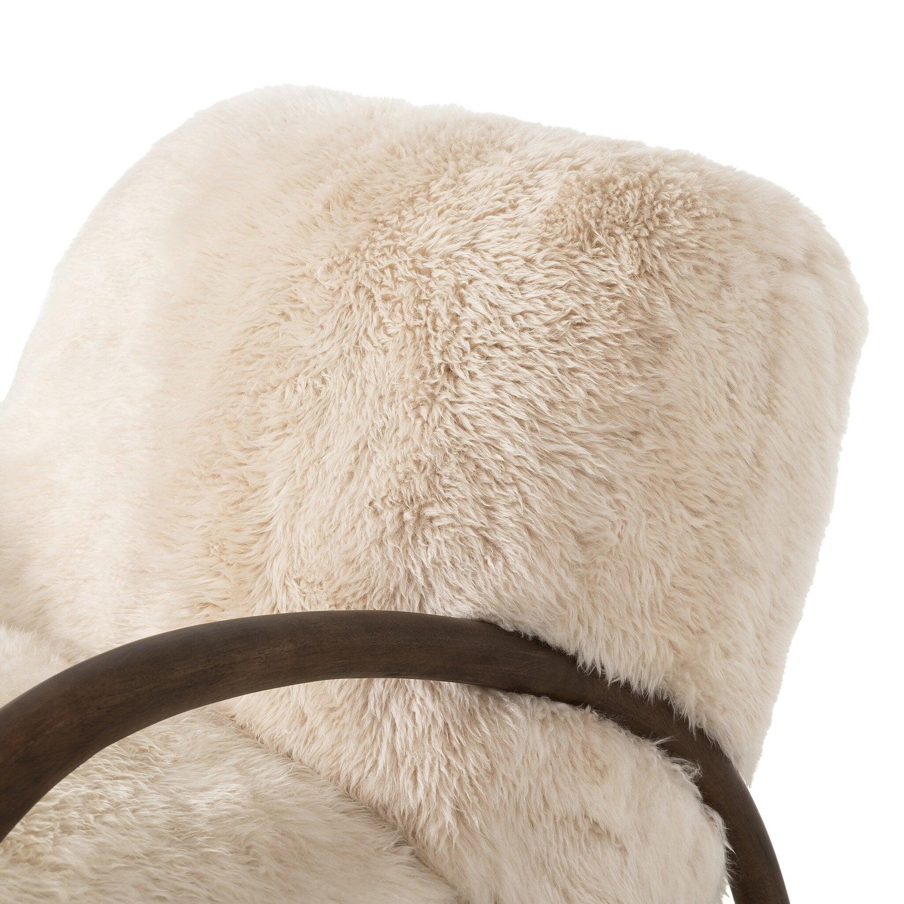 This versatile accent chair is upholstered in a faux Mongolian shearling with a textural high pile. A contrasting chunky parawood frame hugs the seat and is wire-brushed for a warm vintage feel.