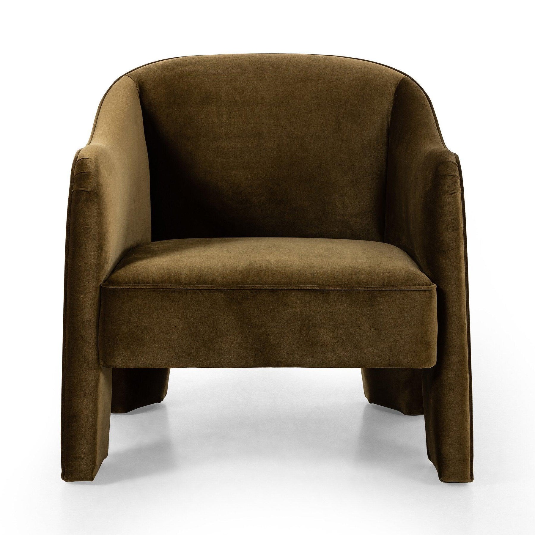 Shape-driven from top to bottom this modern accent chair is tightly upholstered in a smooth cotton velvet fabric. Subtle highs and lows throughout the fabric change in appearance depending on the direction of the fabric's nap and the lighting in the room bringing movement to the entire piece. S-spring construction ensures a supportive sit while side cutouts catch the eye.