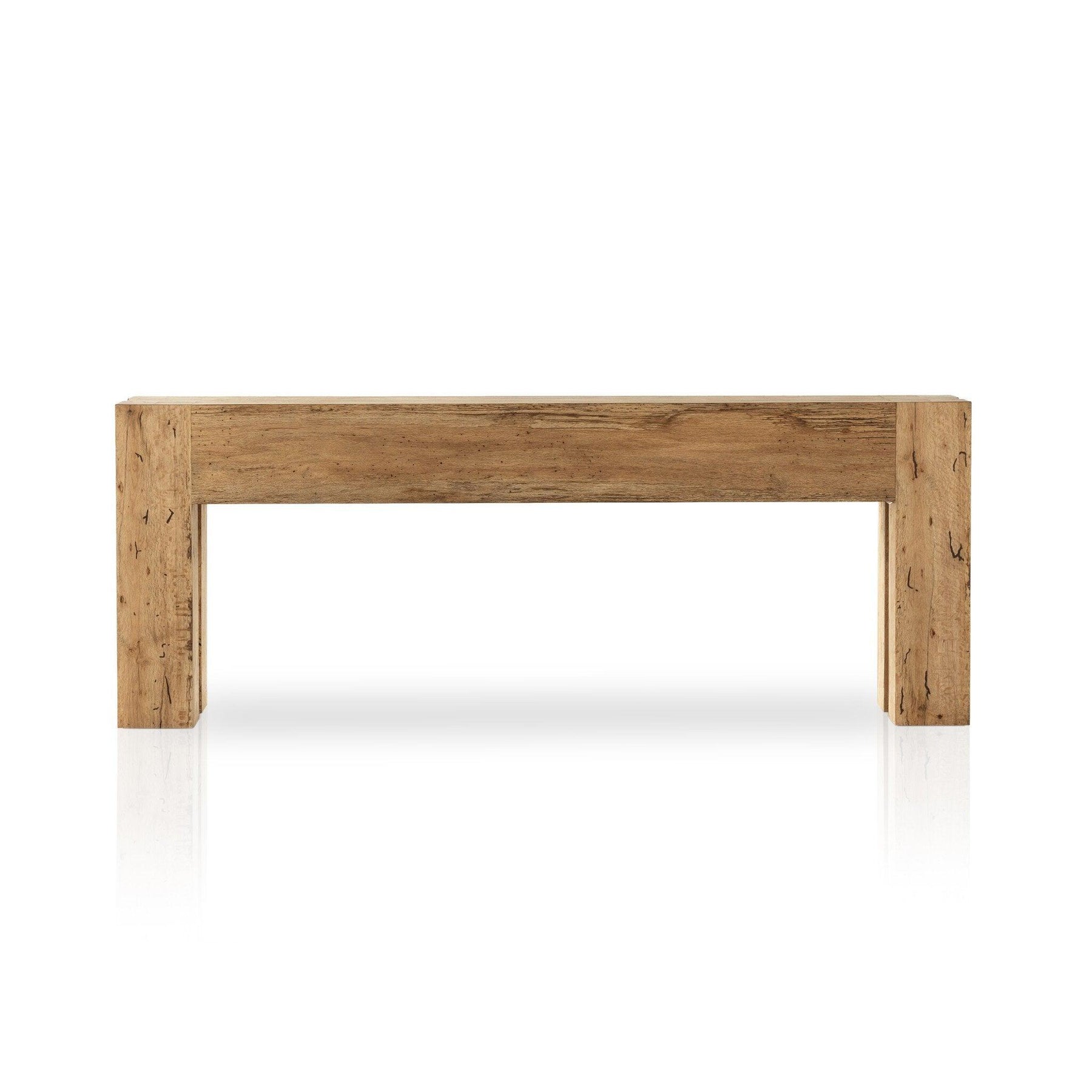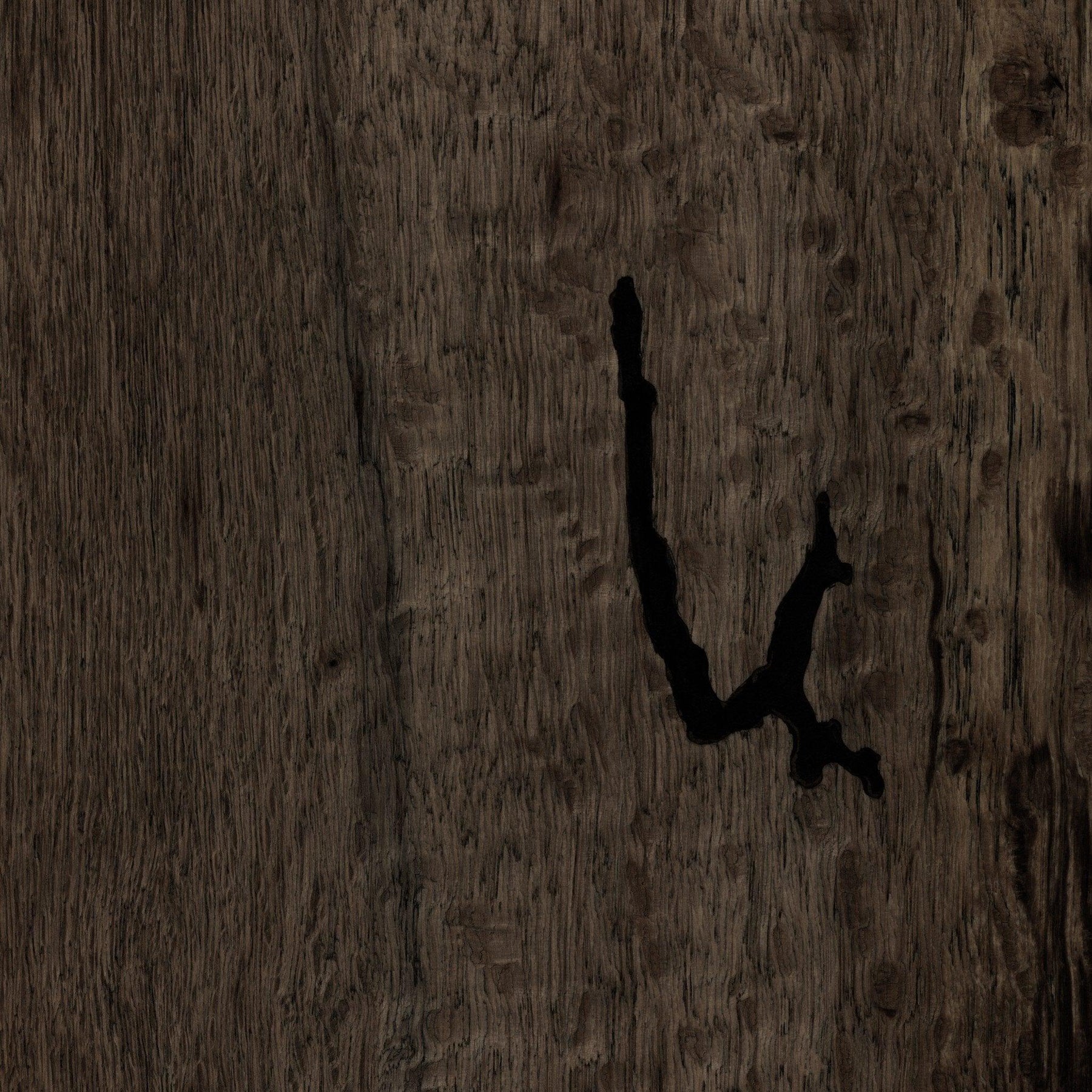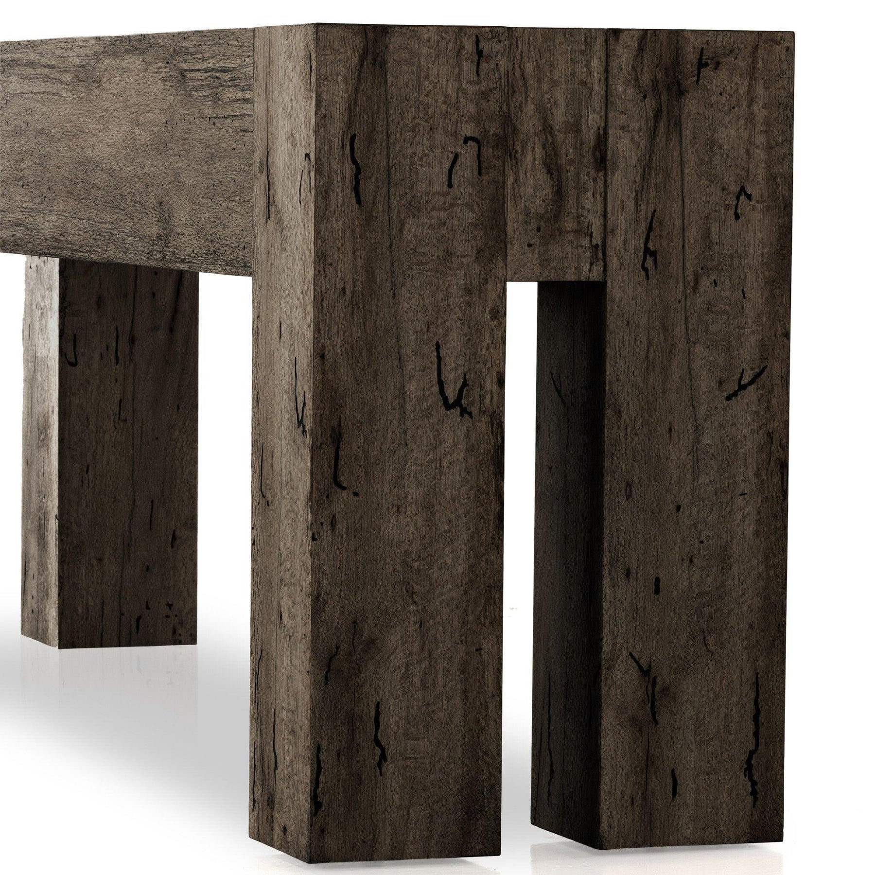 Made from thick-cut oak veneer with a faux rustic finish made to emulate wormwood oak this low large-scale console table features chunky squared legs and dovetail joinery detailing.