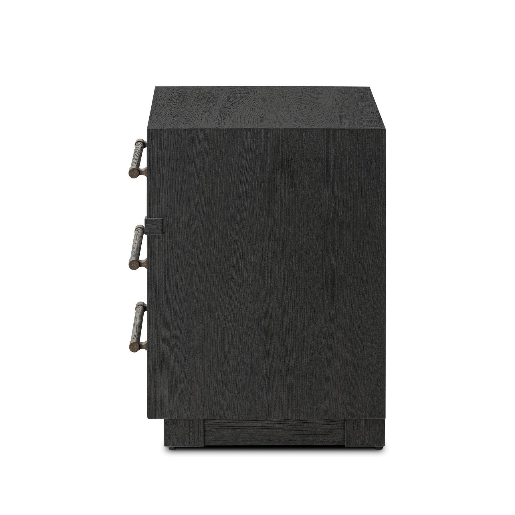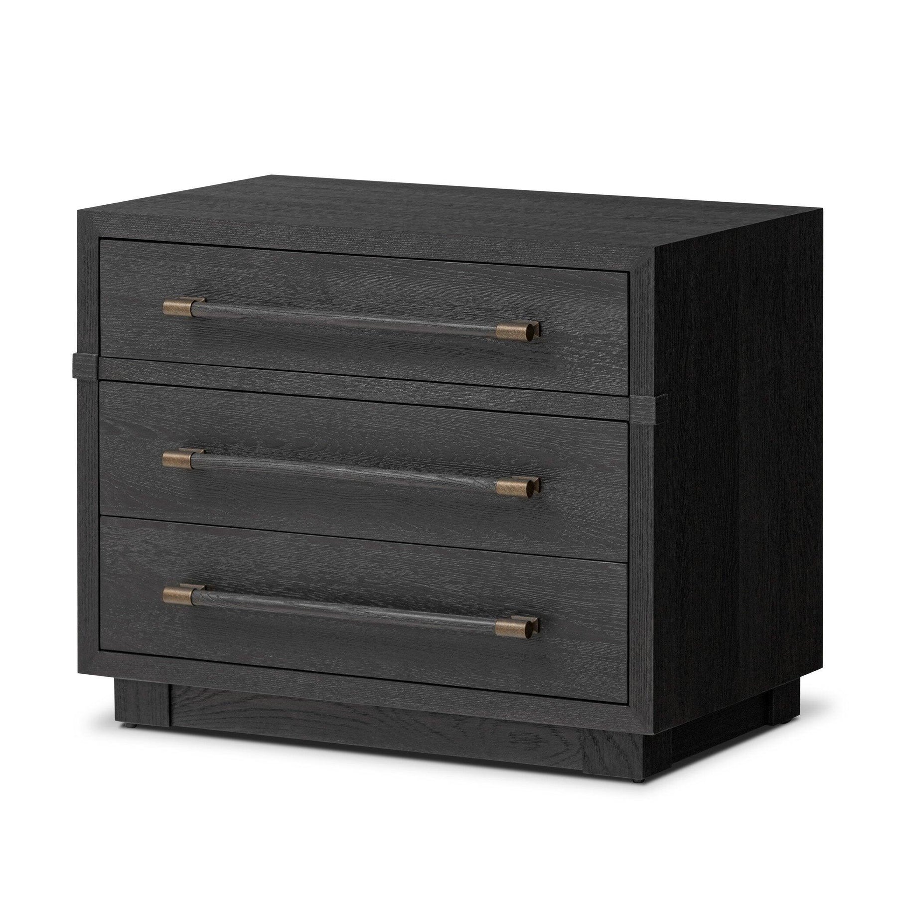 Beautifully minimalist. A three-drawer dresser made from black-finished ash features long linear bronzed hardware for a smooth clean look.