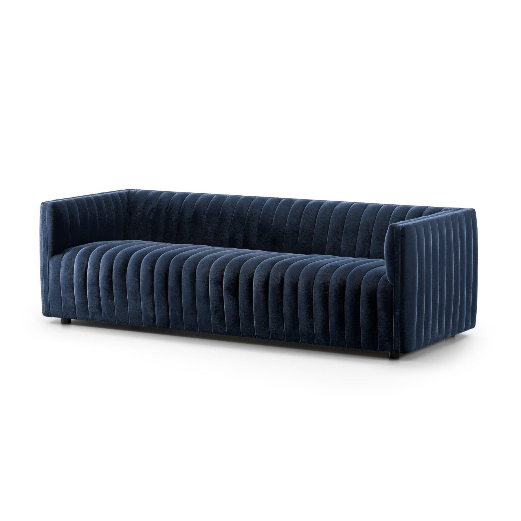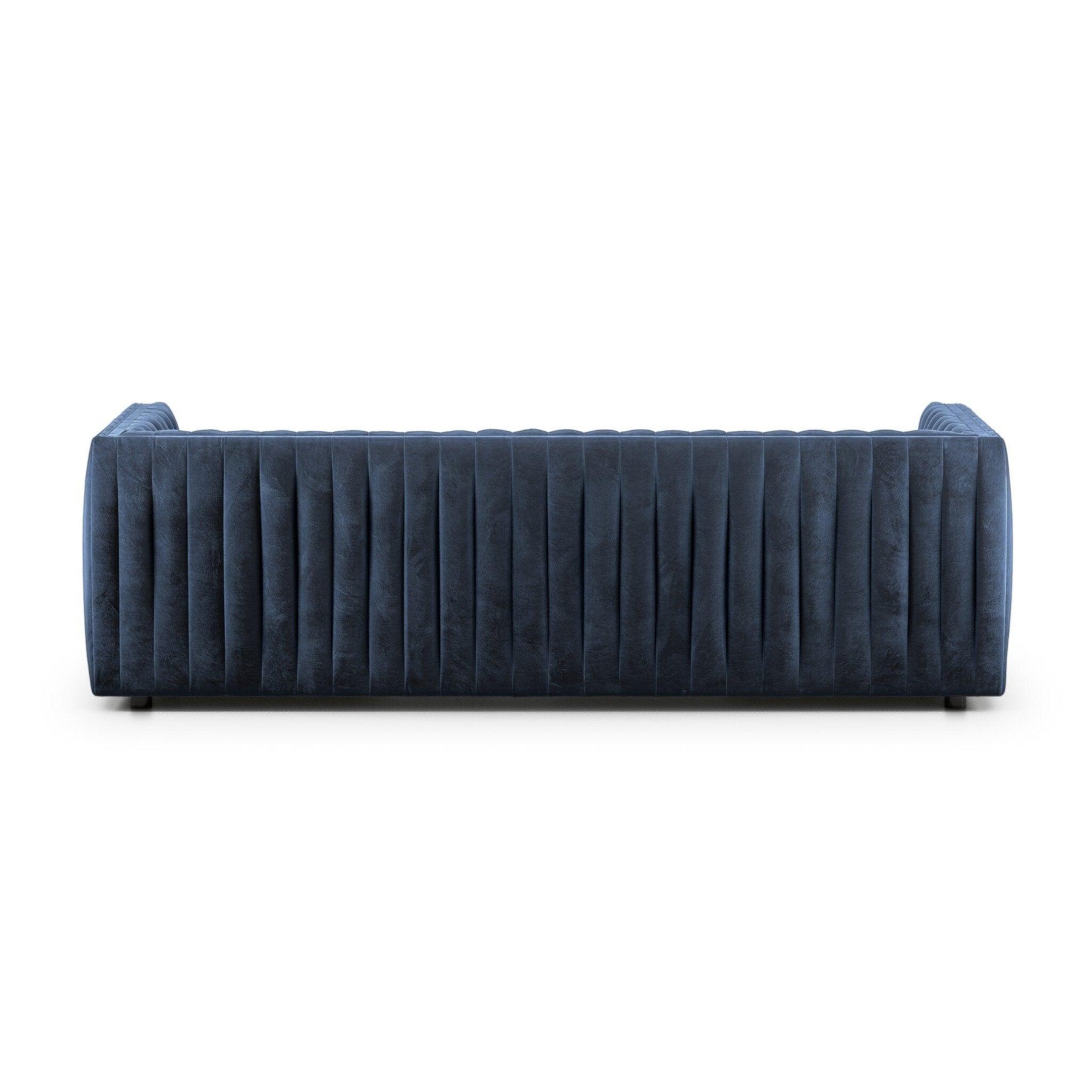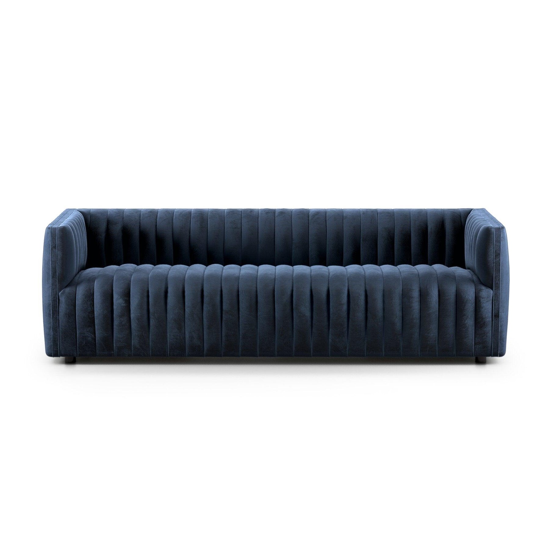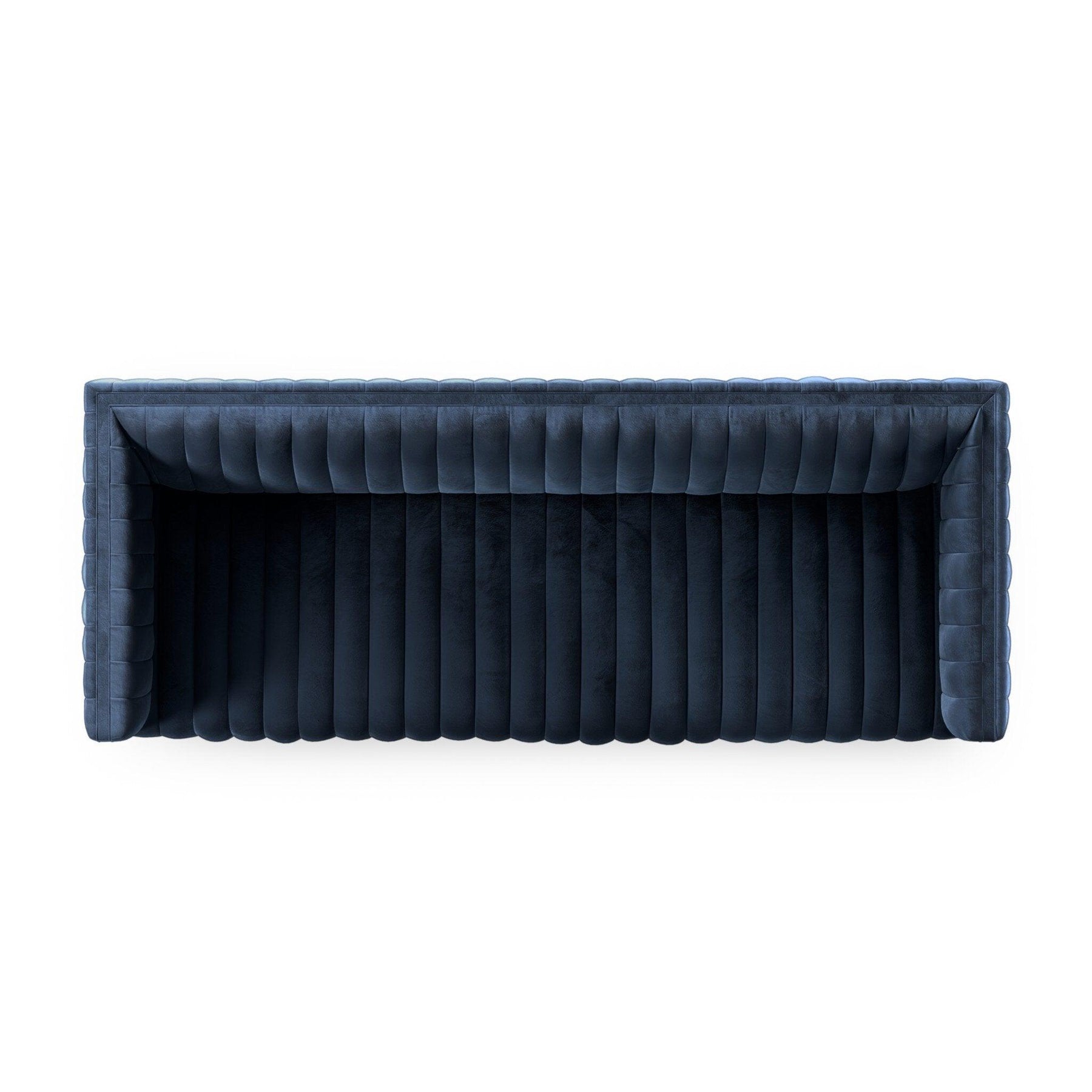 Velvety poly-blend seating takes on dramatic channeling and rich navy hue for trend-forward texture and sumptuous sit.