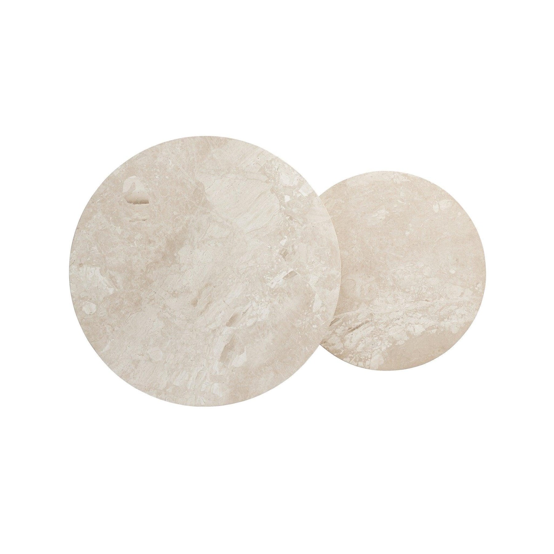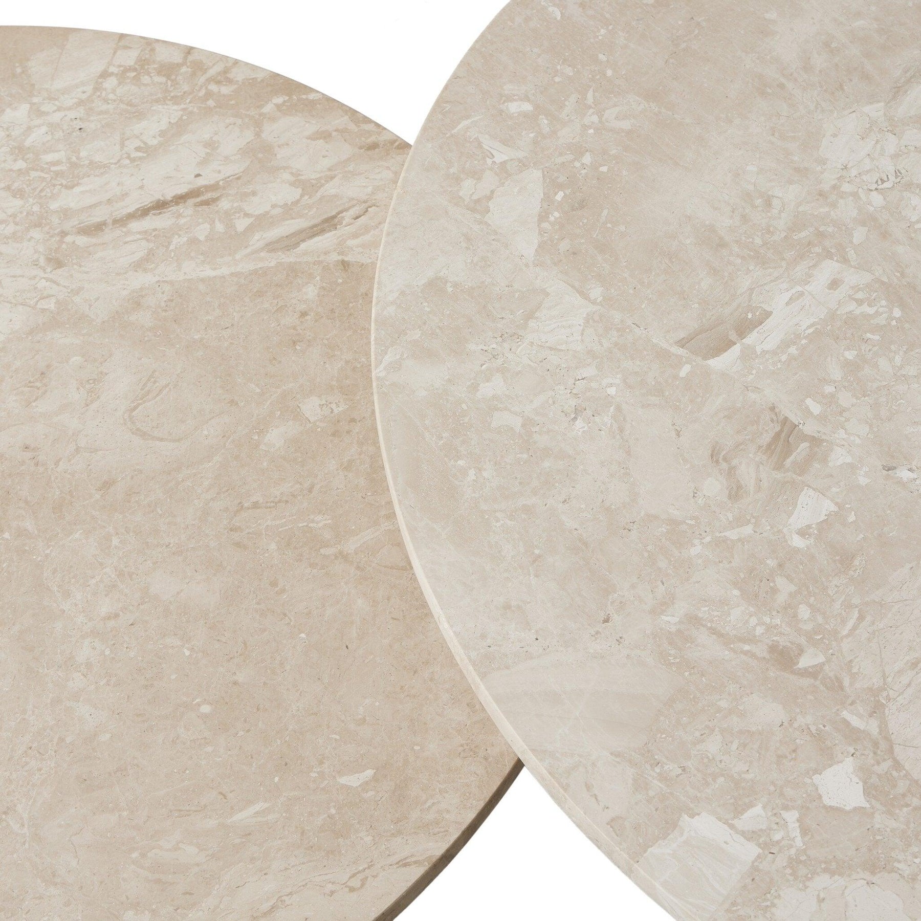 Hammered iron bends seamlessly in a continuous pattern to create the bases of these mixed-material nesting coffee tables. The rounded tops made from expressive marble display unique markings and natural patterns.