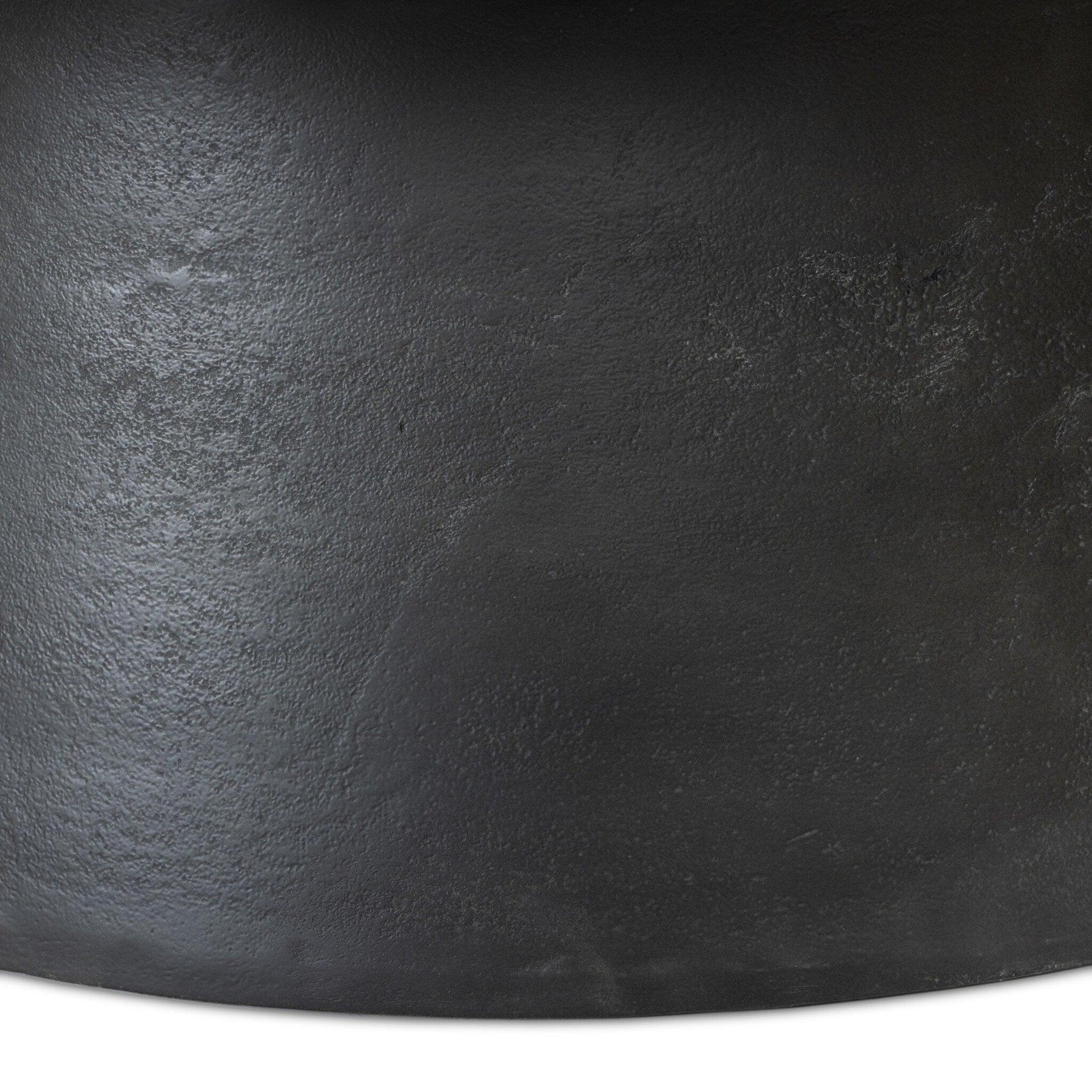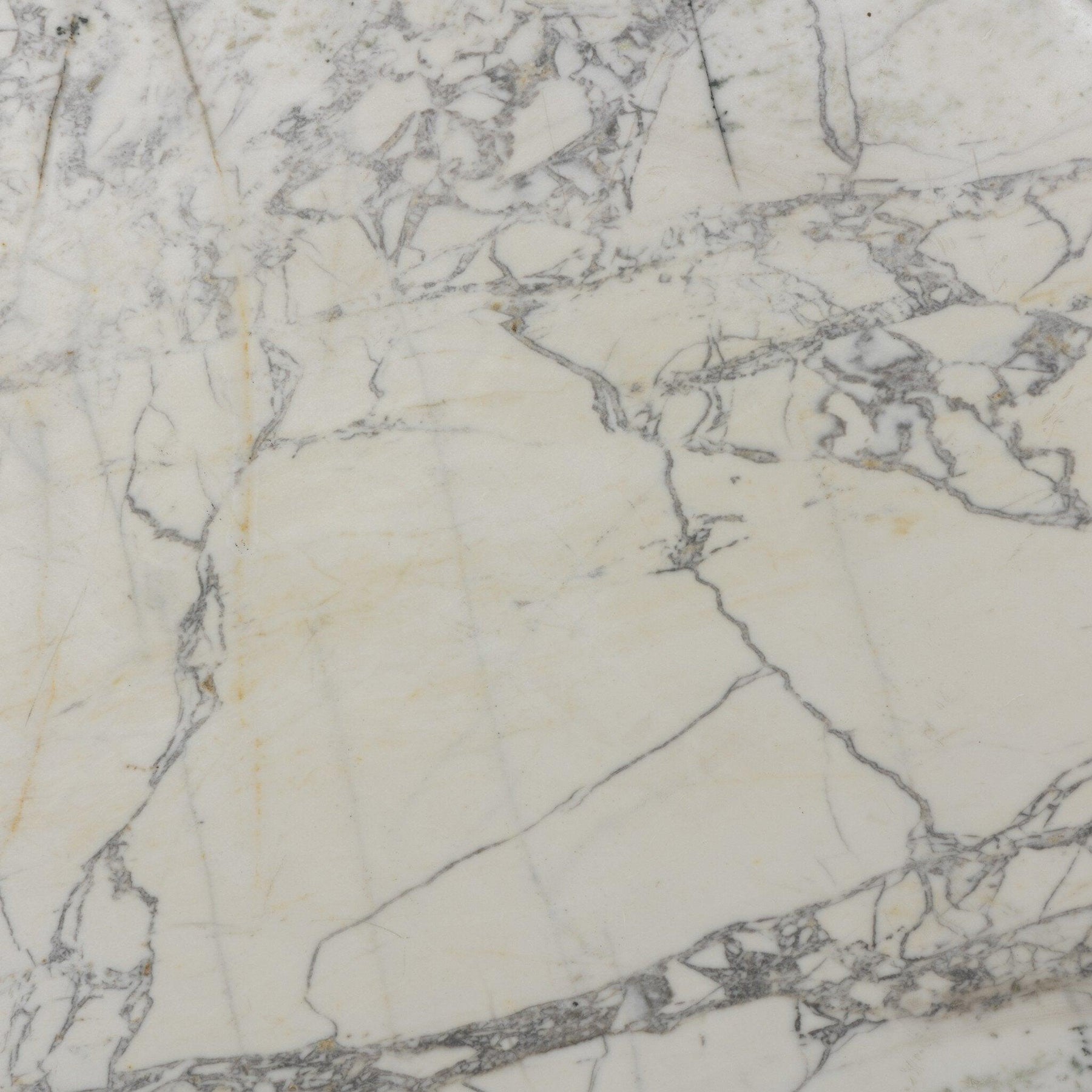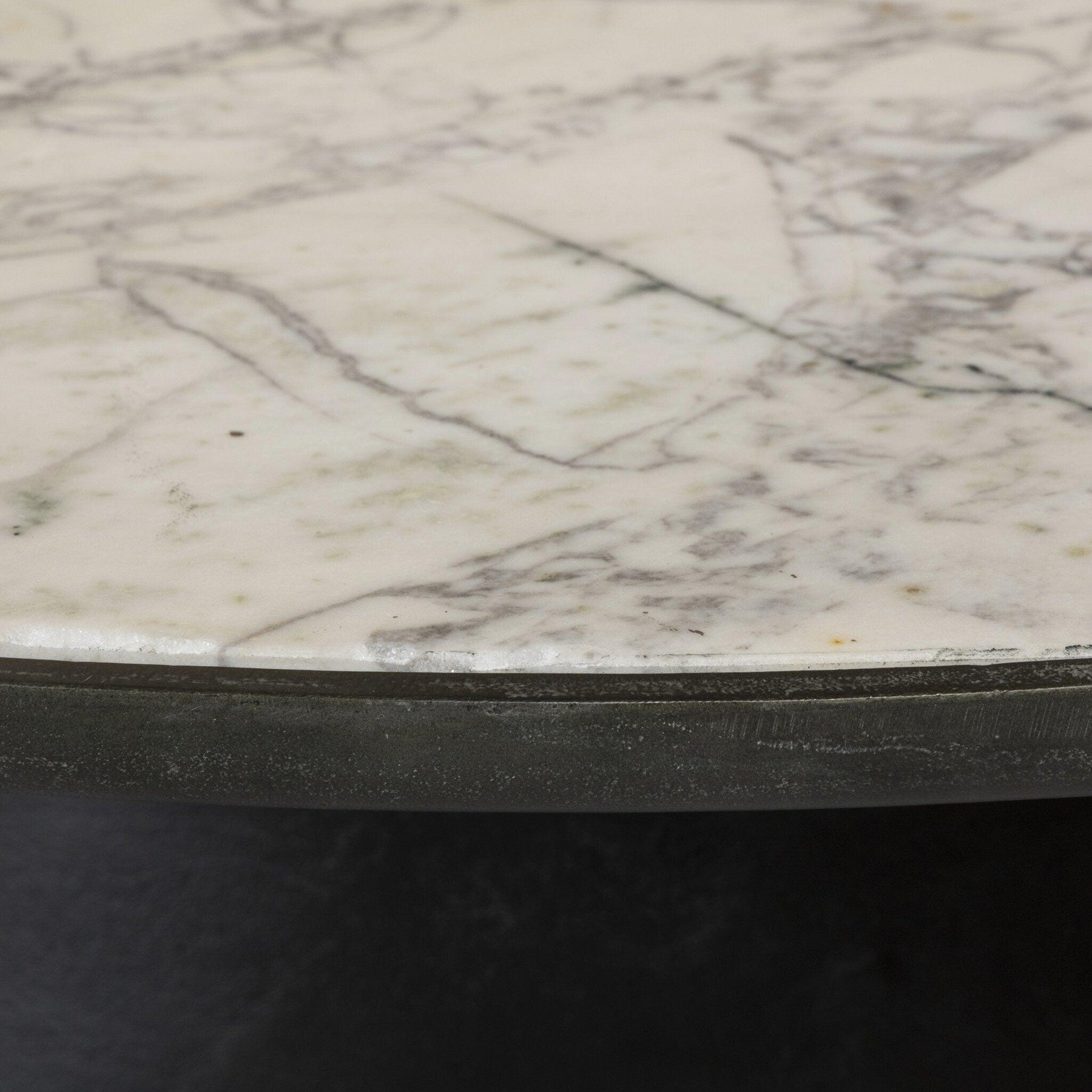 A tulip base of grey-finished aluminum supports a rounded inset tabletop of white marble with beautiful natural veining to finish this outdoor coffee table. Cover or store indoors during inclement weather and when not in use.