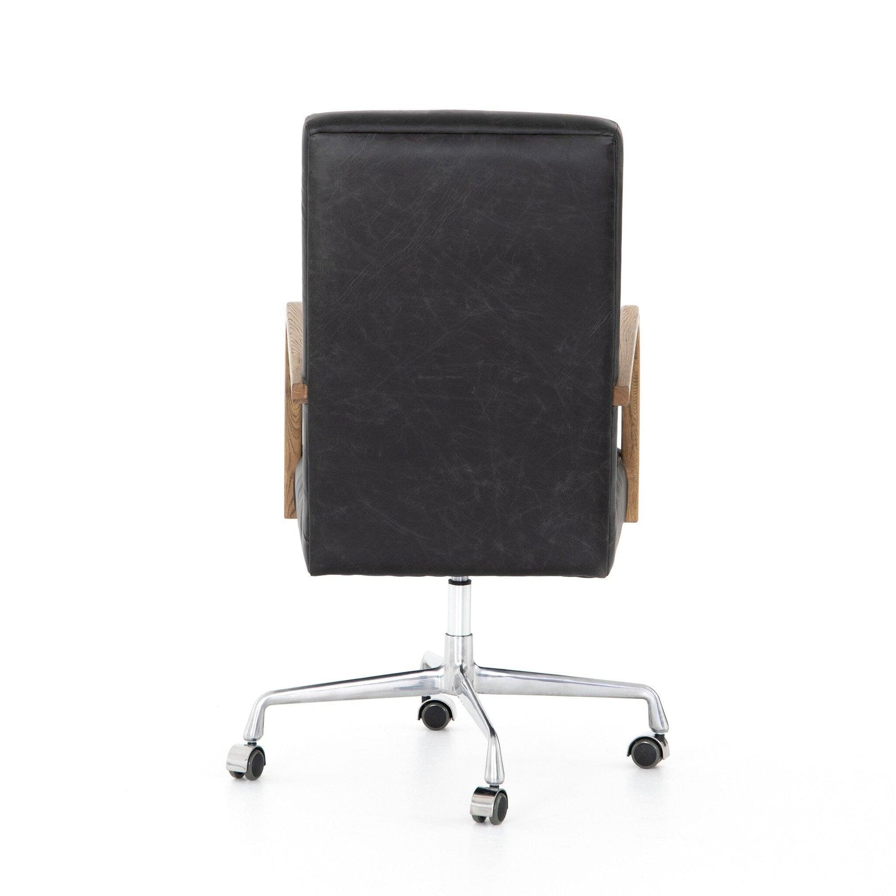High style. Smoky black top-grain leather covers a channeled seat and back which seem to float between elegantly arched arms of toasted oak. Metal casters make for ease in the workplace. Height not adjustable.