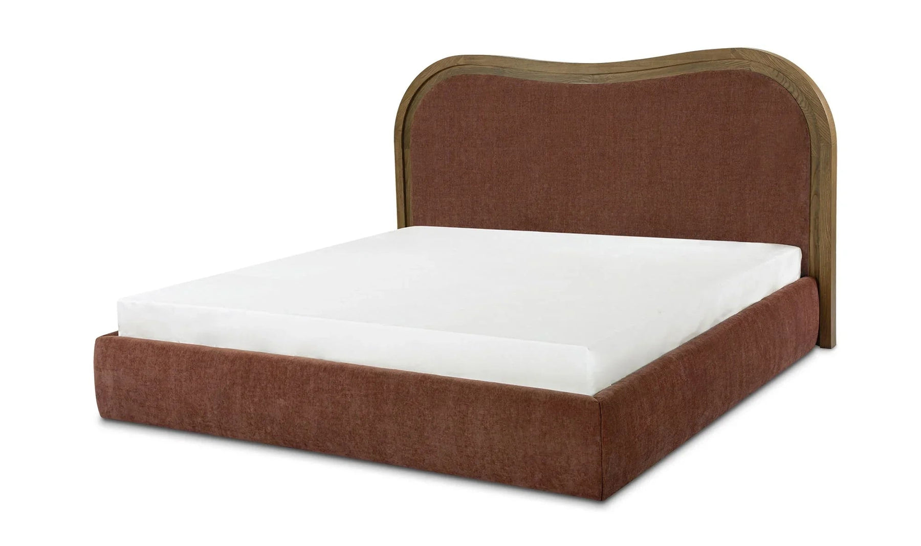 The Camilla bed is our art deco-inspired take on the wave bed. Its solid ash frame exudes warmth with its vivid chestnut color. The upholstered foam and fiber headboard is thoughtfully designed, featuring a stepped-down or inset frame technique that skillfully creates a captivating wave effect.