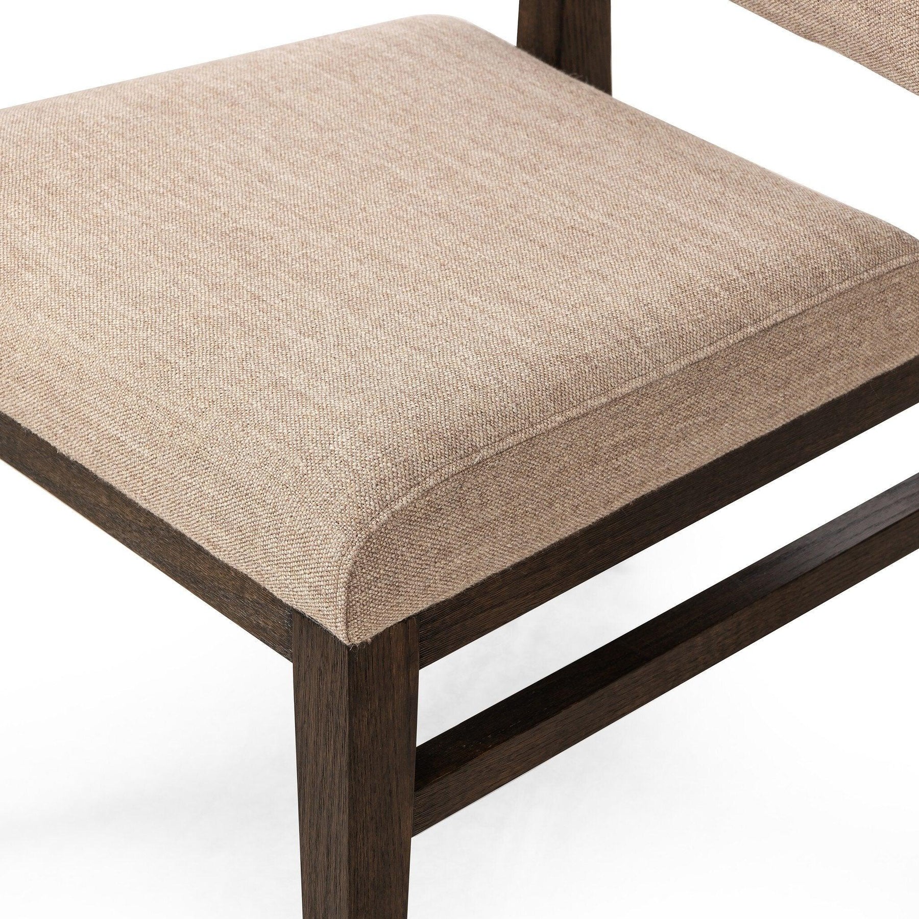 Get back to the basics with this understated modern dining seating. Its simple shape includes a split back design that lets the upholstery peek through. High-performance fabric ideal for everyday dining framed out by dark-finished oak.
