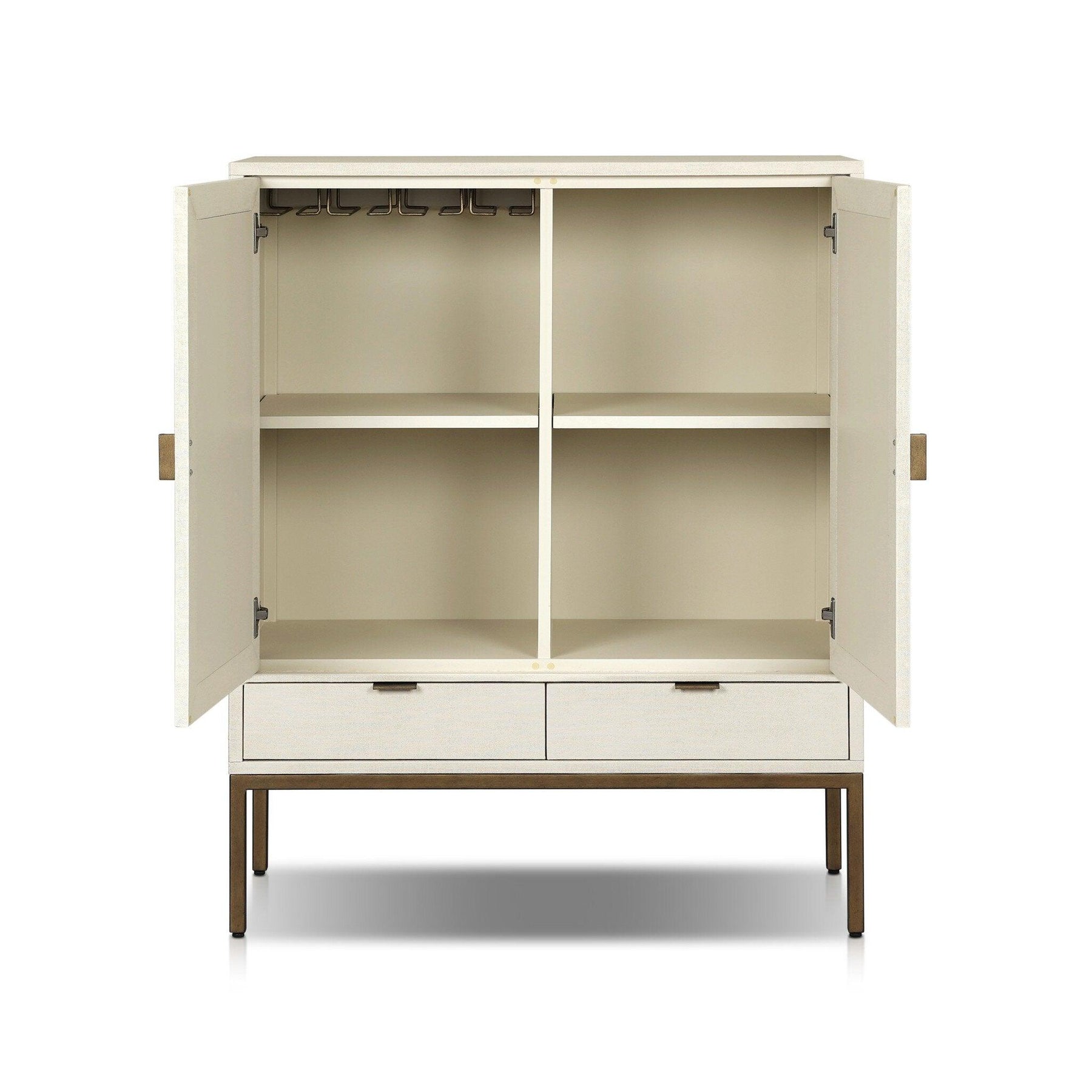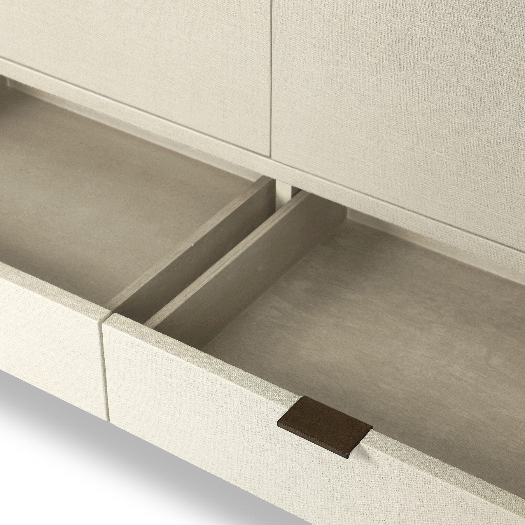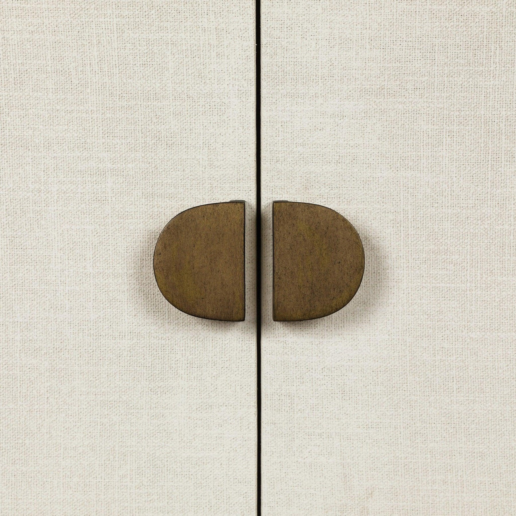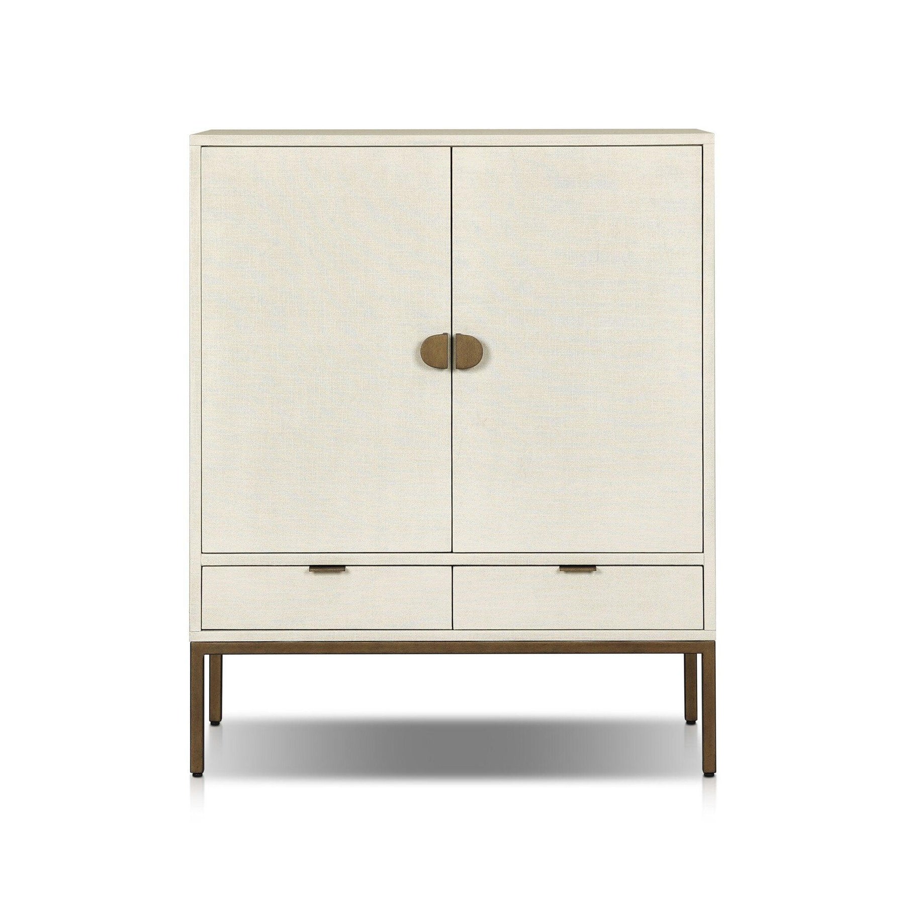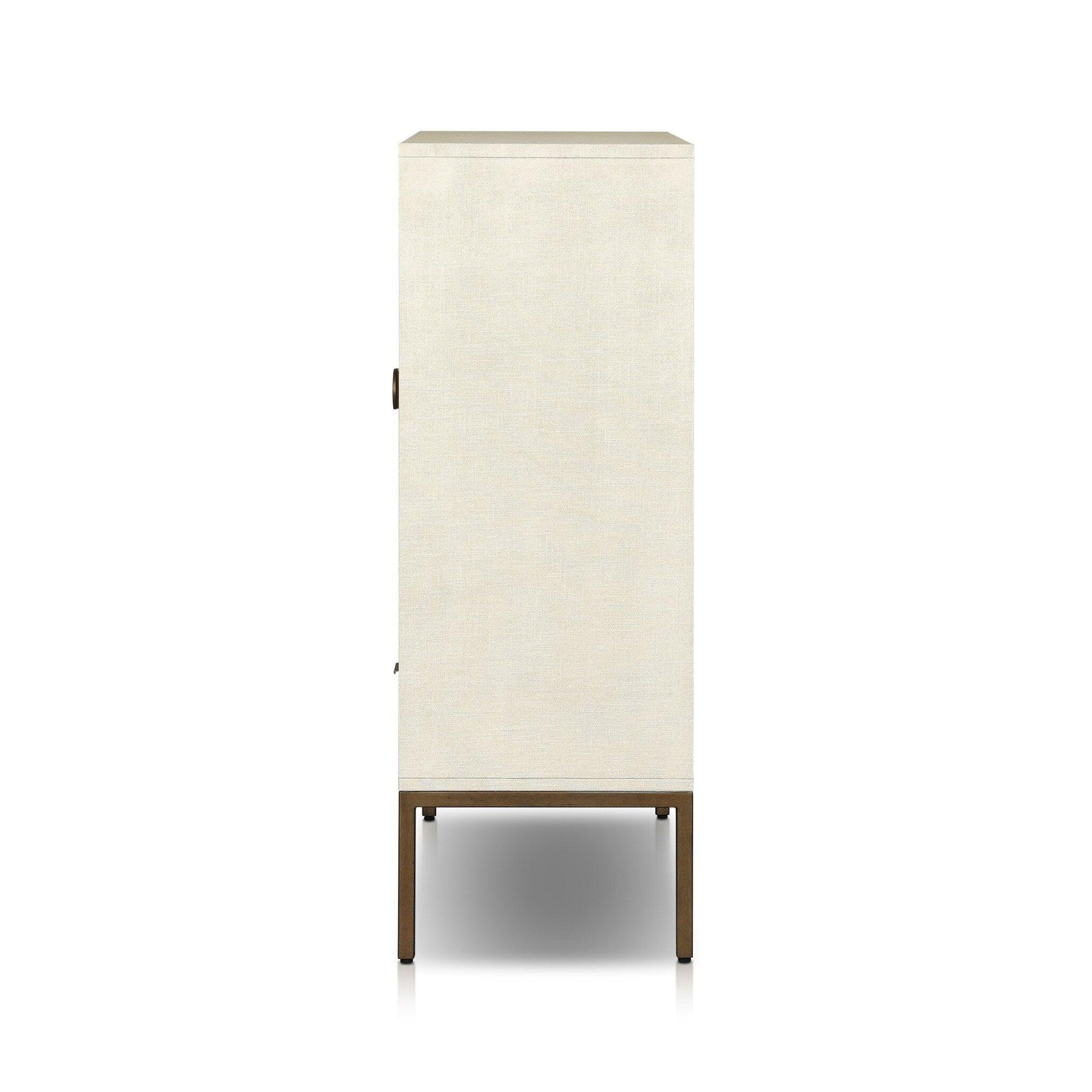 Ivory painted linen pairs with an airy mahogany base for a clean fresh look. Unique half-moon iron is finished in antique brass with two lower drawers for bonus storage.
