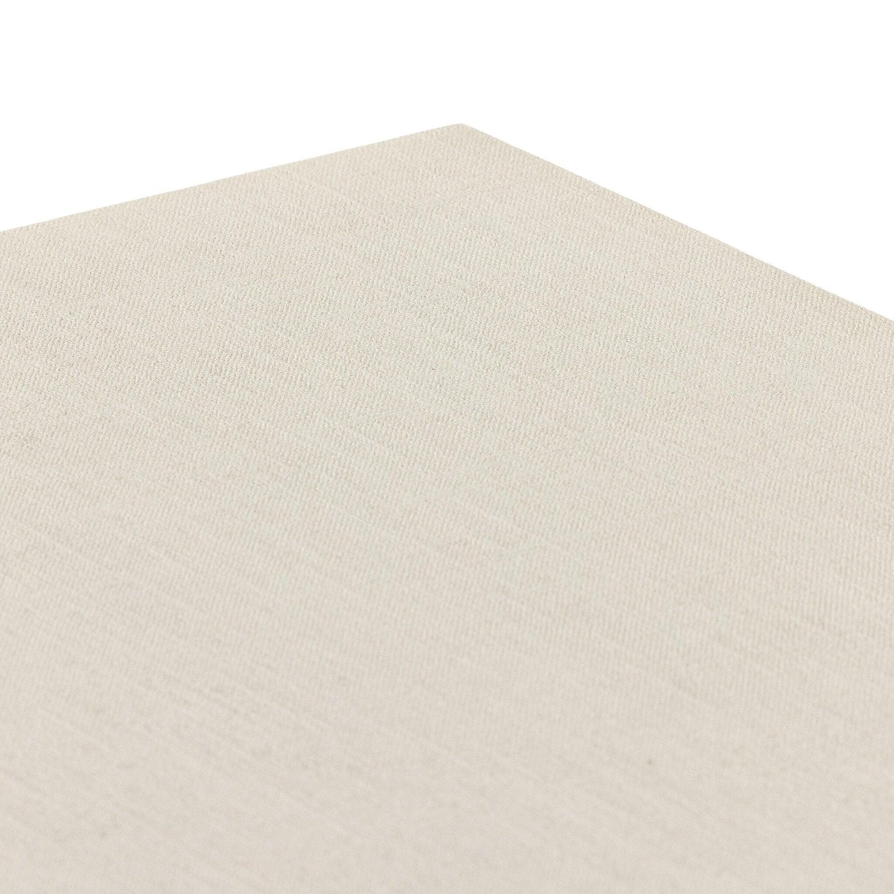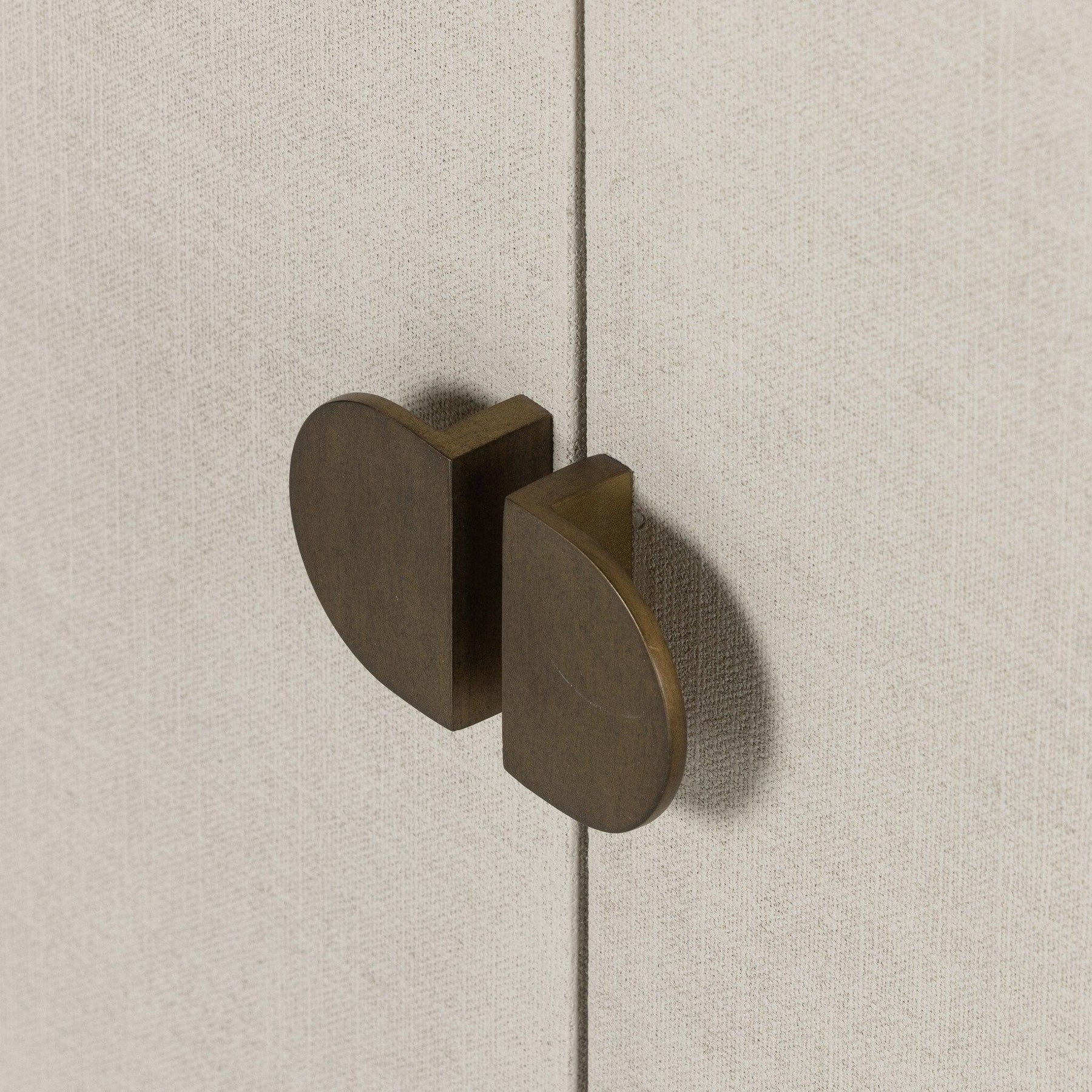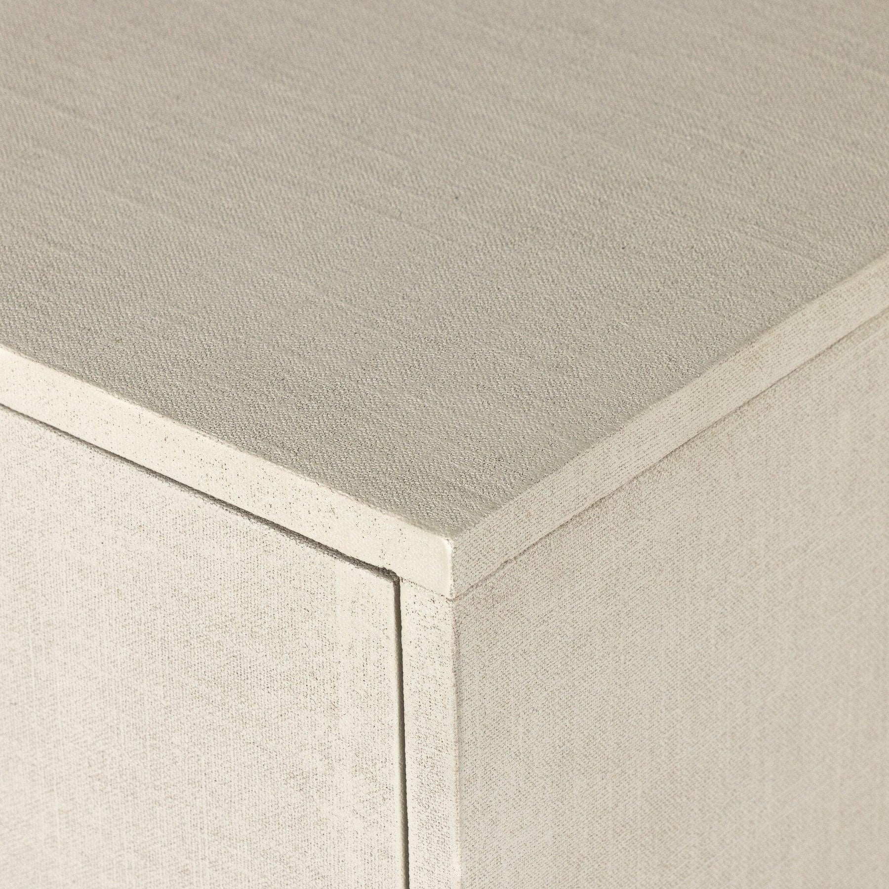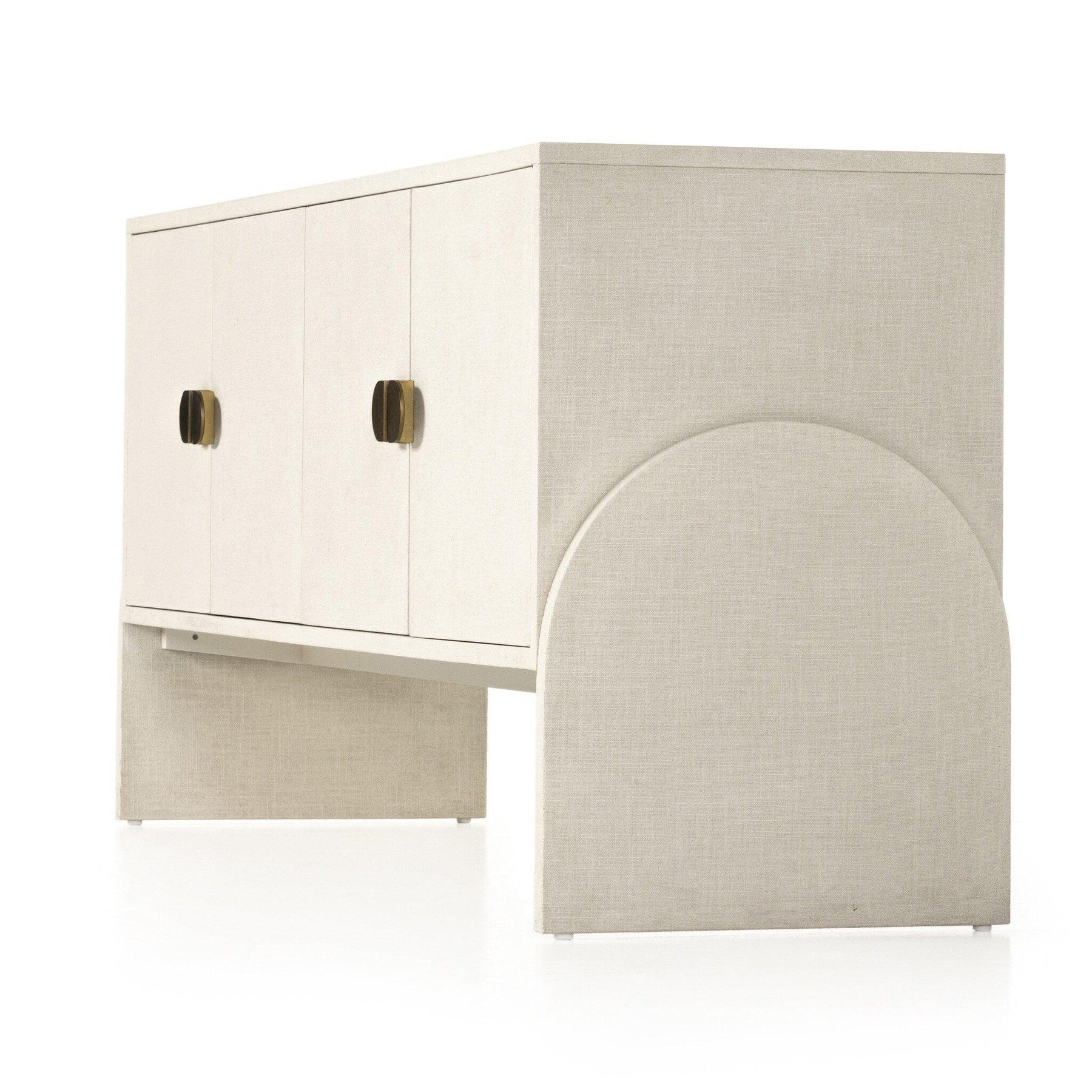 Talk about novelty. Made from painted linen in a light ivory arched legs soften otherwise clean modern shaping. Finished in an antique brass half-moon iron hardware completes the look. Dual rear cutouts for cord management.