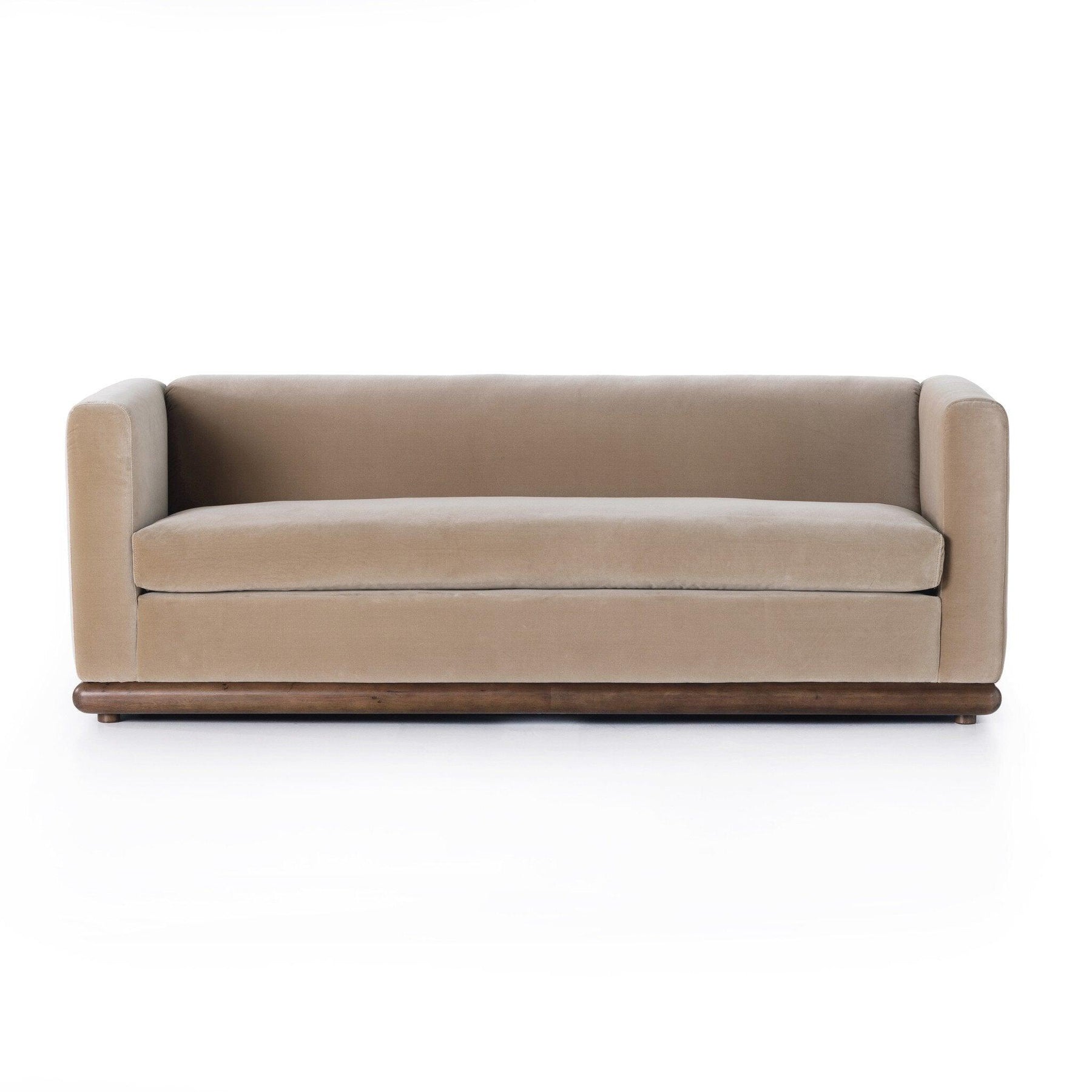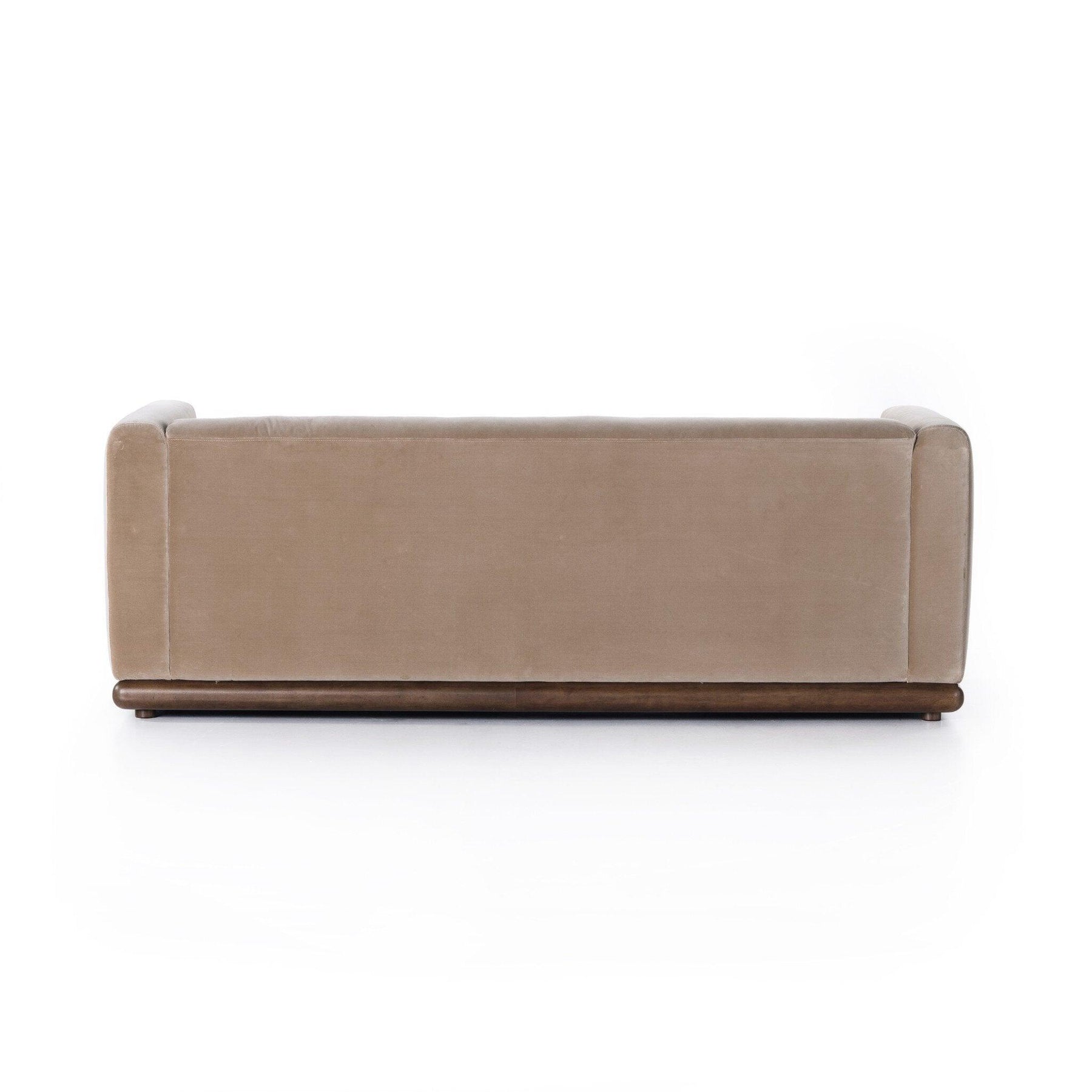 Art Deco gone modern. Velvety taupe upholstery and parawood plinth base fuse for a fresh take on elegant '30s- and '40s-era design.