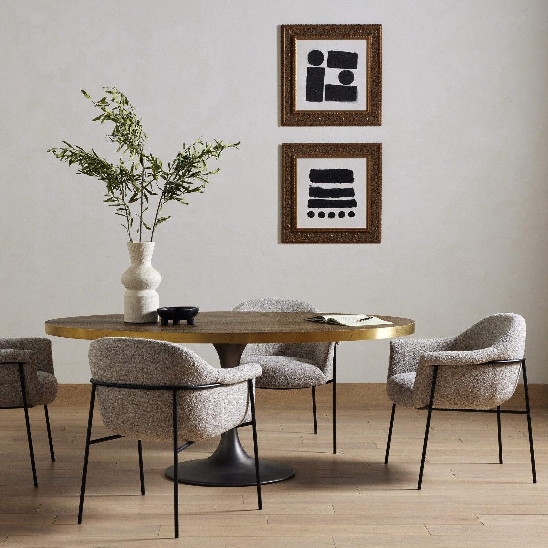 Mixed materials make the table. Classic tulip shaping is recast with a vessel grey iron base and a light burnt oak oval top banded in polished brass steel with exposed nailheads. Seats six comfortably.