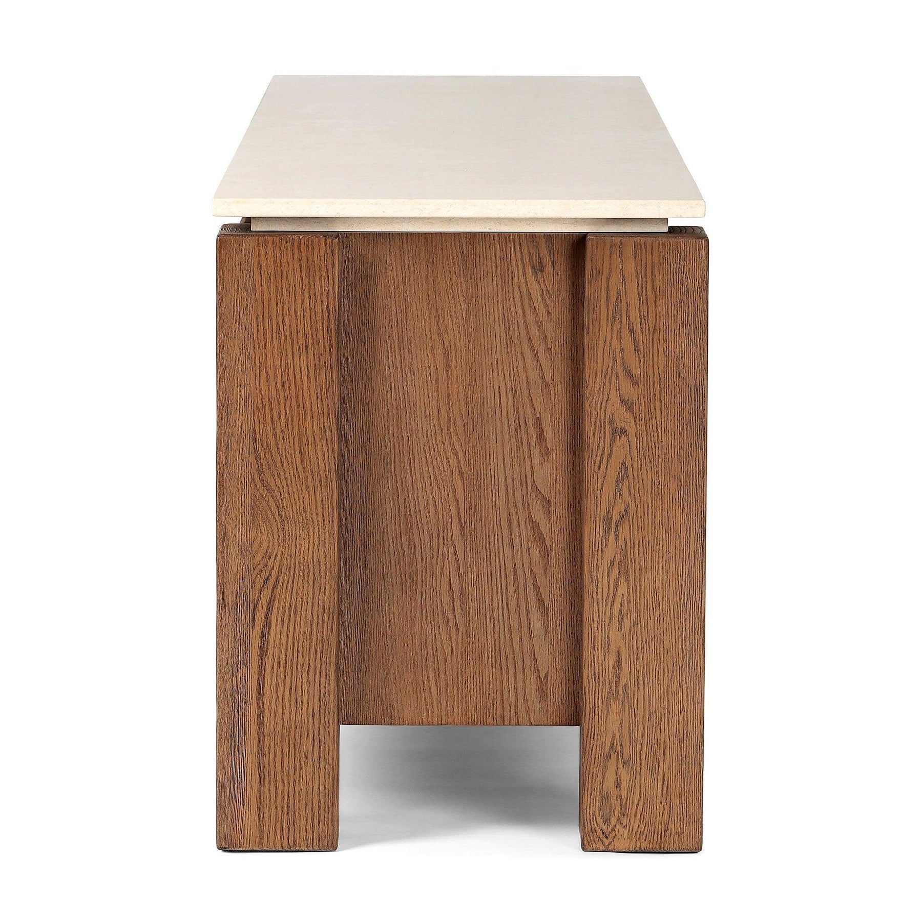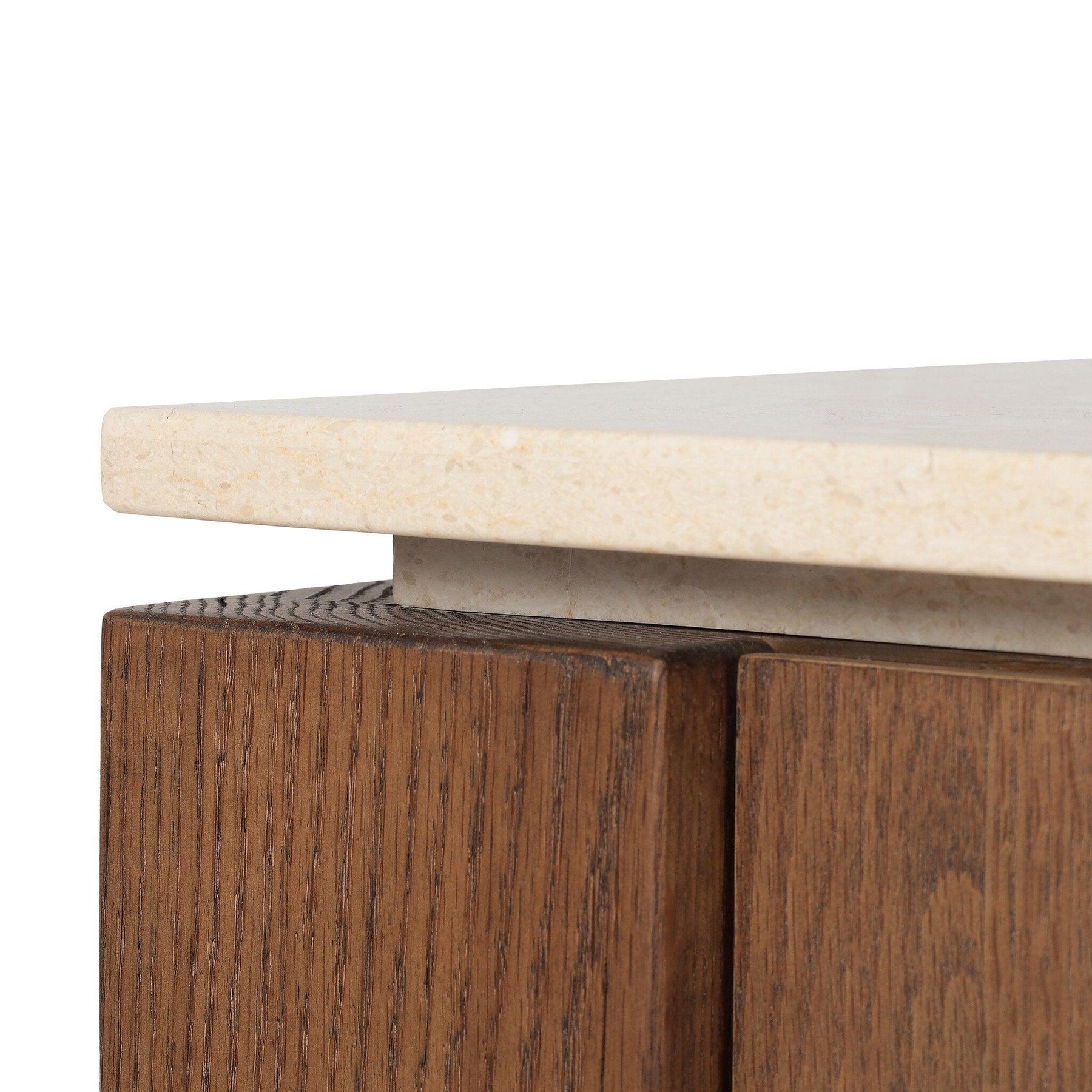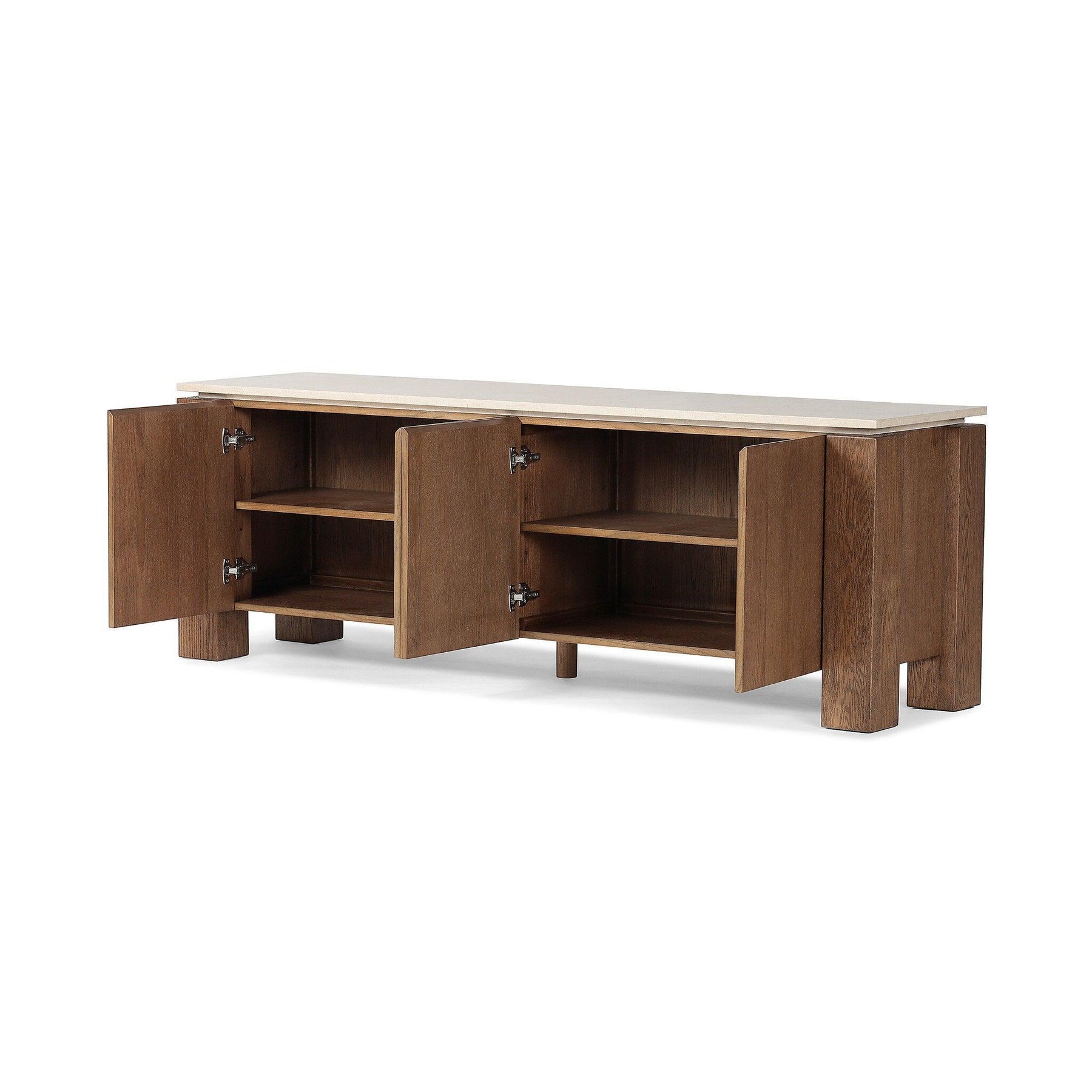 A structurally simple console mixes tan-finished oak casing with a creamy white marble top for a gorgeous material pairing. Inside generous space awaits all your media storage needs.