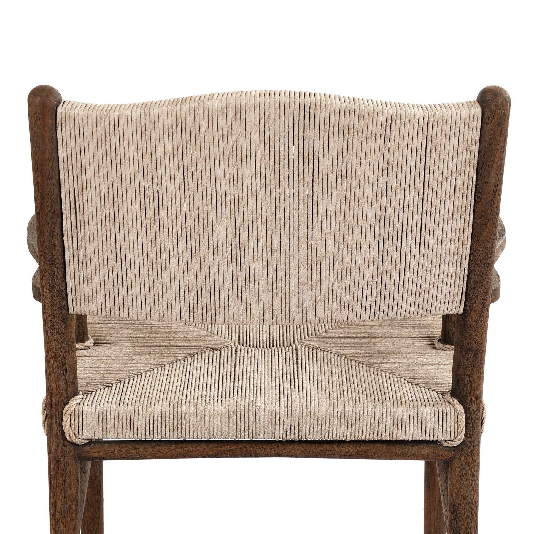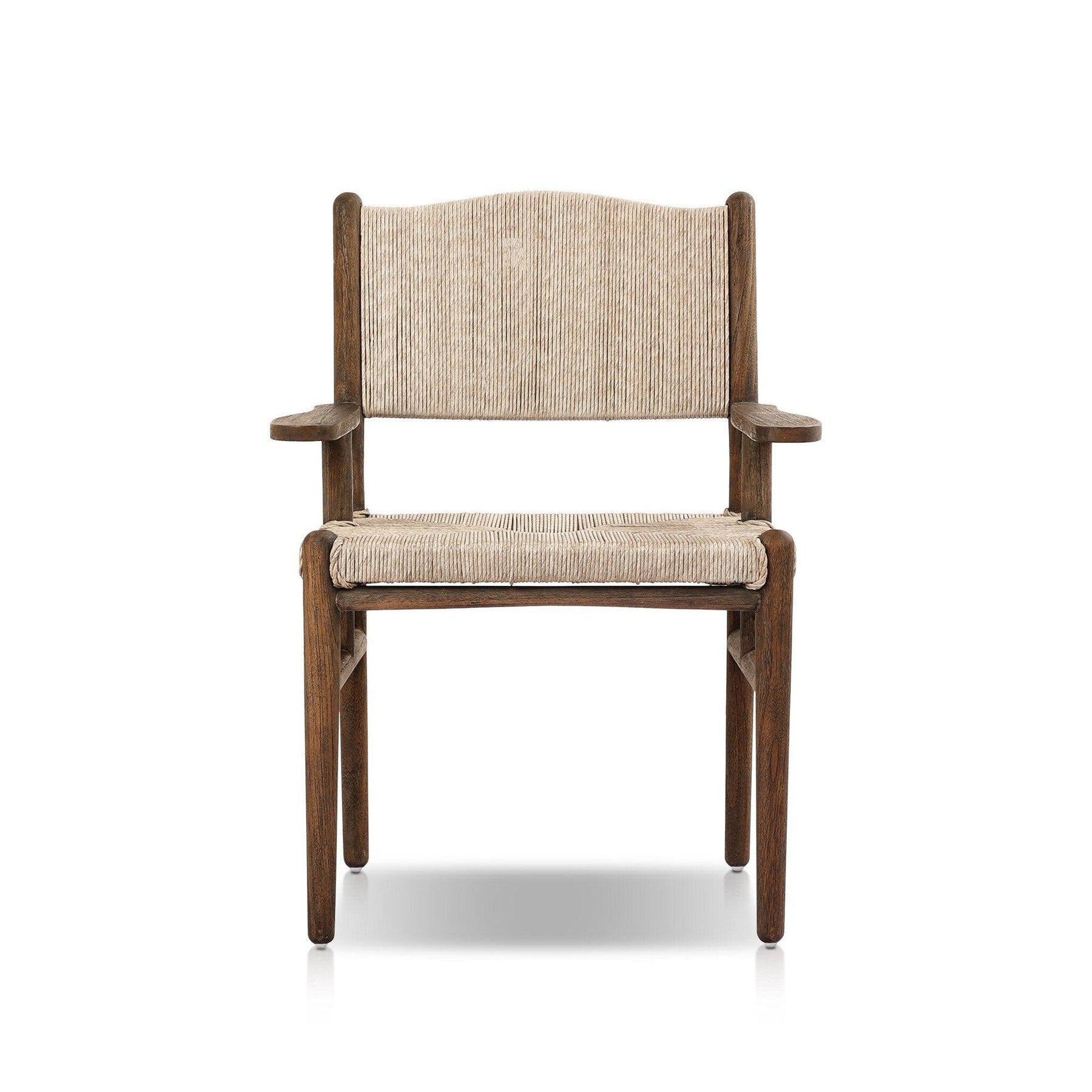 Shaker inspiration. Saddle brown wood frames the woven seat and back of this outdoor dining armchair. Cover or store indoors during inclement weather and when not in use.