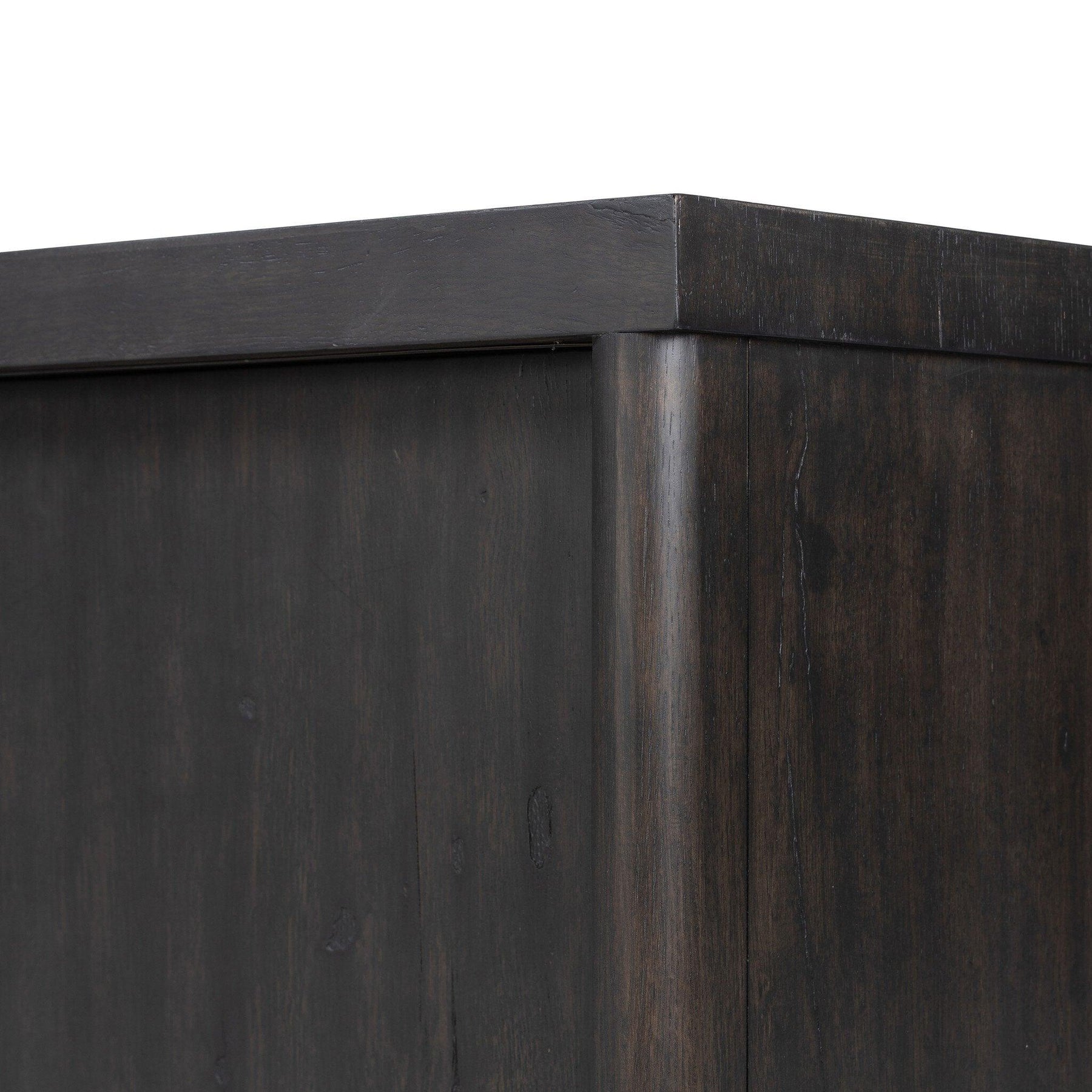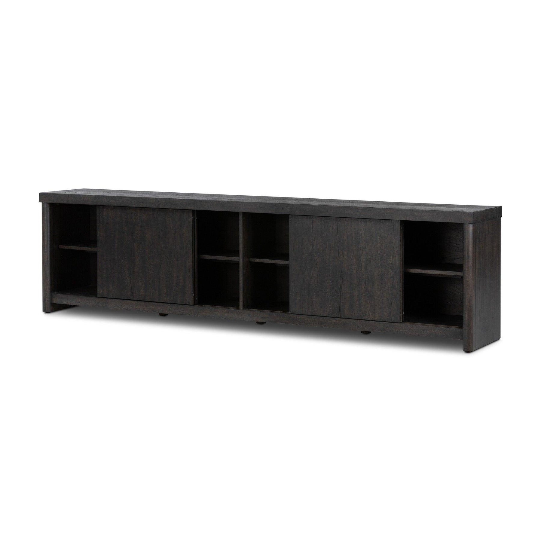 Inspired by European antiques black-finished oak veneer features cracks and weathering for a character-rich look. Sliding doors open to reveal generous storage space for media with rear cutouts to keep your cords out of sight.