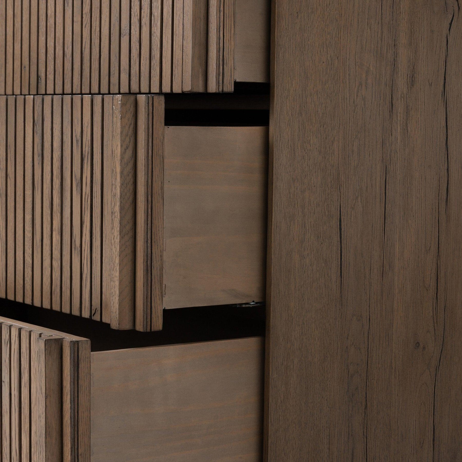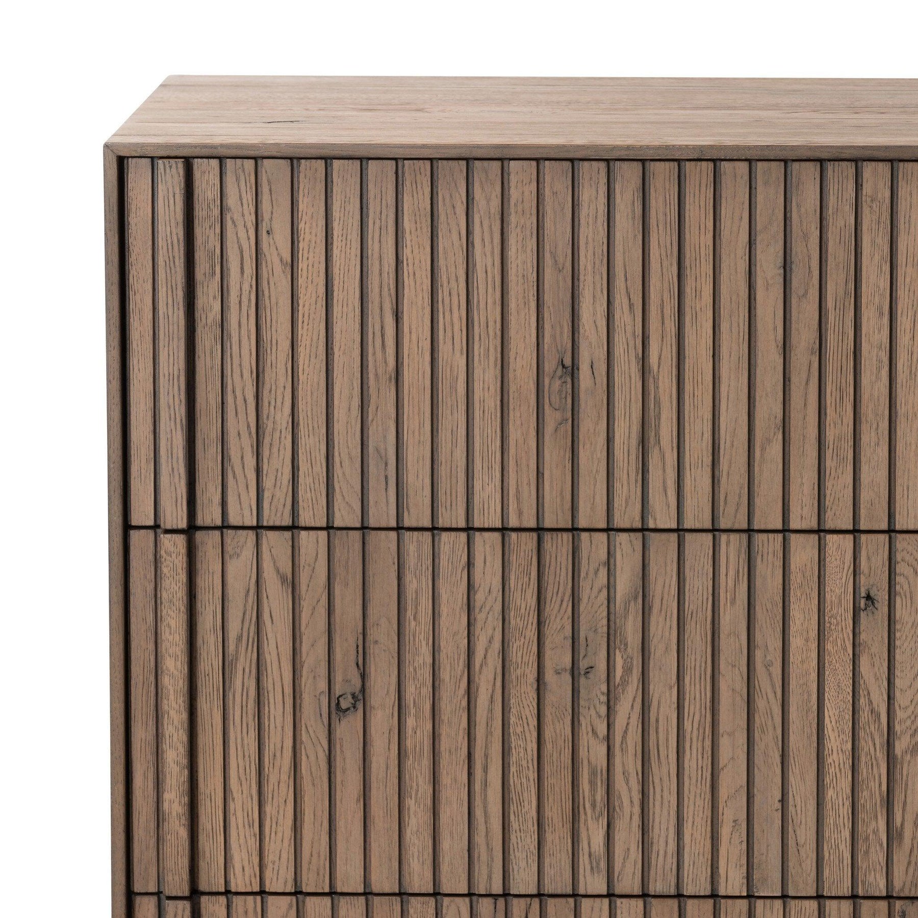 Designed by Thomas Bina and Ronald Sasson a design partnership blending both modern minimalist and Brazilian influences. Crafted from solid oak this clean-lined dresser features vertical reed detailing on the drawer fronts with wooden pull detailing on the outer edges. Drawers are finished with soft close under-mount drawer glides. This item has been modified to comply with the STURDY Act. See a full list of modified products and data changes in the “STURDY Act” file in the Downloads section below.