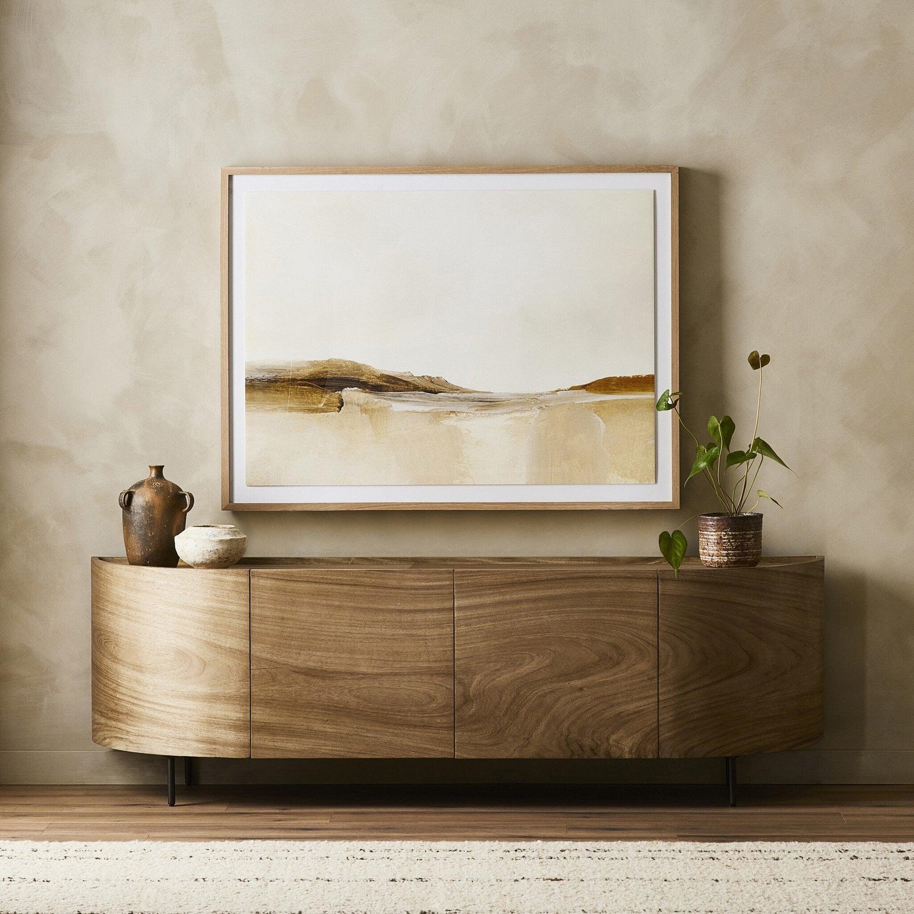With soft shaping and inset top inspired by classic jewelry setting caramel-finished Guanacaste forms a beautifully sculpted silhouette with natural high and lowlights coursing the entirety of this richly styled sideboard.
