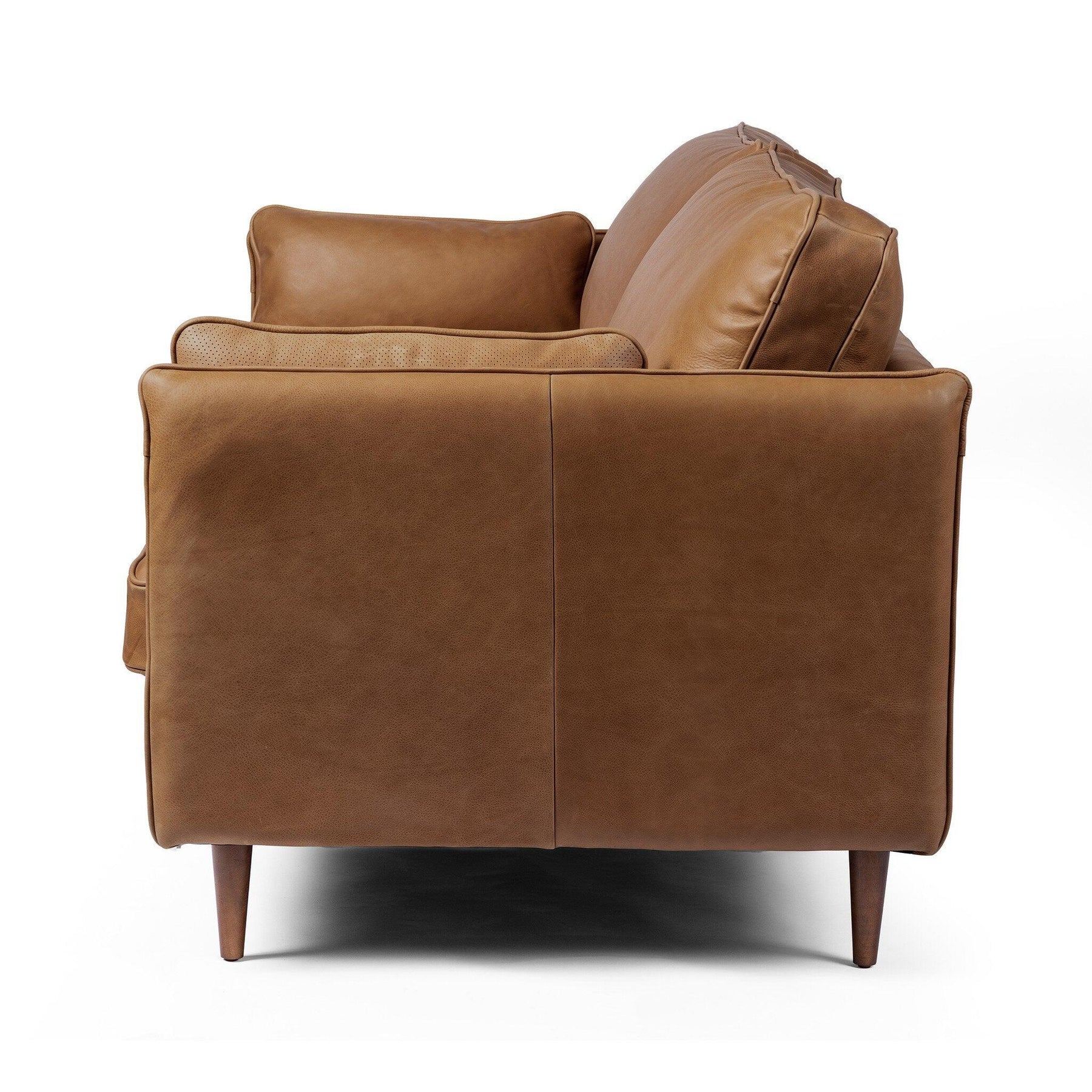 Effortlessly on-trend. Two-cushion seating of top-grain leather with knife-edge pillows and welted track arms. Almond-finished legs taper for a modern touch atop midcentury influence.