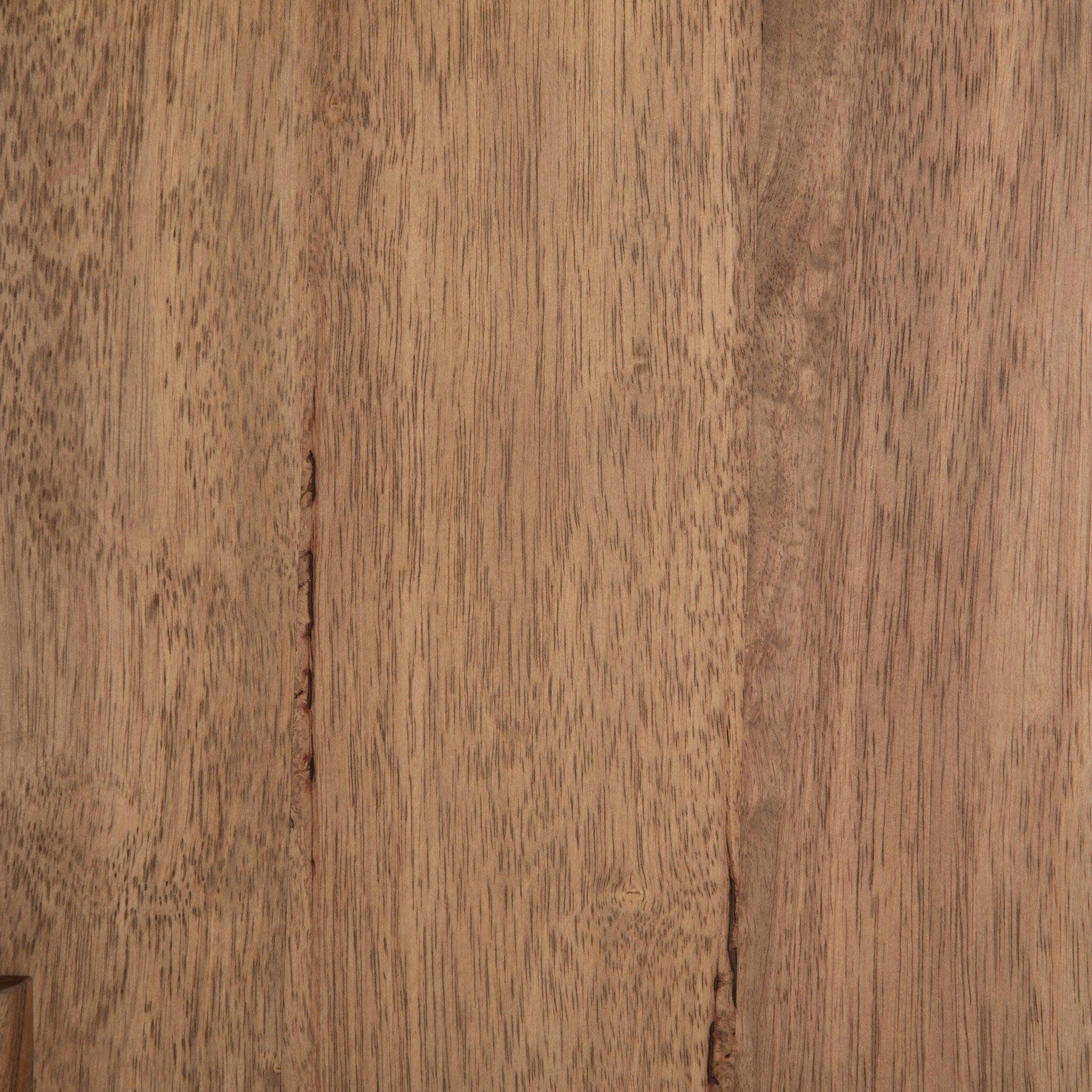 A midcentury form with Shaker spirit. Finished in a smoked honey a clean-lined parawood console sits in an arched cradle base of toasted acacia. Twist-lock metal hardware adds a clever finishing touch. Rear cutouts for media cord management.