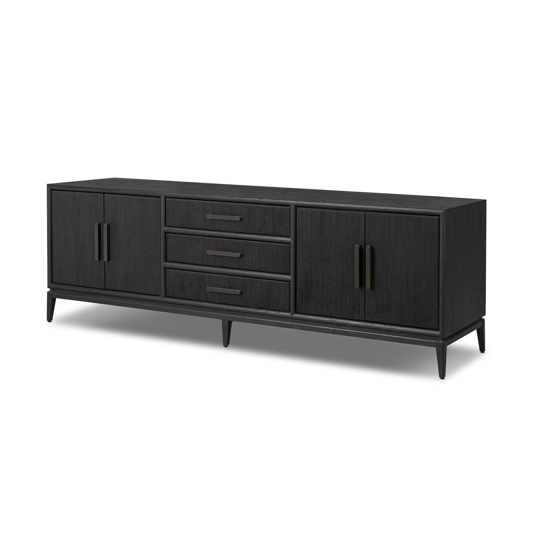 Elevate your media or living space with a console of black-finished oak. A smooth top pairs with three drawers and two cabinets each covered with woven paper cord. The result: a dark Scandinavian-inspired look that will work into your collection beautifully.