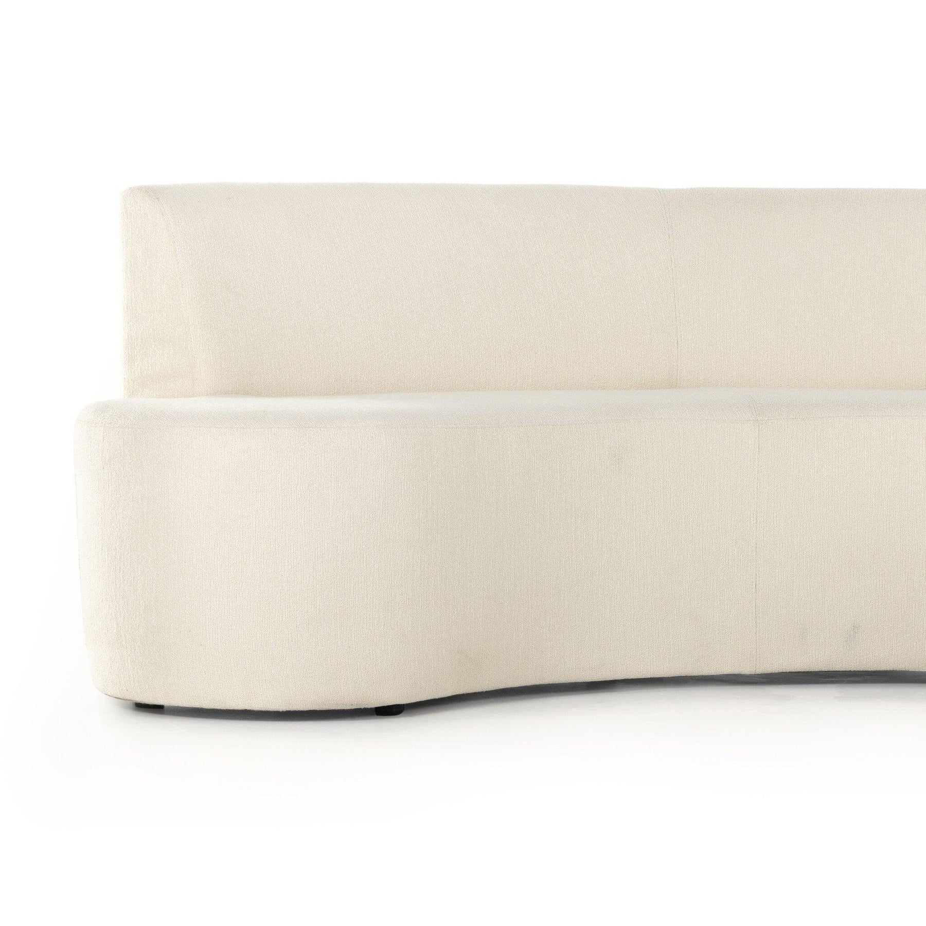 Dramatically shaped and tightly tailored ivory high-performance fabric places a sensible twist on an elegant banquette-style dining bench.
