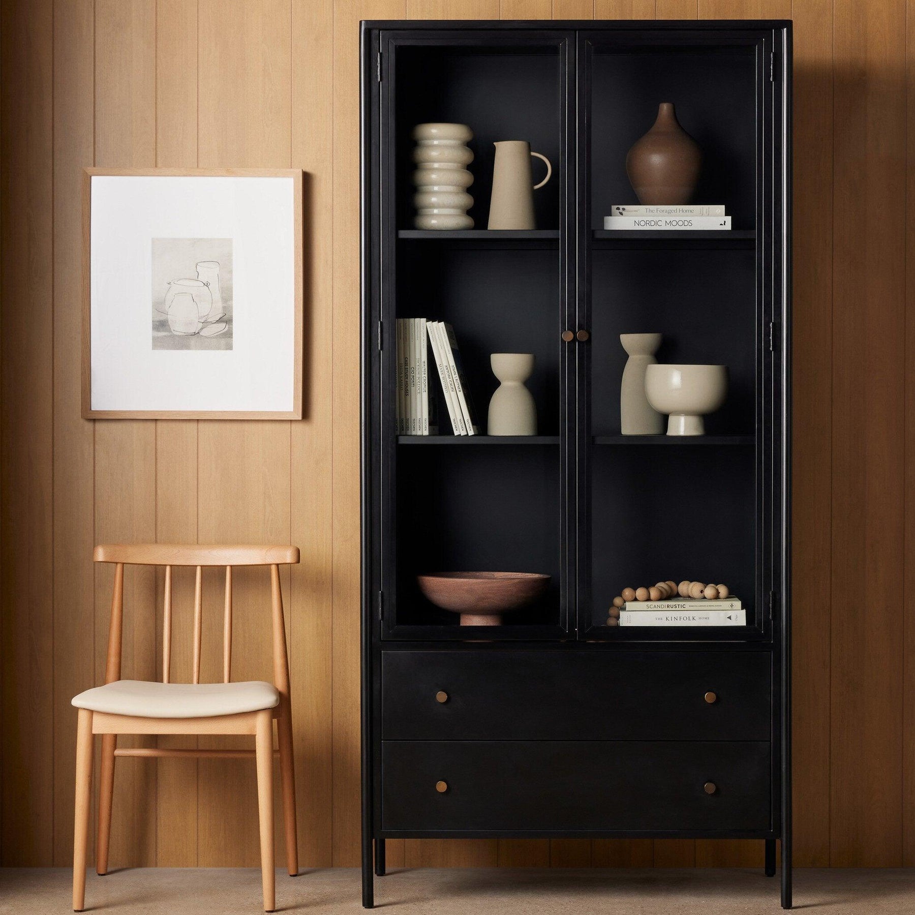 Bring a softened industrial look to the office or living room with spacious cabinetry made from black-finished iron featuring bronzed iron hardware for modernity. Glass-front doors allow endless storage and styling options to showcase favorite books and treasures.