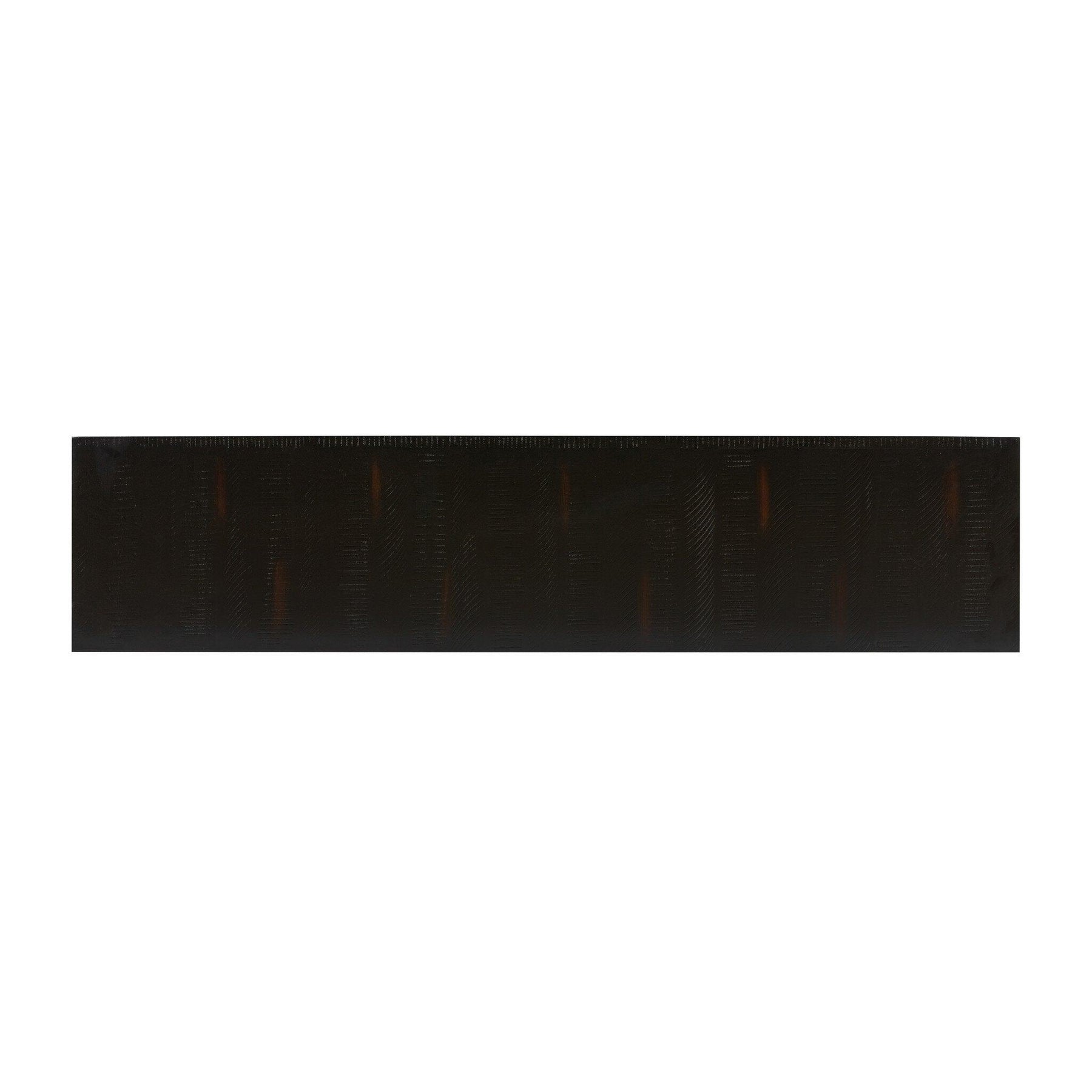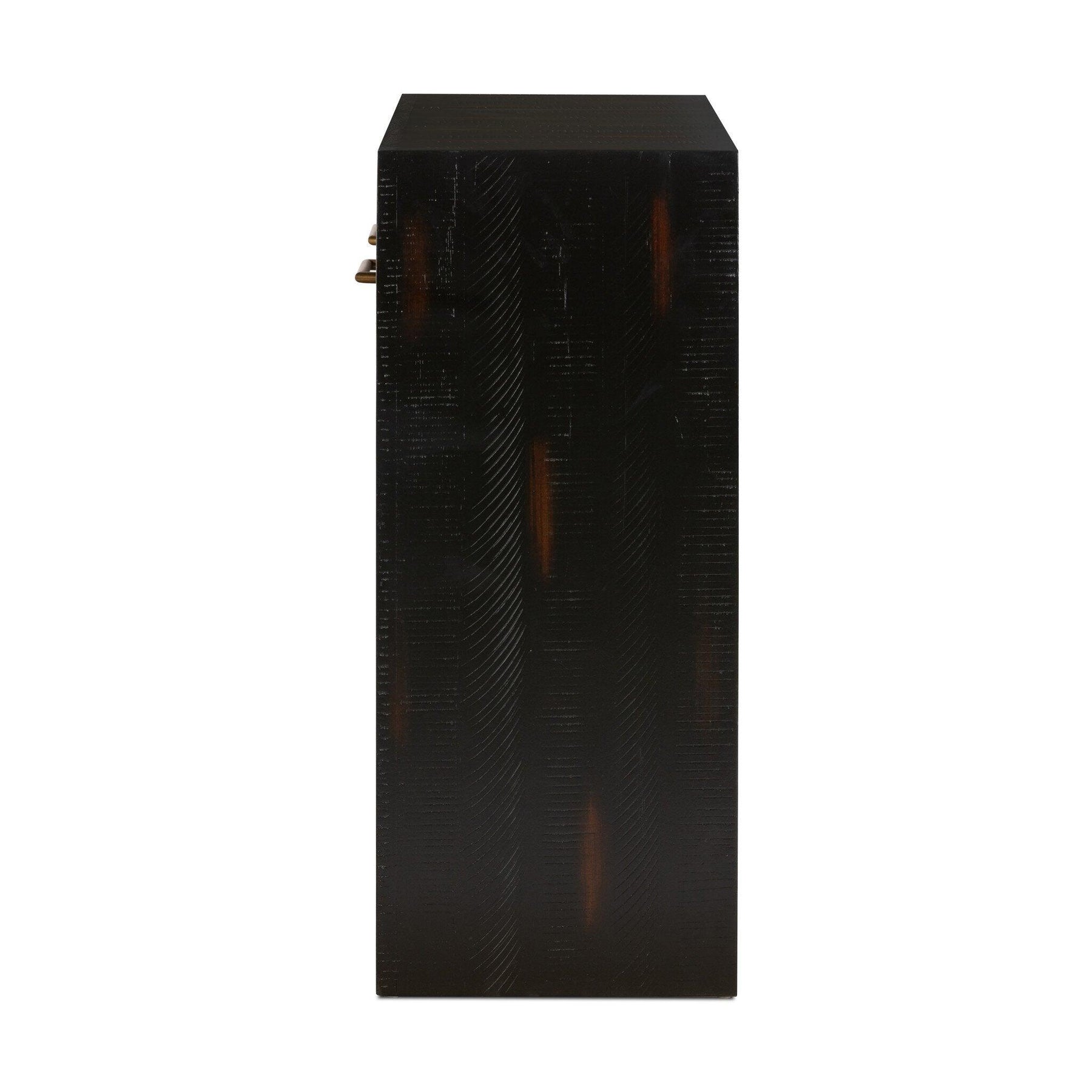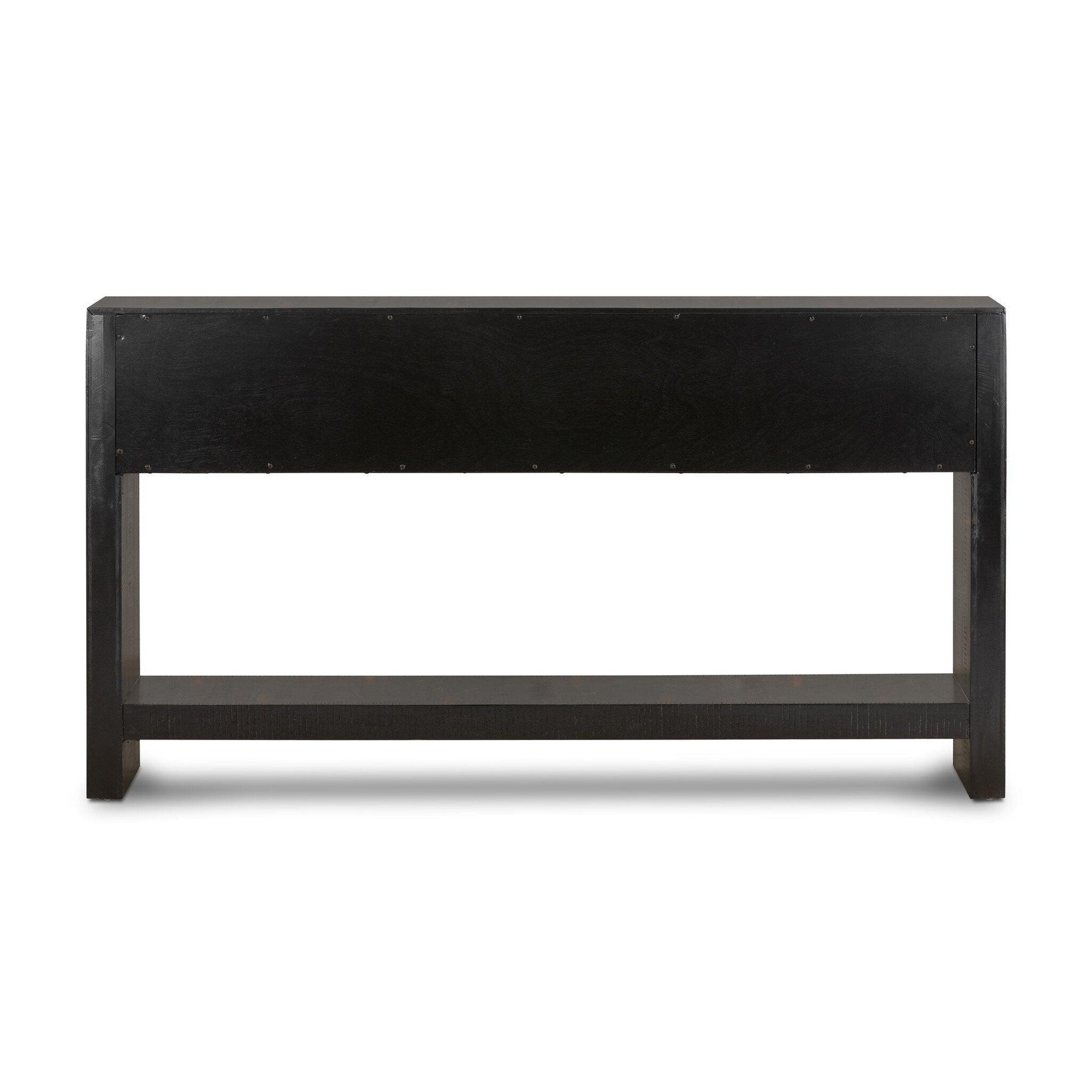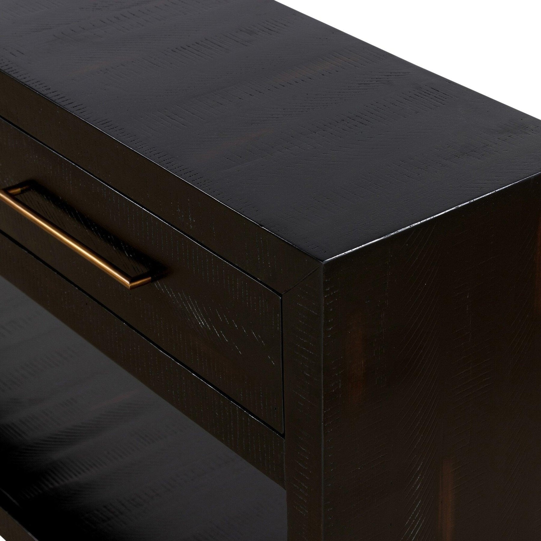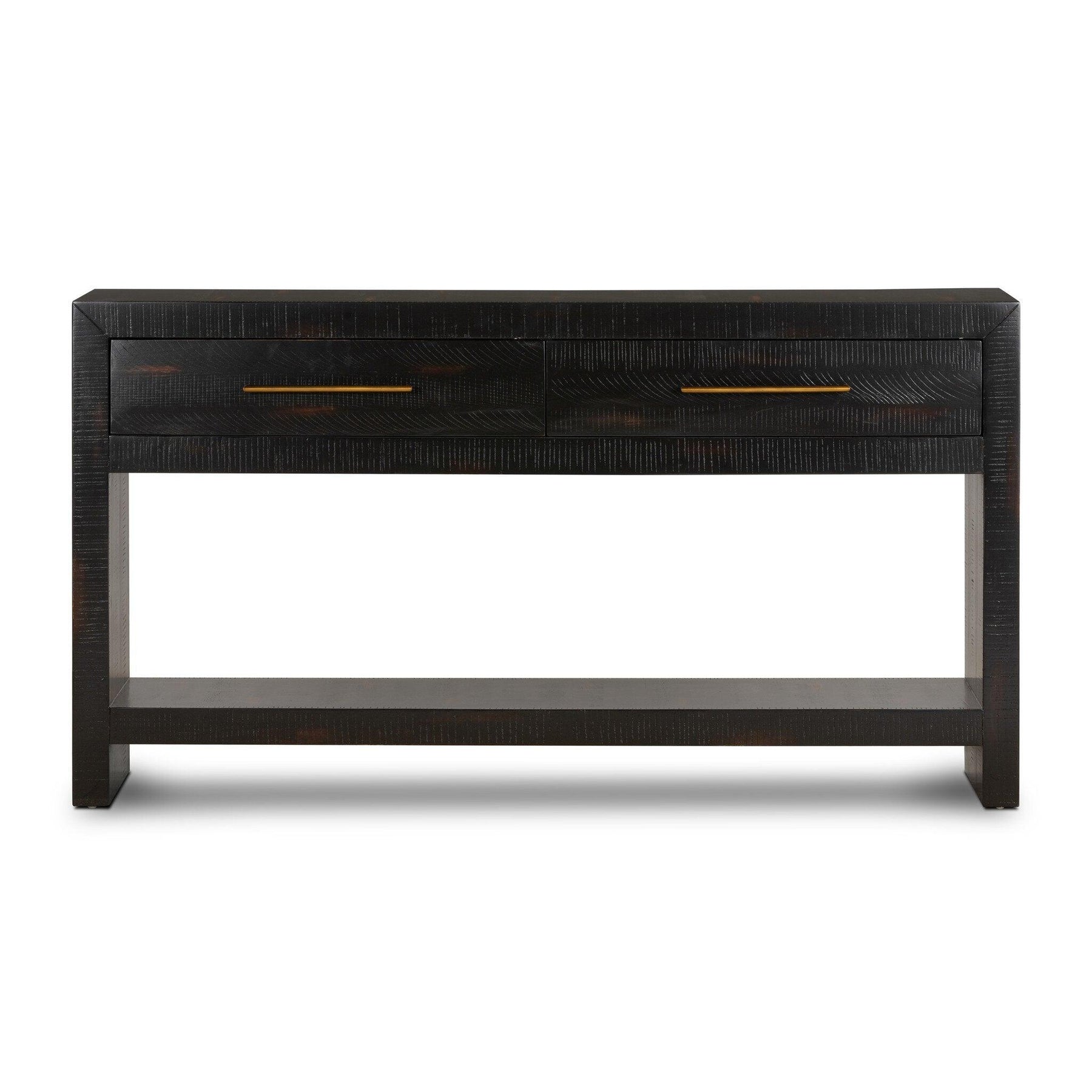 A hand-rubbed burnished black finish draws the eye with high-low contrasts to modernize a mid-century shape. Brass-finished hardware adds a sleek touch to console's spacious dual drawers.