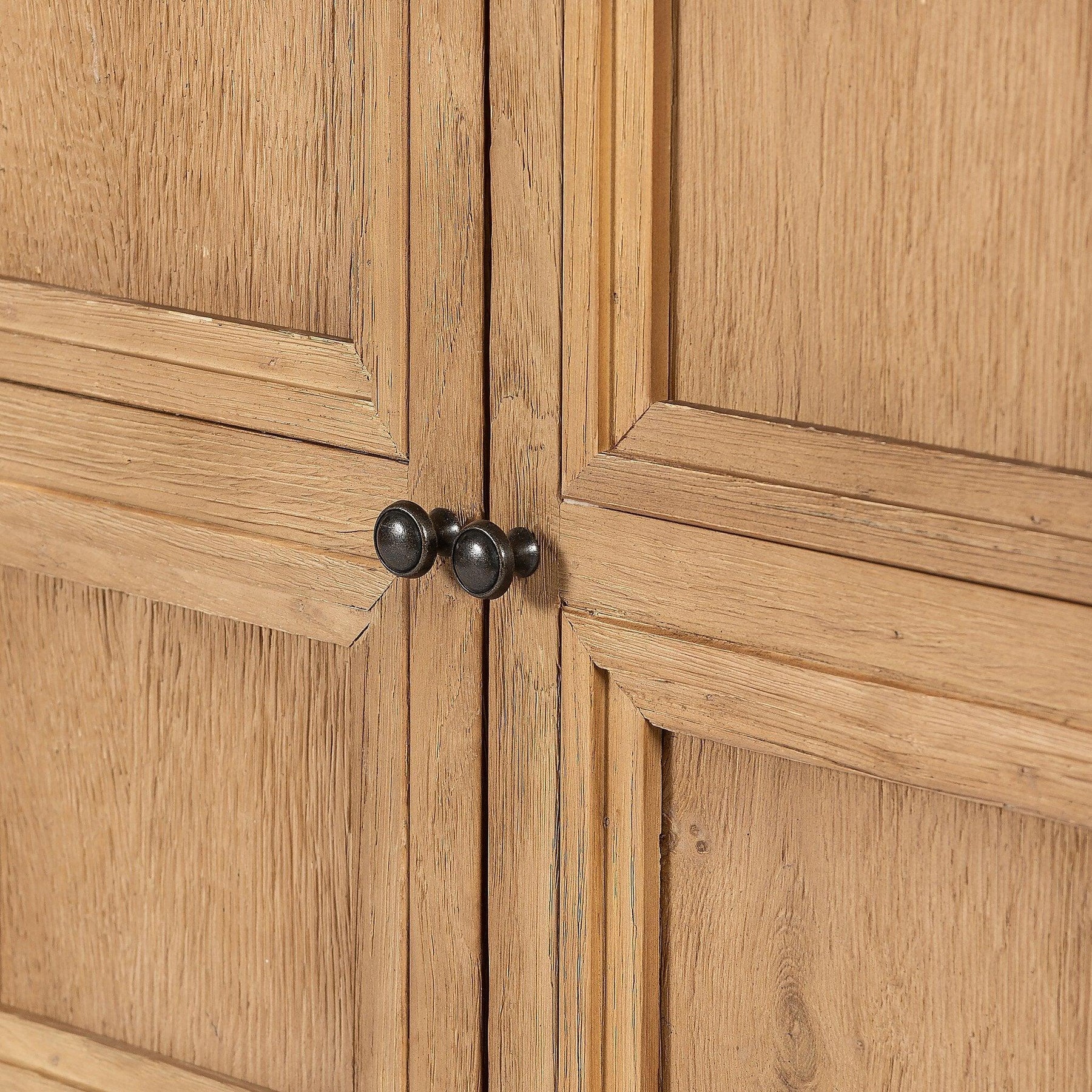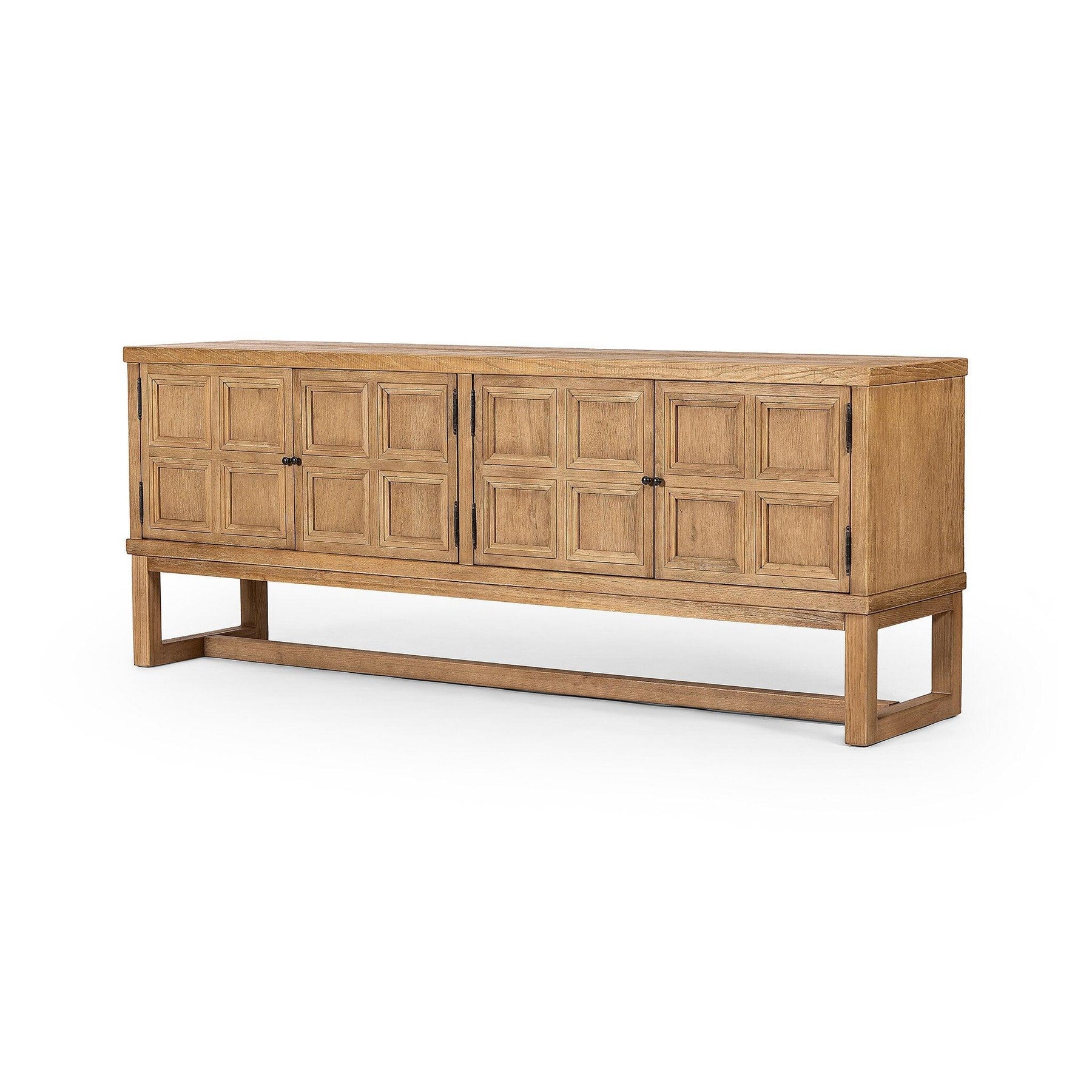 A spacious console of worn oak features paneled doors lending texture to a clean-lined design.