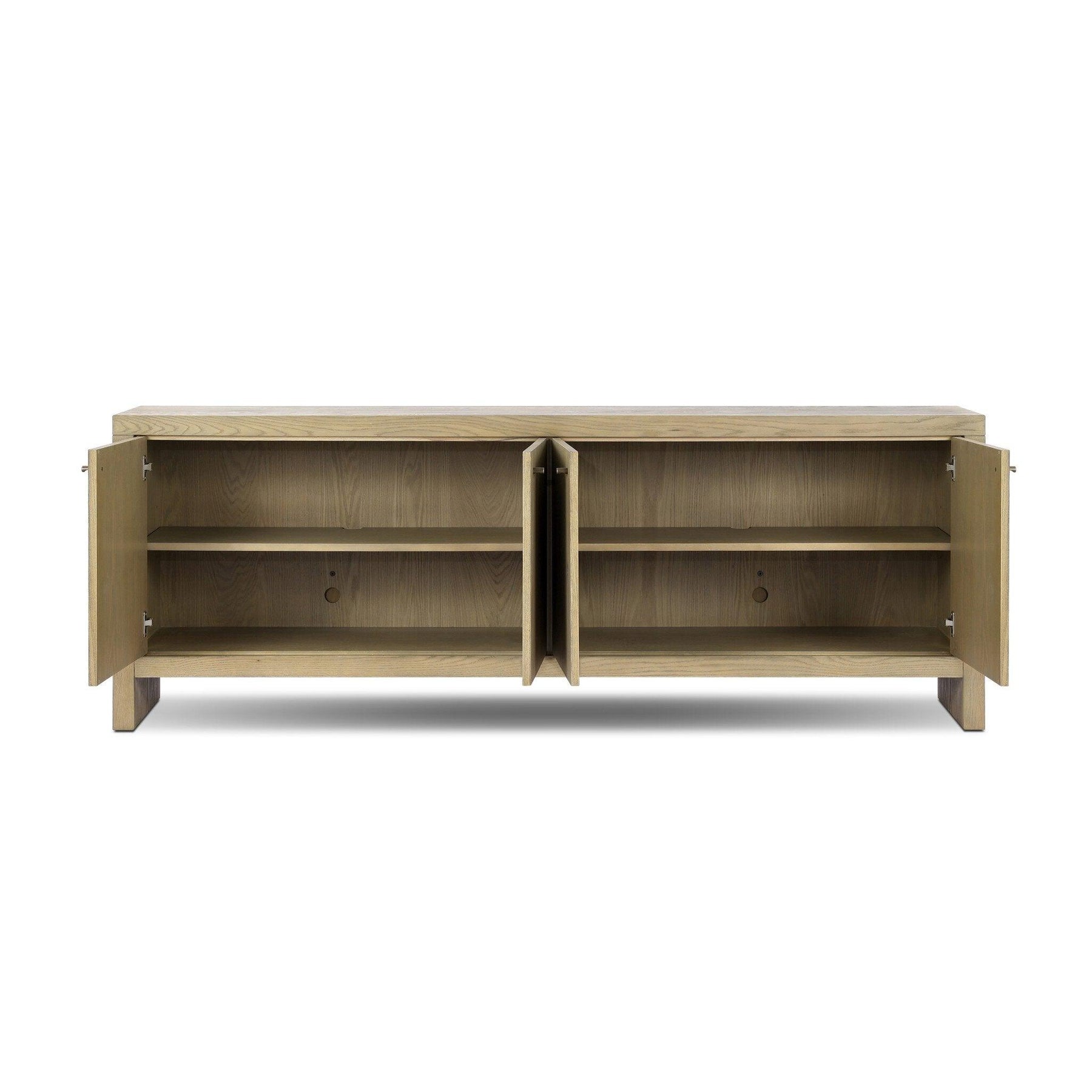This sideboard pairs a waterfall-inspired leg design with large slabs of resawn umber oak with small simple hardware for a piece that is both modern and understated.