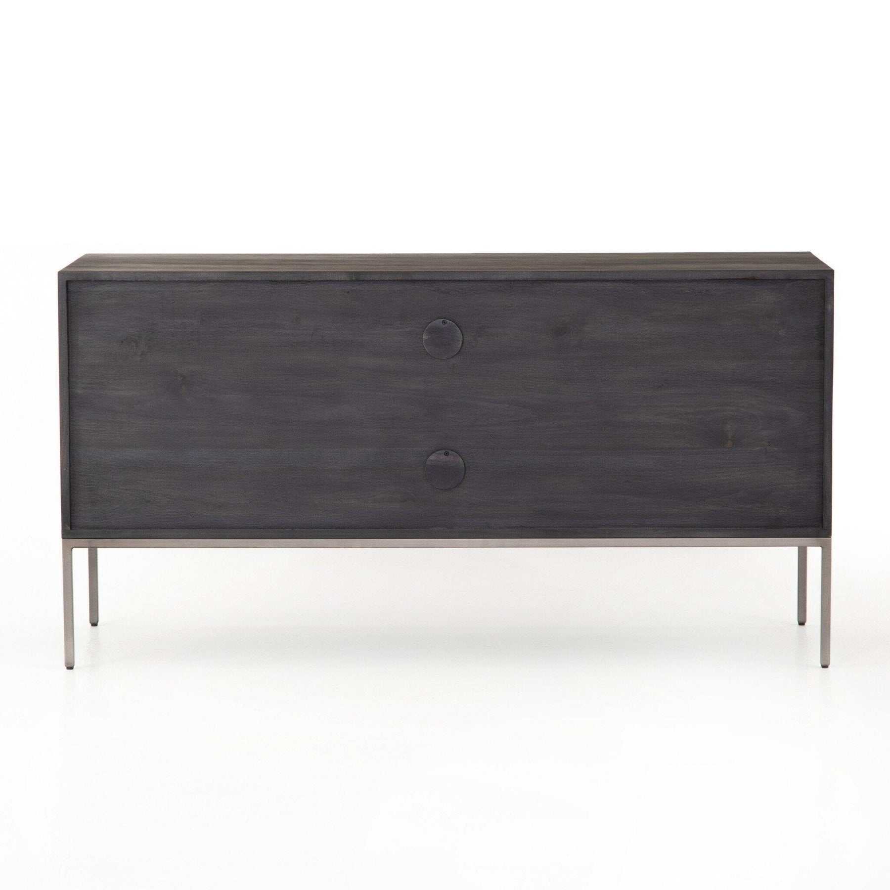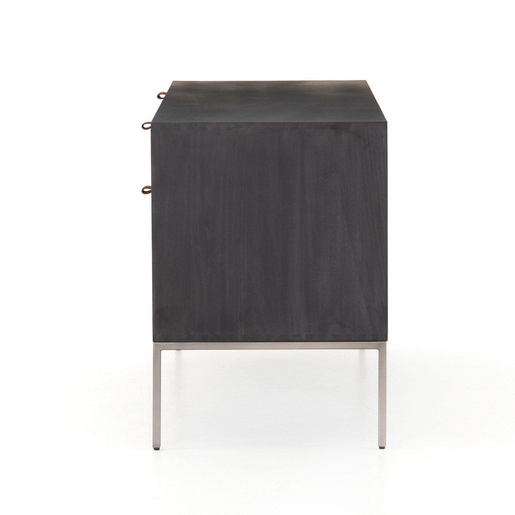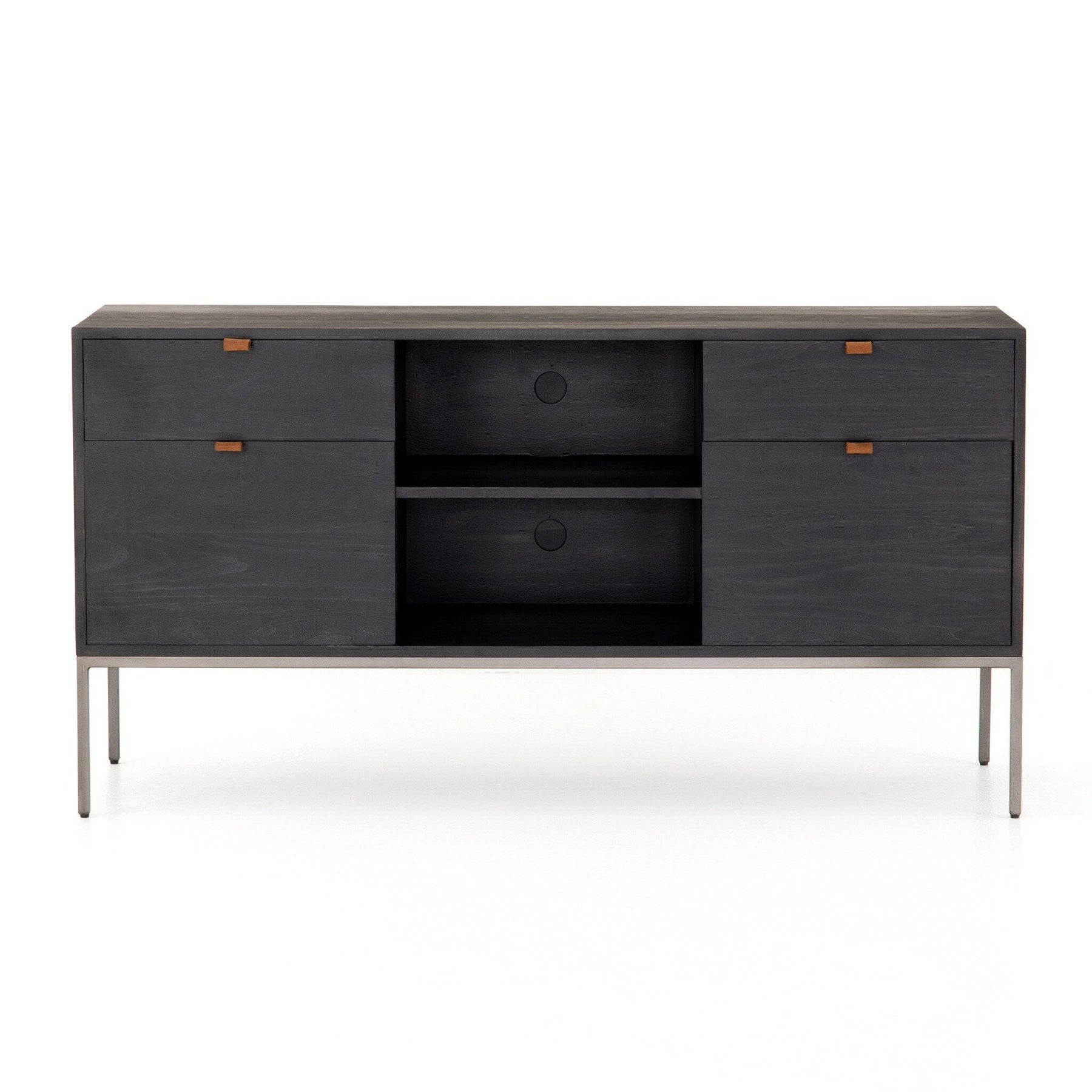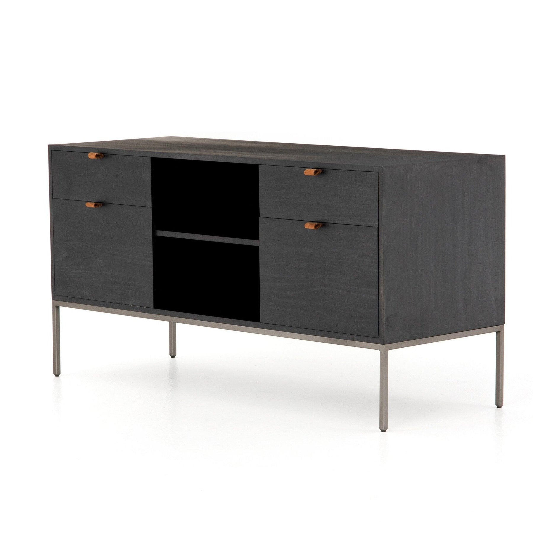 Inspired by clean mid-century design a modular filing credenza of black-finished solid poplar brings roomy storage space to the modern office with a fully finished back plus metal-secured leather pulls for an element of surprise. Great solo or paired with matching desk or filing cabinet.