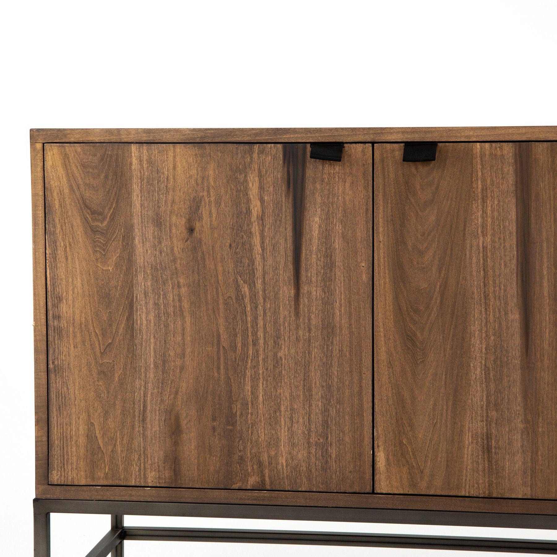 Inspired by clean mid-century design a stylish sideboard of auburn poplar offers plenty of storage space thanks to interior cabinetry and spacious dual drawers. Metal-secured leather pulls add a textural element of surprise.