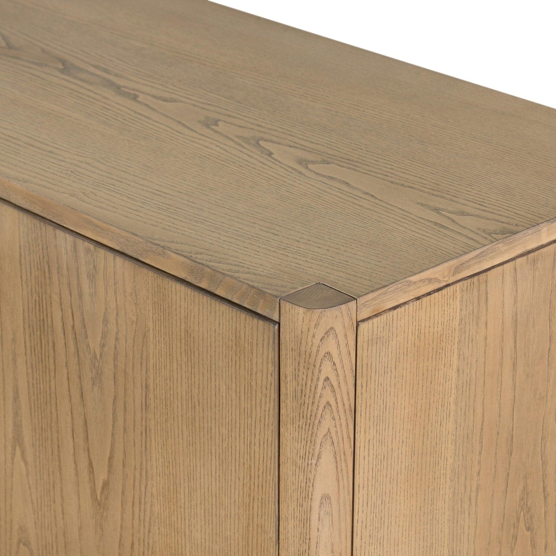 Simple yet refined a Danish design-influenced sideboard is made from solid ash with iron hardware finished in a sleek gunmetal. Stretcher-style shelving made from woven paper cord serves up a textural finishing touch.